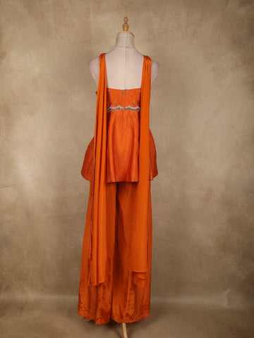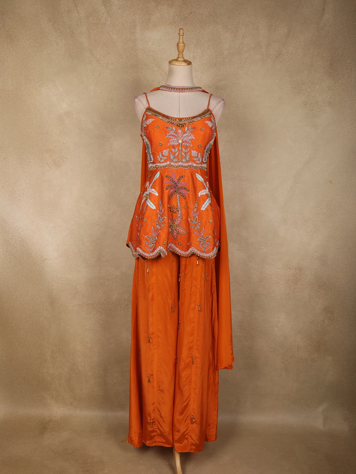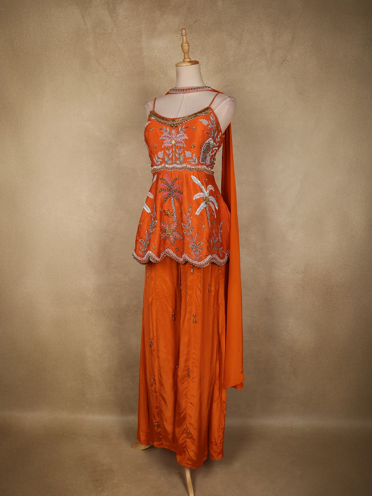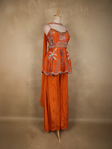 Orange Beads Embroidered Design Semi Tissue Peplum Palazzo Suit