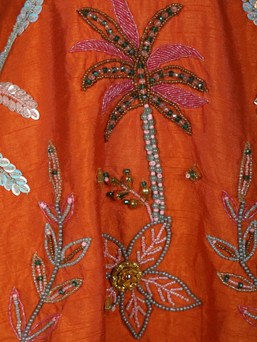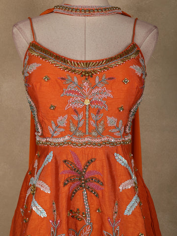 Make a vibrant festive statement with this Orange Beads Embroidered Design Semi Tissue Peplum Palazzo Suit, crafted to exude elegance and contemporary charm. Designed in lustrous semi tissue fabric, this ensemble offers a subtle sheen with a graceful fall, making it perfect for special occasions.