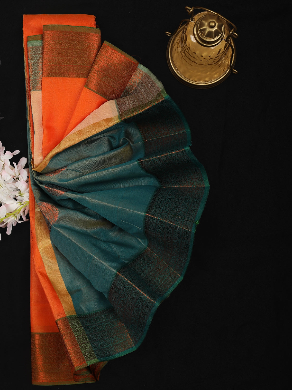 Brighten your ethnic wardrobe with this vibrant Orange Soft Silk Saree, beautifully crafted with traditional butta woven detailing that reflects timeless South Indian artistry. The rich orange body radiates festive warmth, making it an ideal choice for celebrations and auspicious occasions.