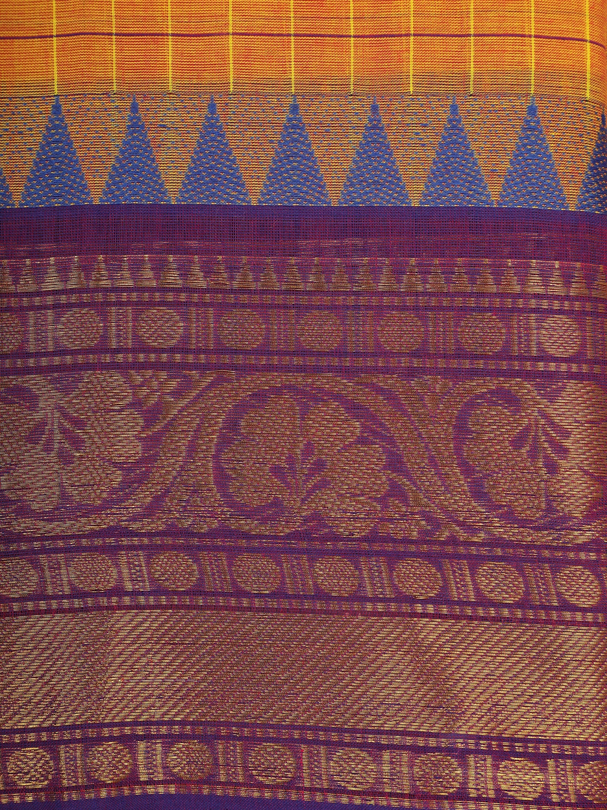 The real showstopper is the luxurious purple zari border, beautifully detailed with traditional floral and geometric designs. Accents of blue temple patterns add a striking edge, making the saree visually rich and perfect for special occasions. Crafted from soft and breathable cotton, it offers both comfort and sophistication — ideal for long celebrations or cultural gatherings.