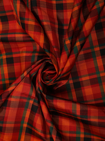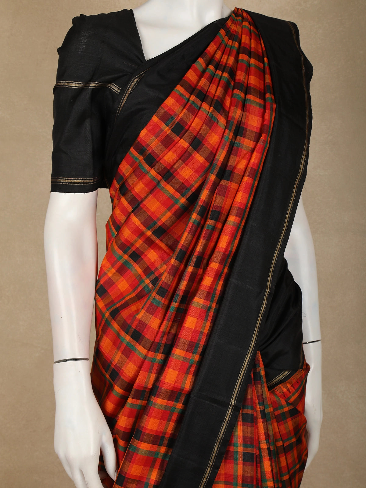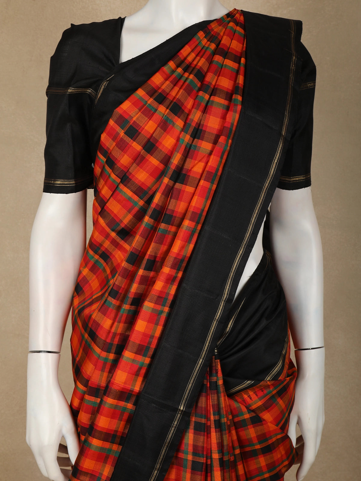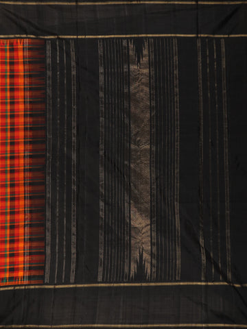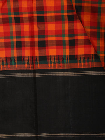 The saree showcases a striking checked (kattam) pattern across the body in vibrant orange tones, lending it a timeless and graceful appeal. Complementing the body is a contrasting black border, subtly enhanced with fine zari lines that add depth and definition to the drape. The pallu, woven in coordination with the border, completes the saree with understated elegance.