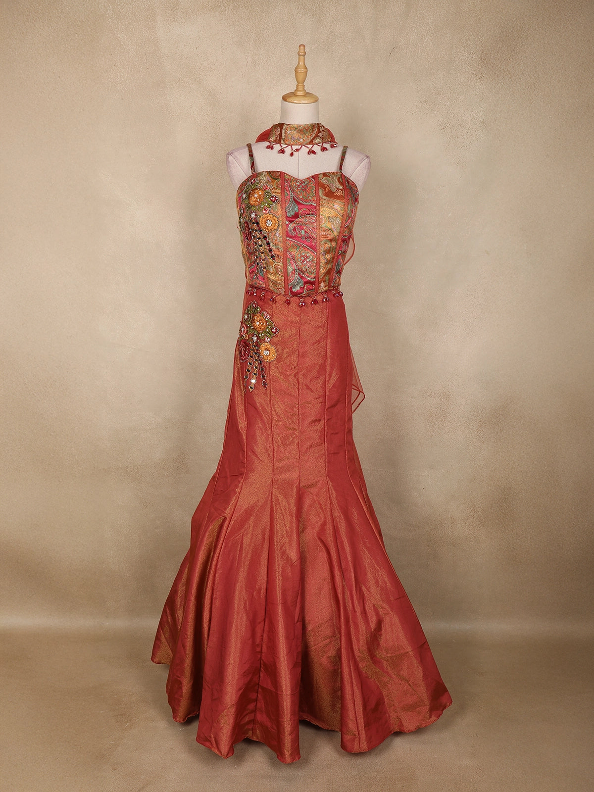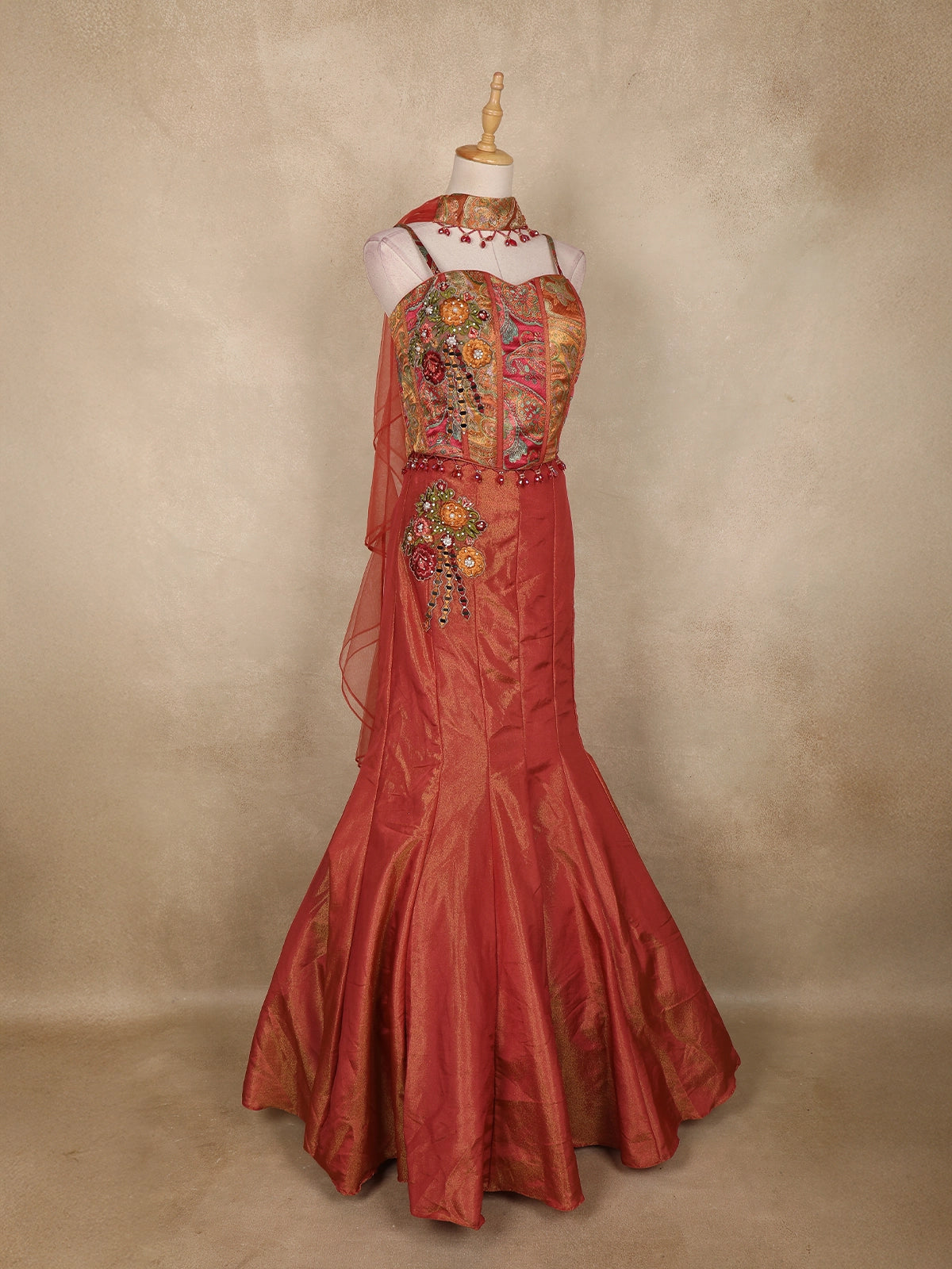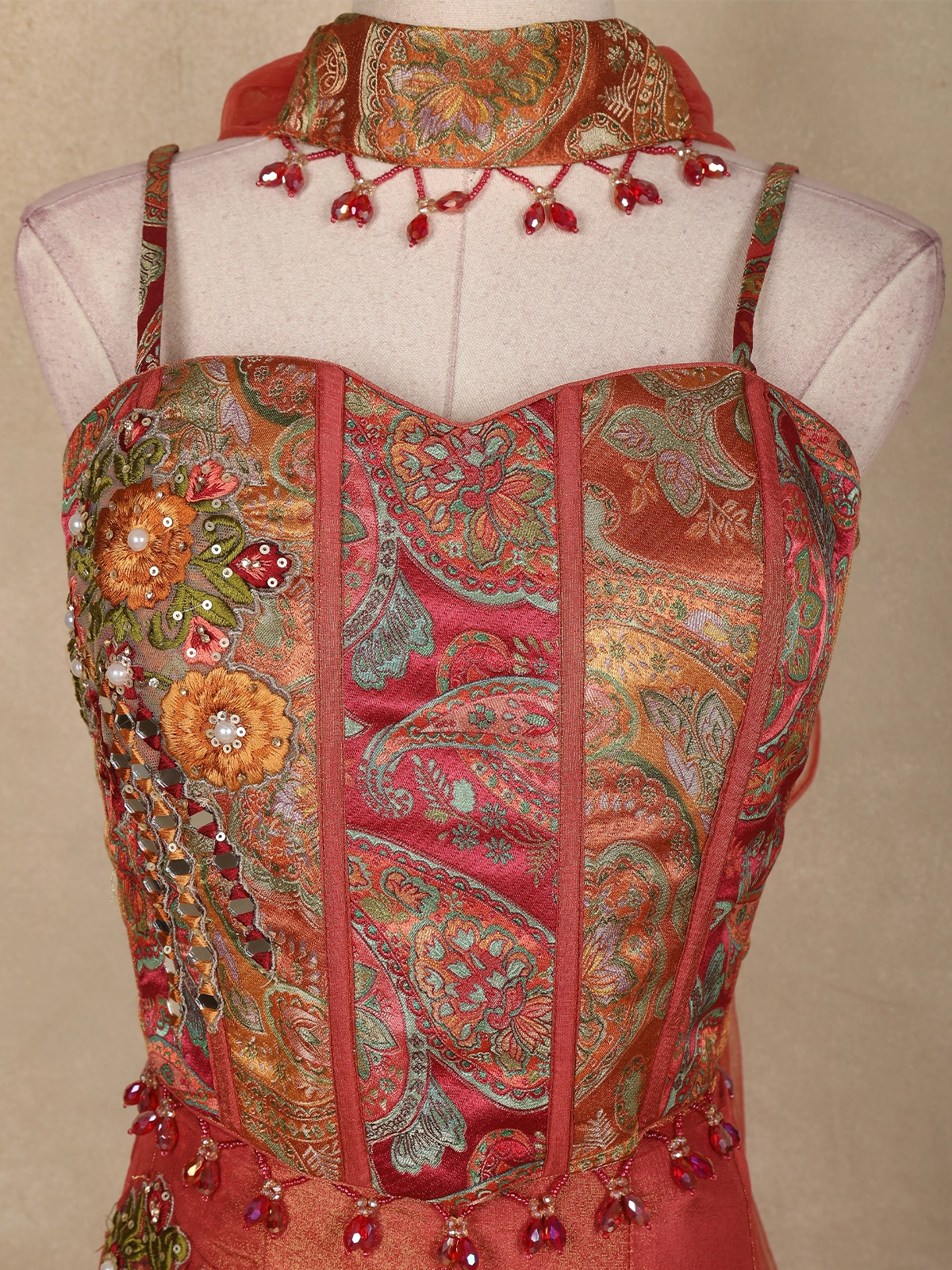 Make a grand entrance with this stunning Indo-Western mermaid style lehenga, designed to bring out your bold and glamorous side. The fitted corset-style bodice features luxurious paisley brocade in rich tones of Orange, red, and green, embellished with floral appliqué, sequins, pearls, and bead detailing.