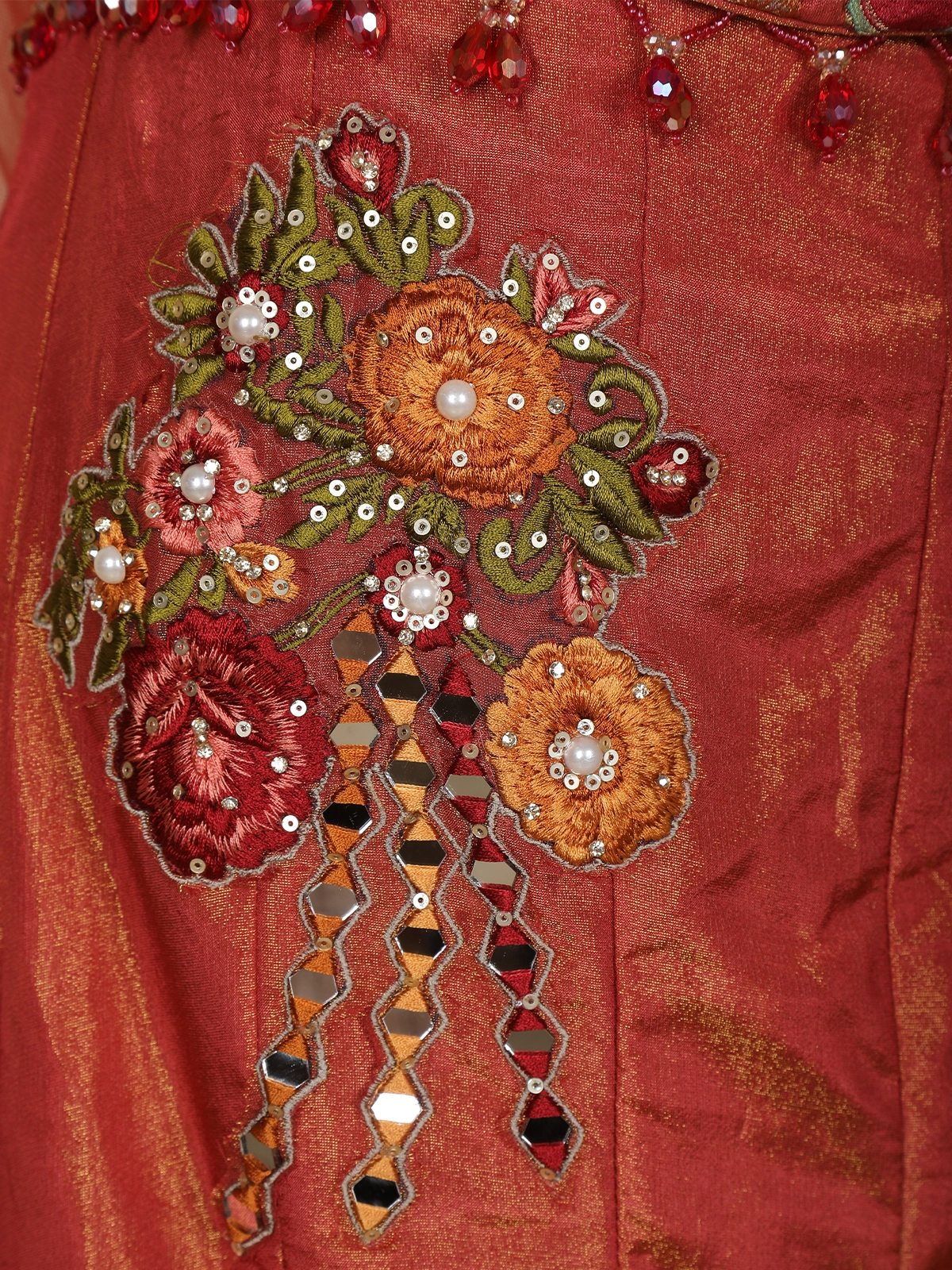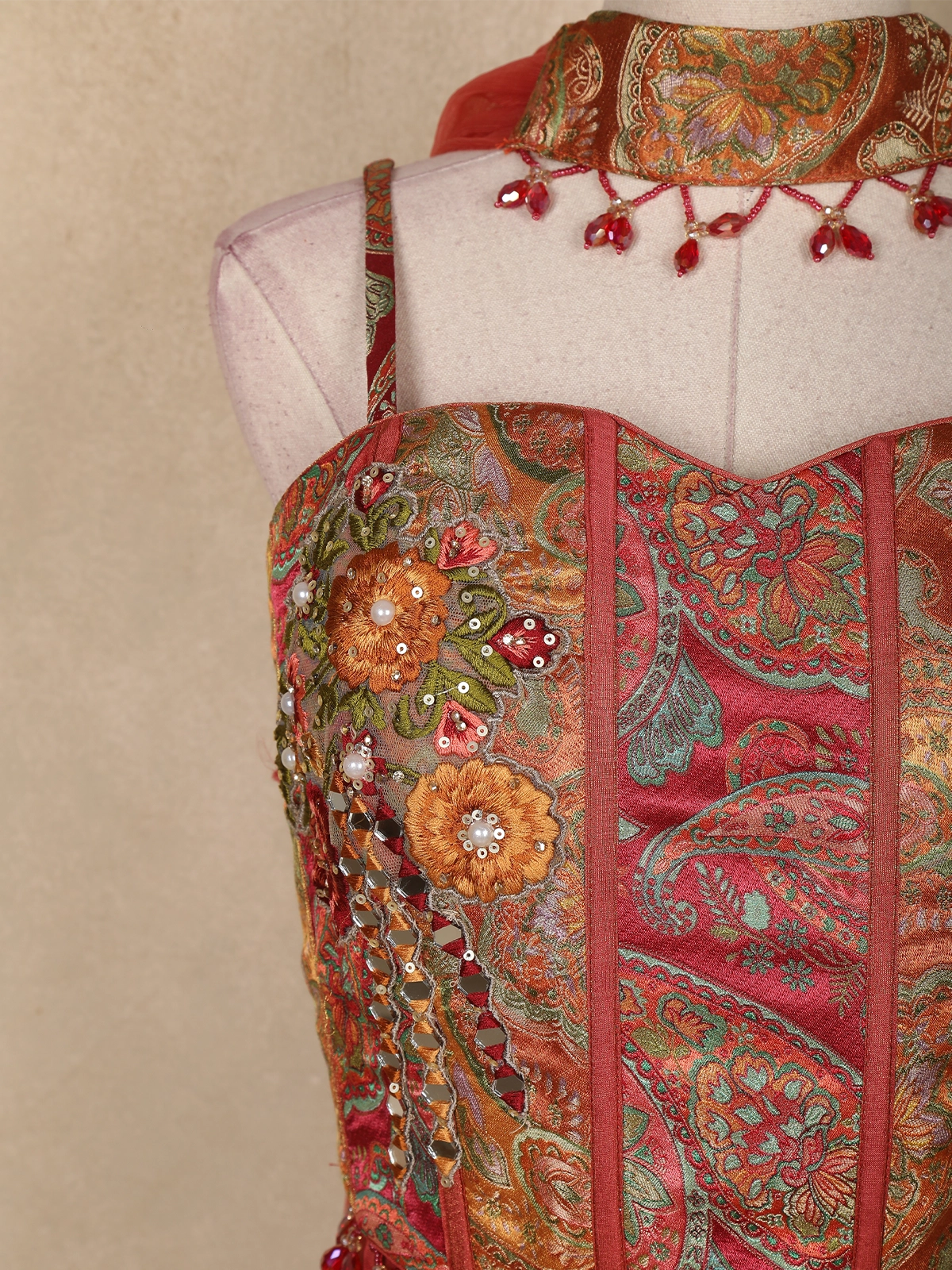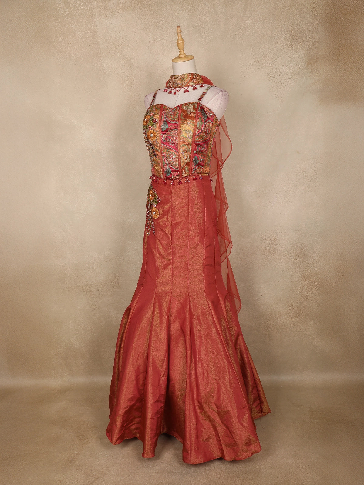 Make a grand entrance with this stunning Indo-Western mermaid style lehenga, designed to bring out your bold and glamorous side. The fitted corset-style bodice features luxurious paisley brocade in rich tones of Orange, red, and green, embellished with floral appliqué, sequins, pearls, and bead detailing.