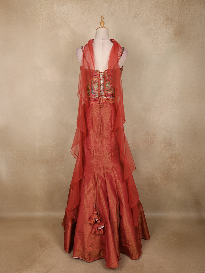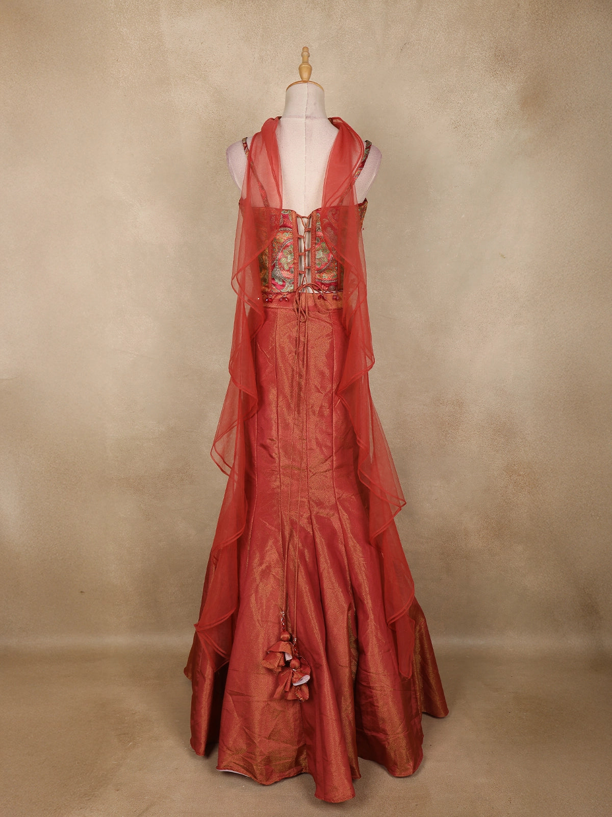 Orange Floral and Paisley Embroidered Mermaid Silk Lehenga