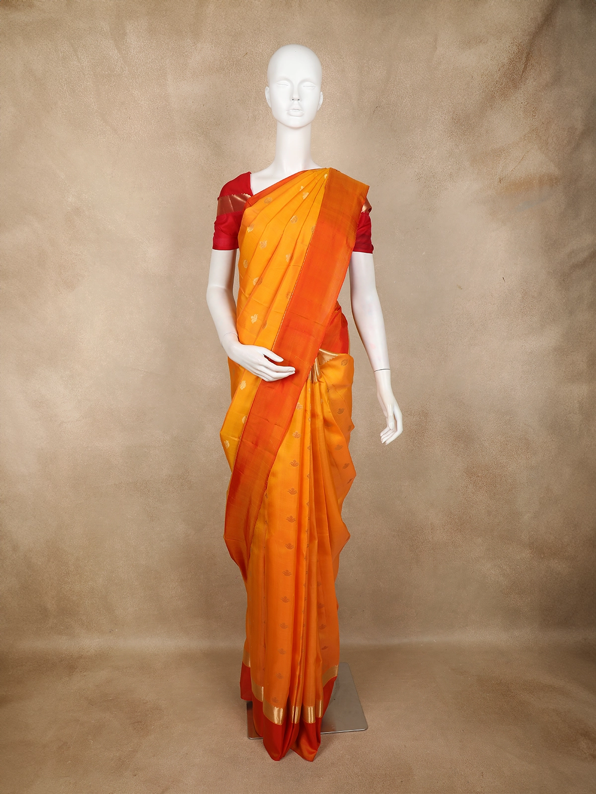 This elegant Pure Kanchipuram Silk Saree comes in a beautiful dual-tone of bright orange and deep red, creating a graceful and festive appeal. The body features small gold zari butta motifs that add a subtle traditional charm without overpowering the saree. The pallu is woven in a rich red tone with intricate zari work, bringing a regal finish to the drape. The gold zari border enhances the richness and adds a perfect festive glow.