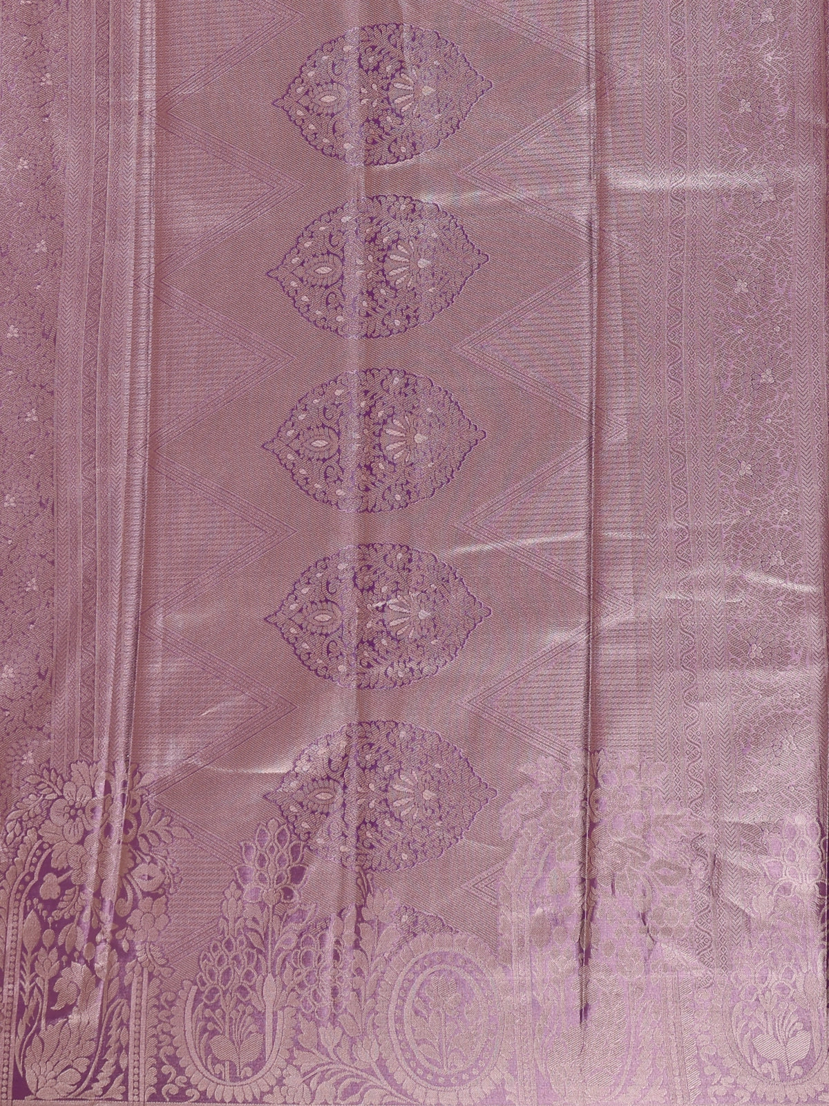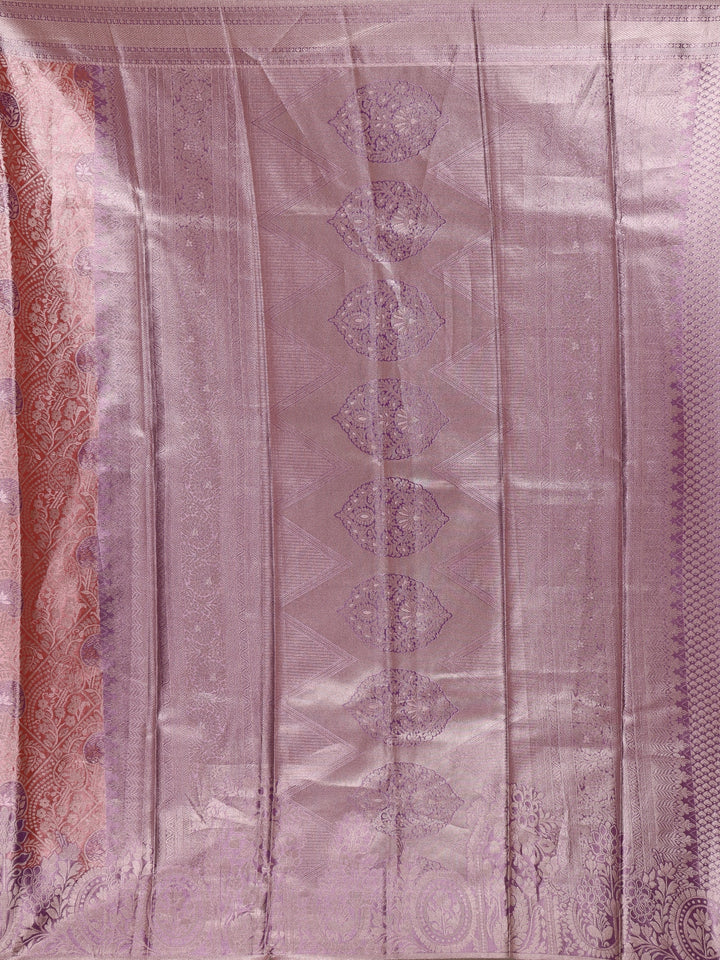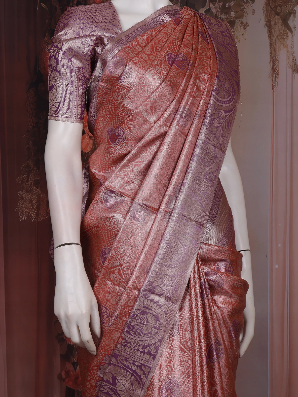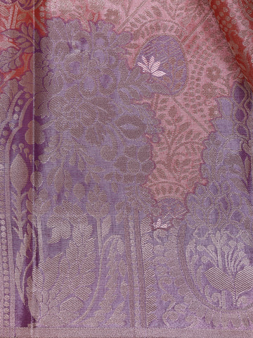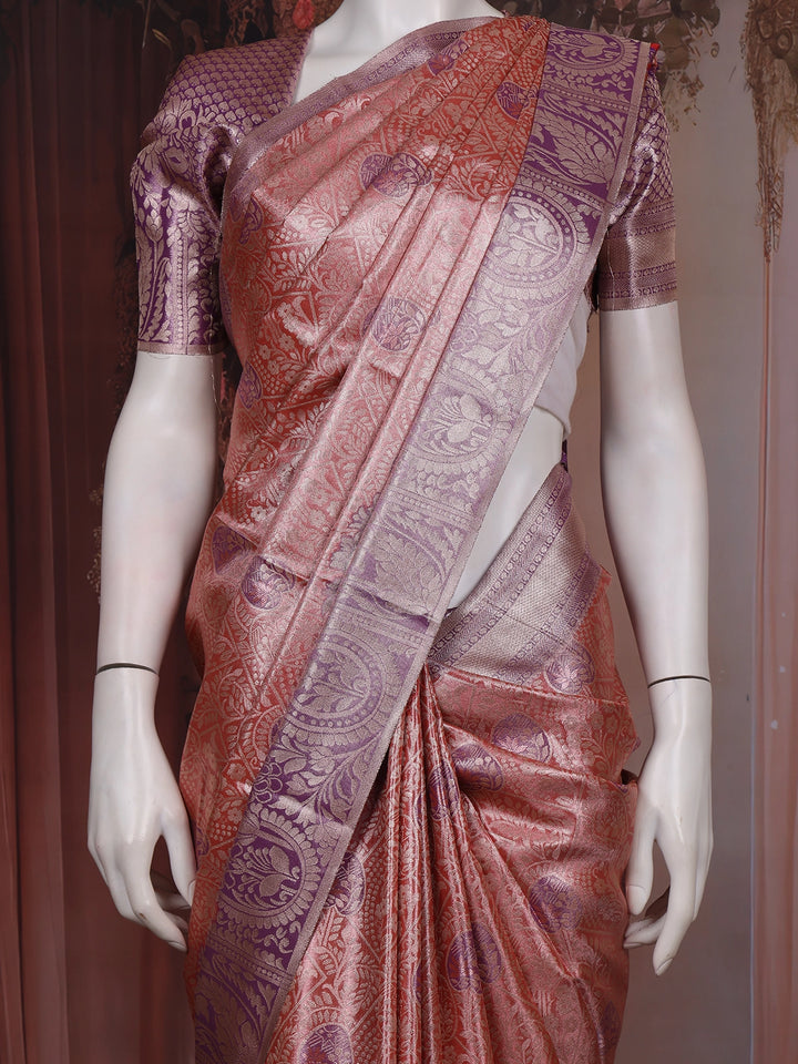The saree is complemented with a contrasting Purple blouse that enhances its vibrant appeal, while the contrasting Purple pallu adds a striking balance of color. The rich Zari border completes the ensemble with a regal touch, infusing traditional grandeur into its contemporary design.