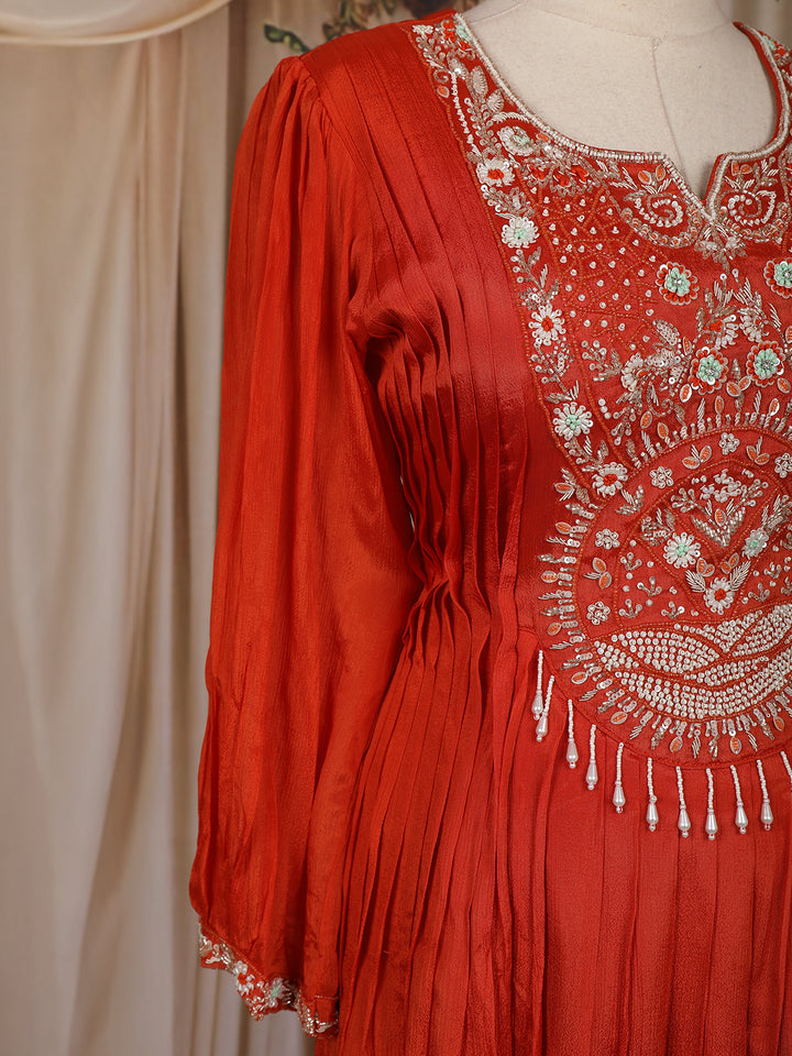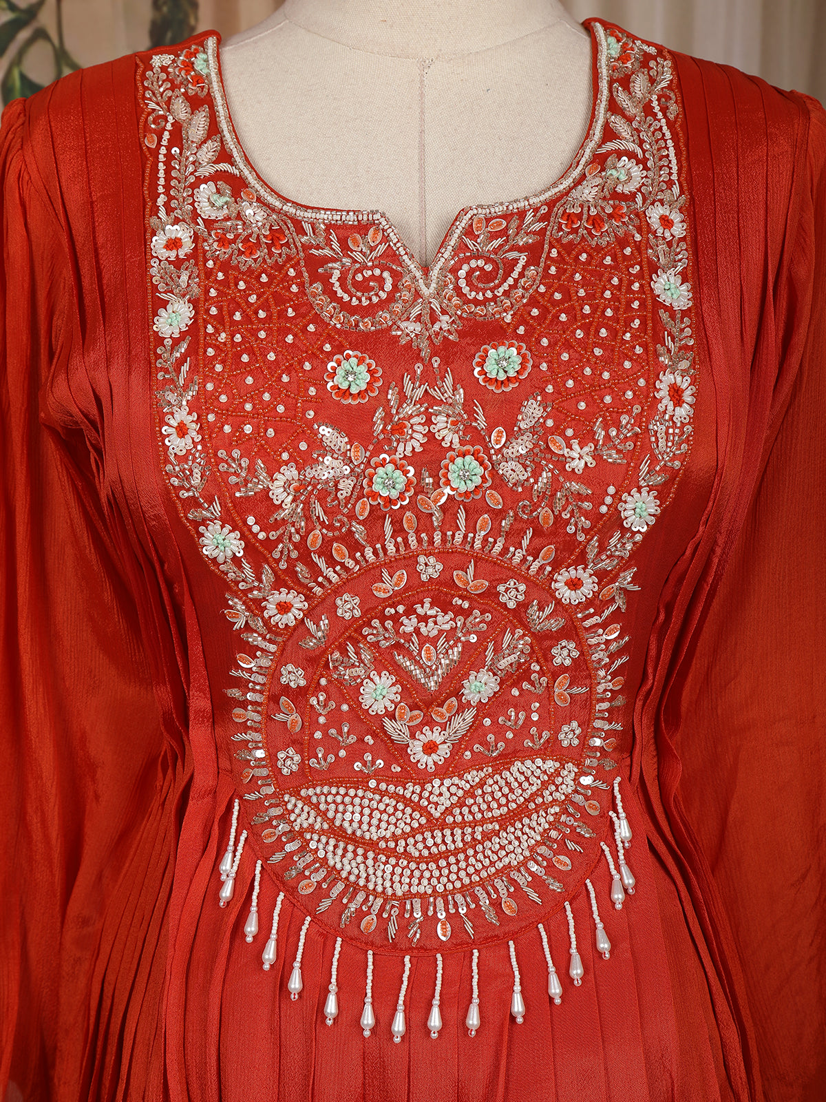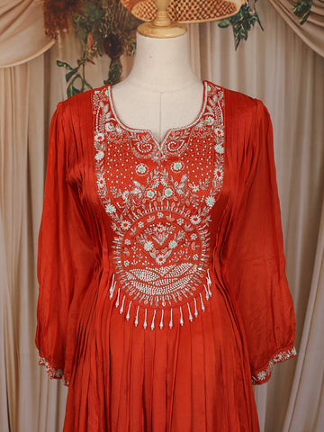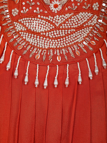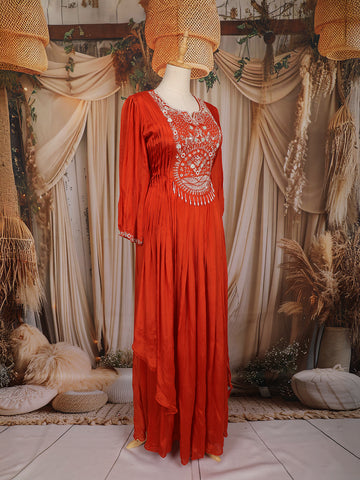 Step into elegance with this vibrant Orange Floral Embroidered Chiffon Gown, crafted to bring grace and charm to every celebration. The gown features exquisite floral embroidery that delicately enhances the soft chiffon fabric, giving it a refined, ethereal look. The flowy silhouette drapes beautifully, ensuring effortless movement and a flattering fit. Designed for both comfort and style, this gown is perfect for parties, festive occasions, and special celebrations.