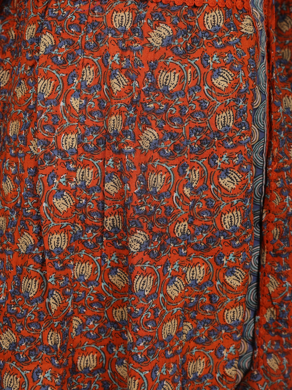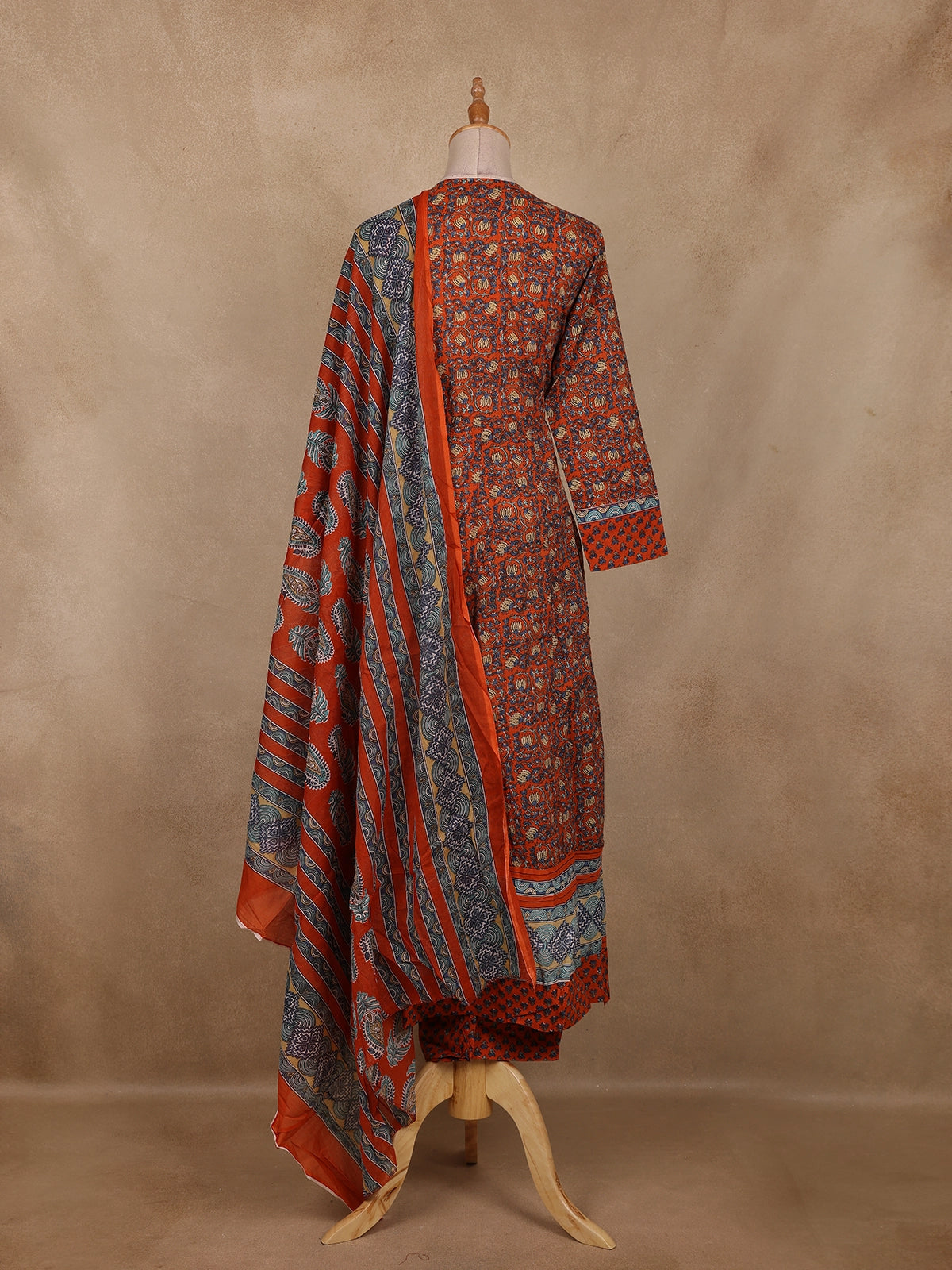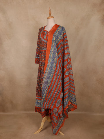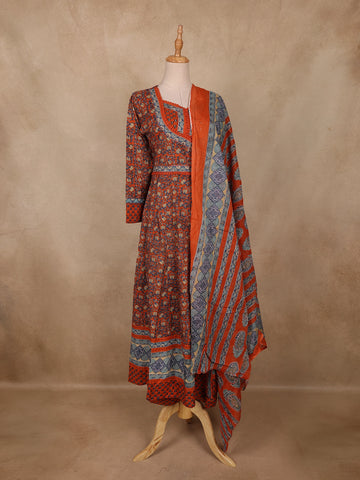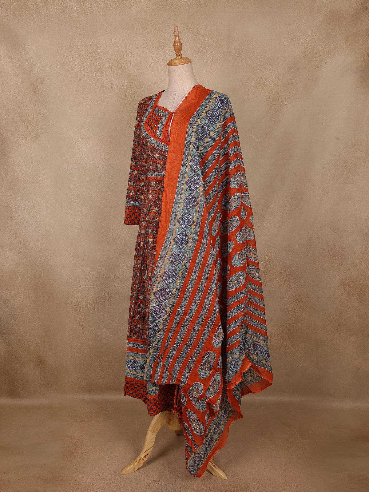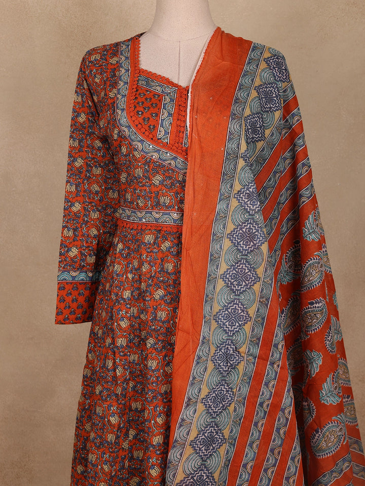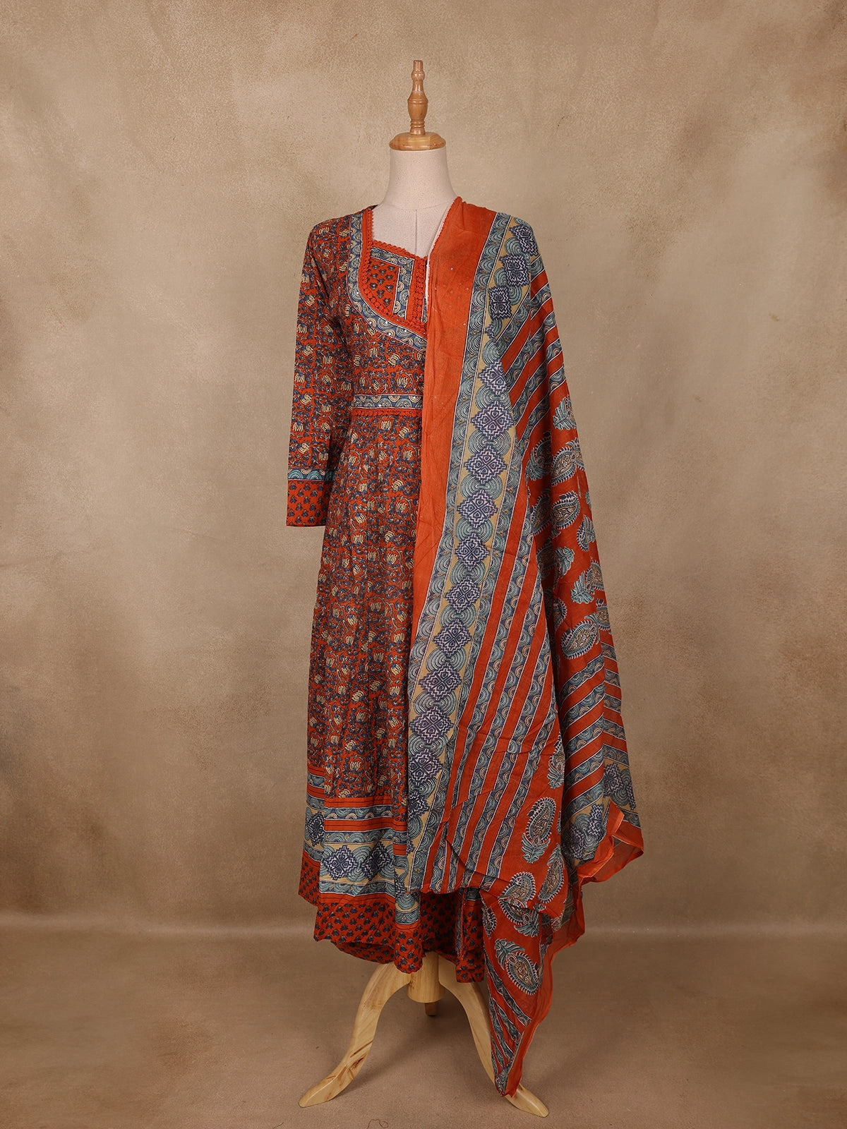 The Anarkali kurta features a fit-and-flare silhouette with all-over intricate floral prints in shades of rust orange, teal, and ivory. The notched round neckline with contrast piping enhances the ethnic appeal, while the full-length sleeves lend a traditional yet modest touch. Complementing the kurta is a printed cotton dupatta with striking striped and paisley designs, paired with matching bottoms to complete the coordinated look.