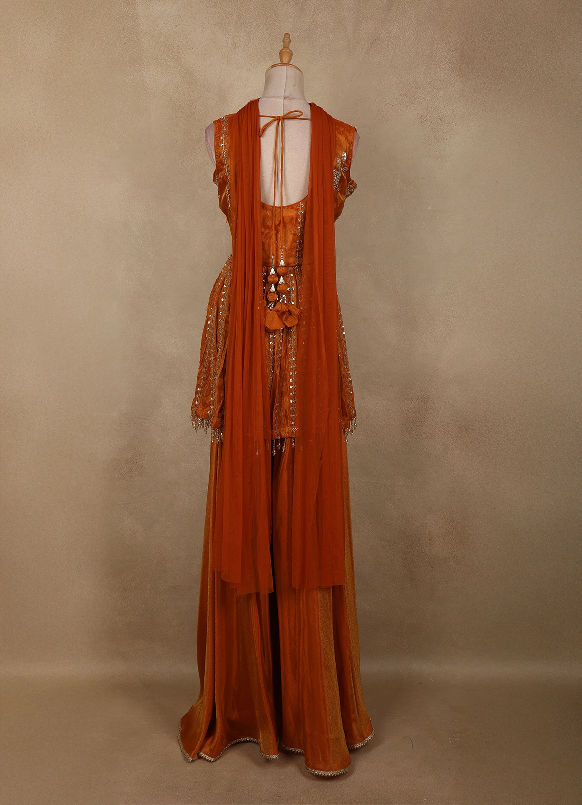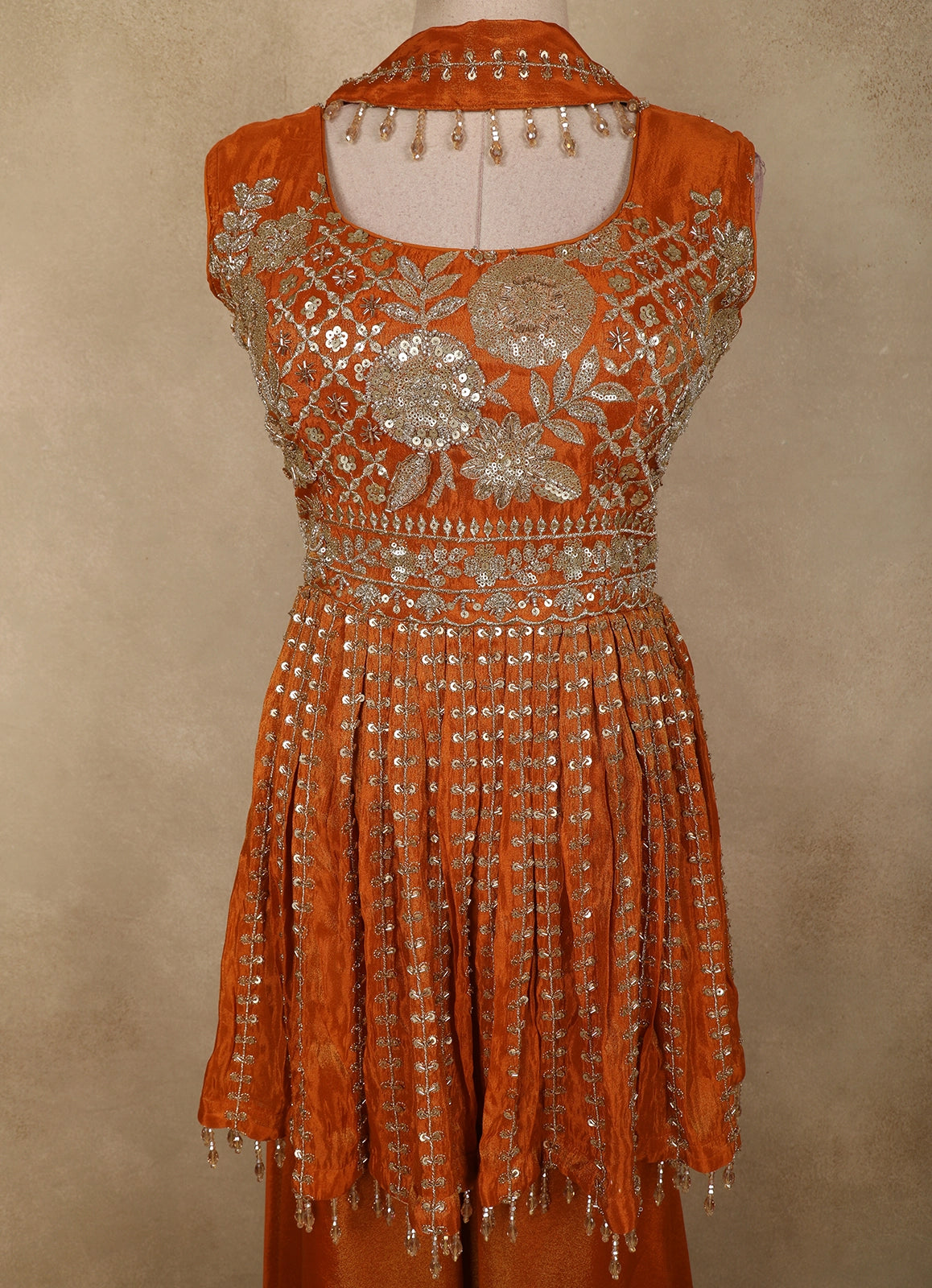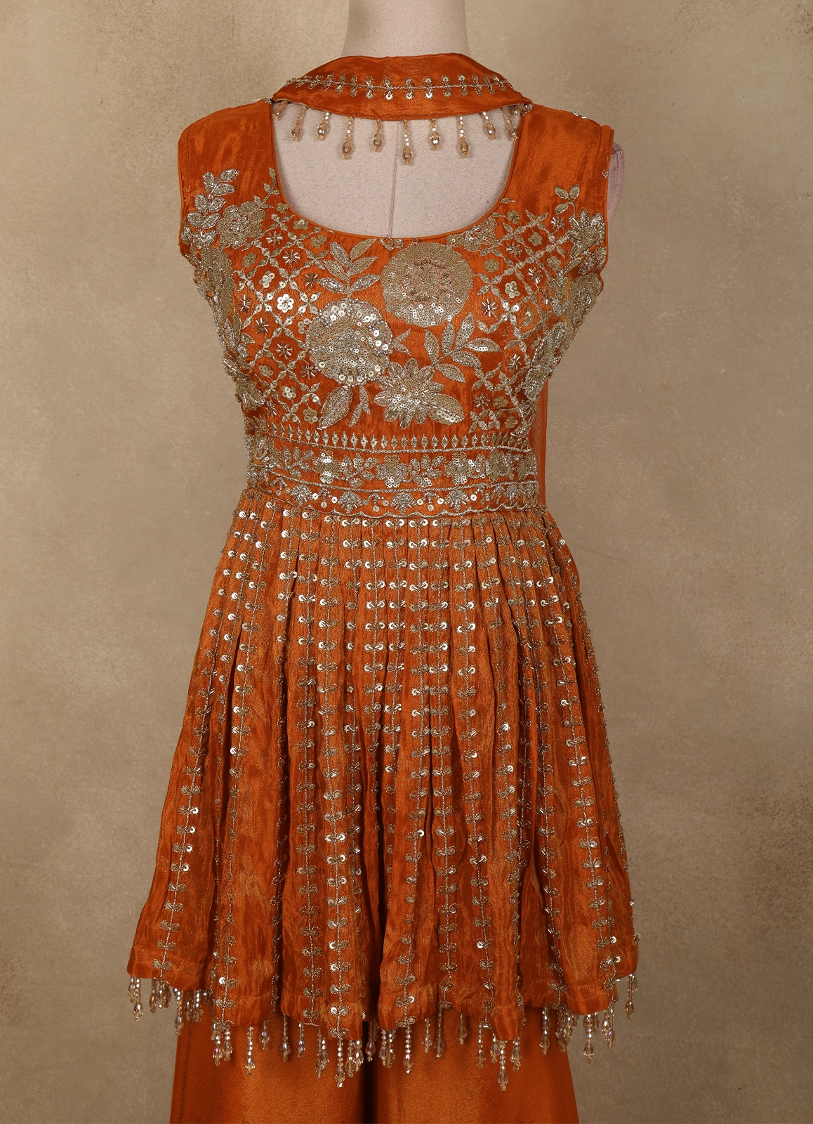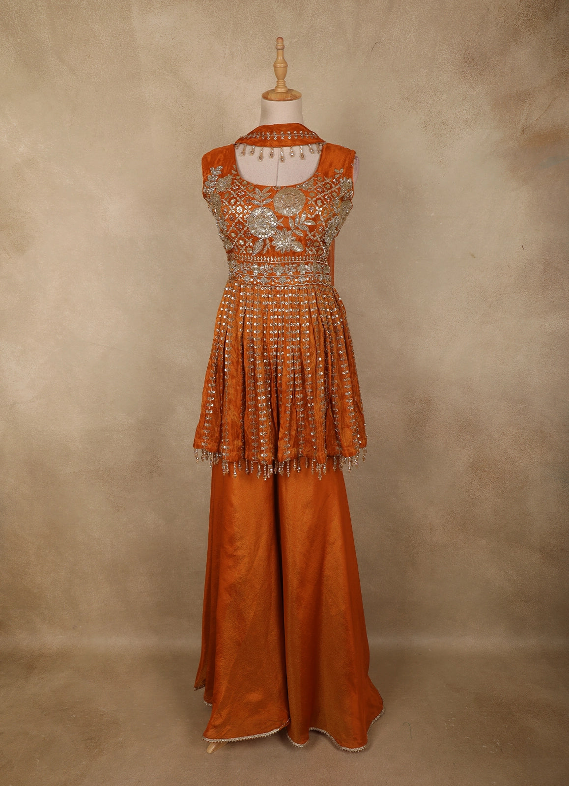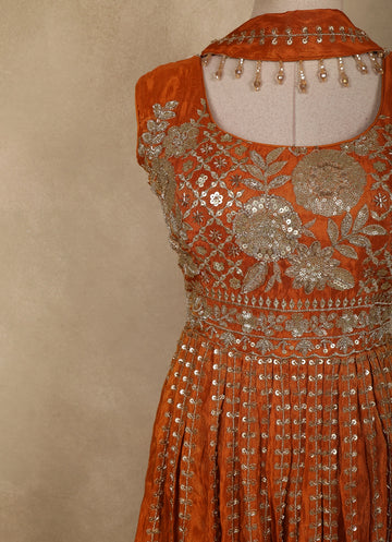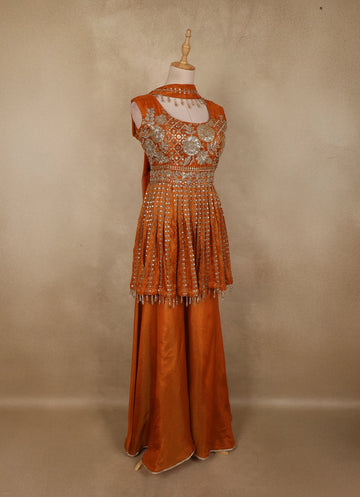 Orange Floral Sequins and Beads Embroidered Design Tissue Peplum Palazzo Suit with Dupatta