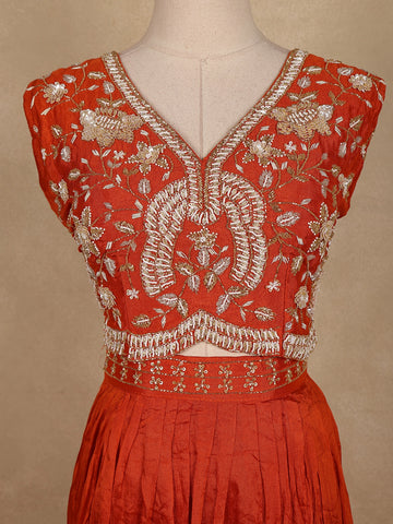 Glow with festive radiance in this Orange Floral Sequins Embroidered Georgette Skirt Top, a perfect harmony of shimmer and sophistication. The outfit features a sleeveless V-neck blouse beautifully detailed with floral embroidery and sequin embellishments, lending a touch of sparkle to your look.