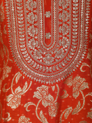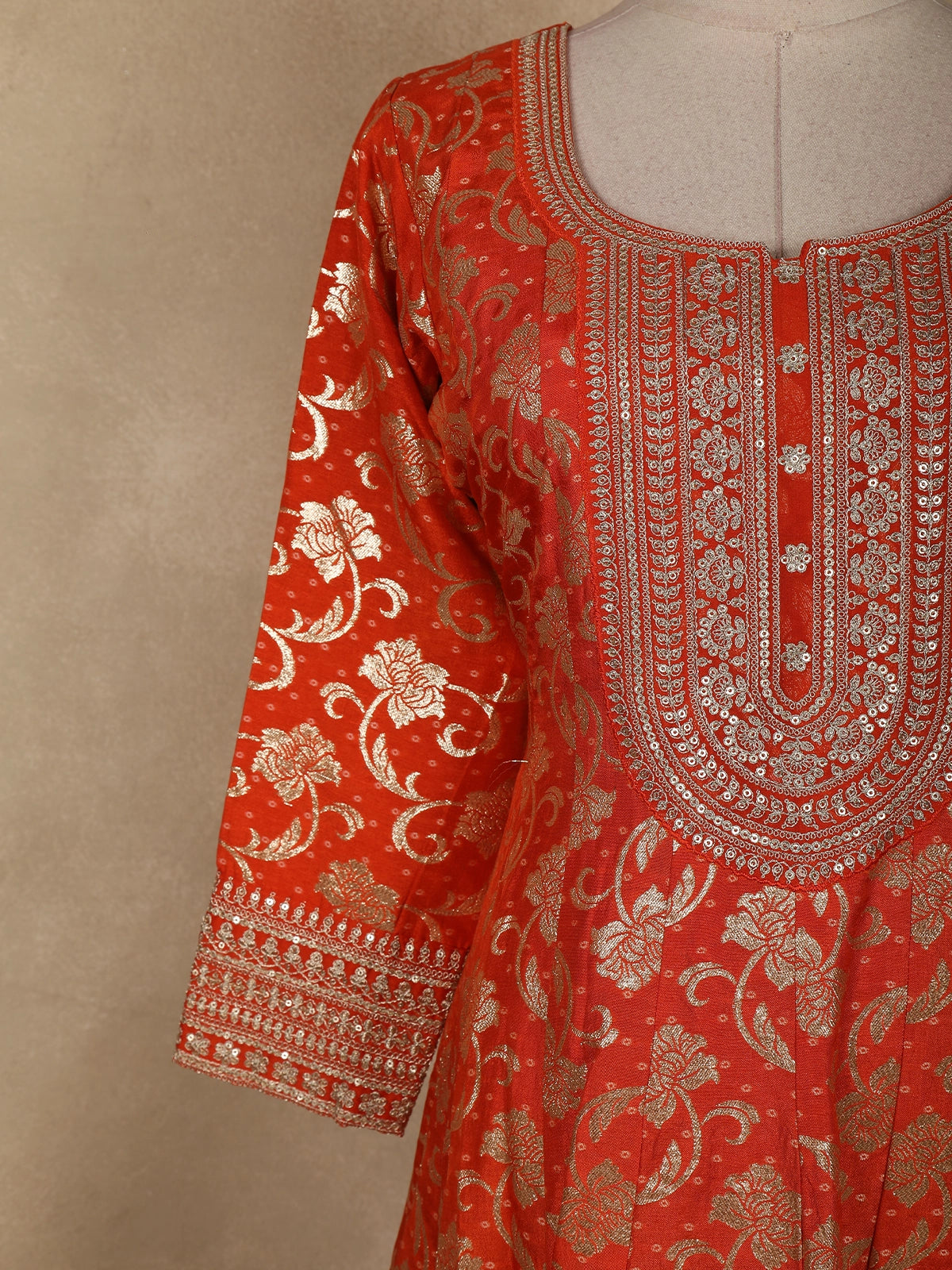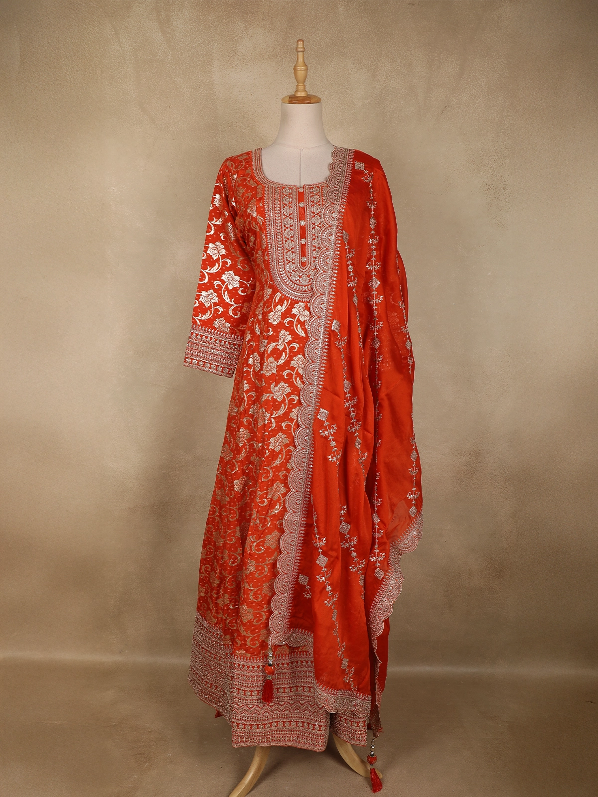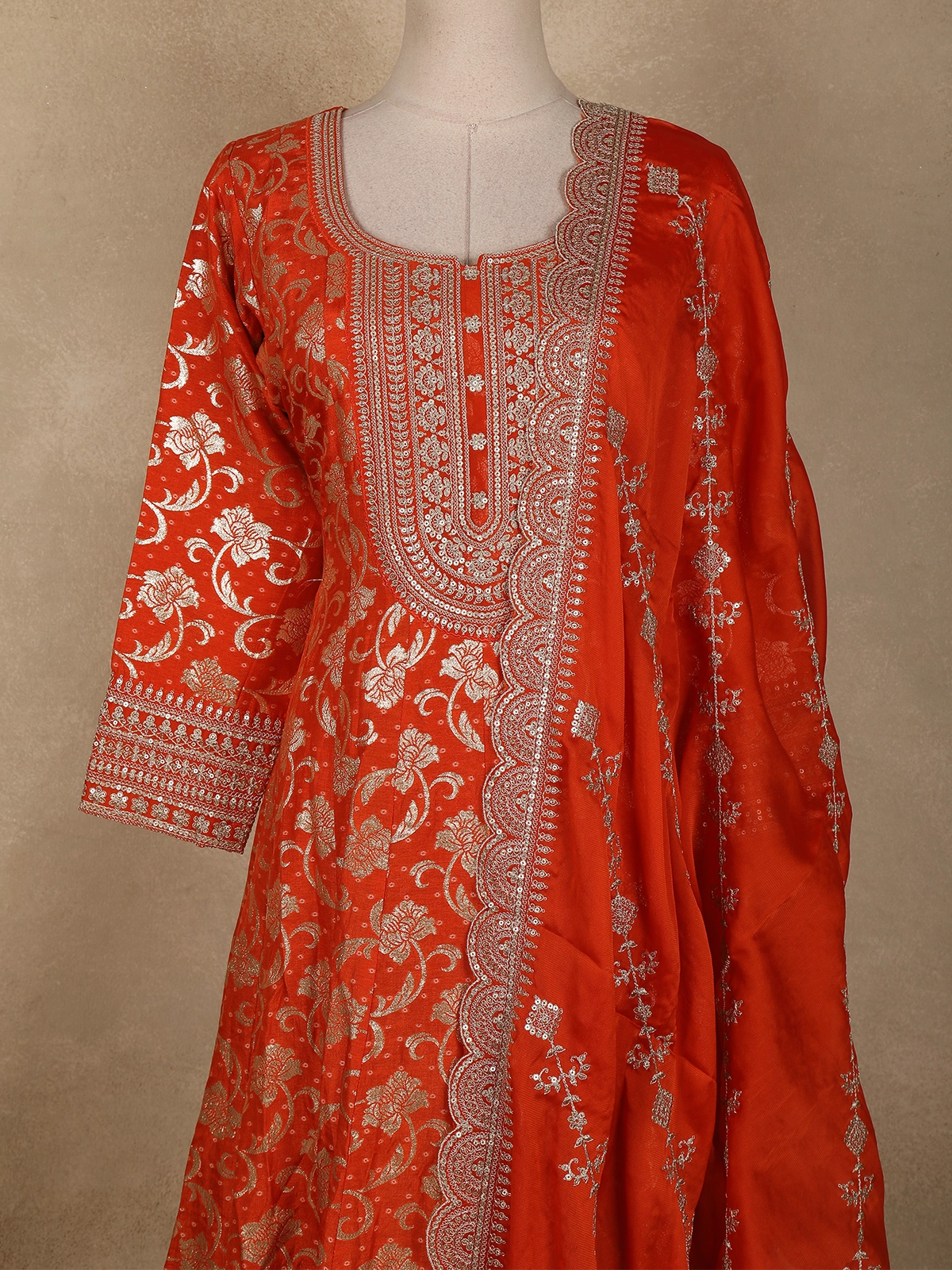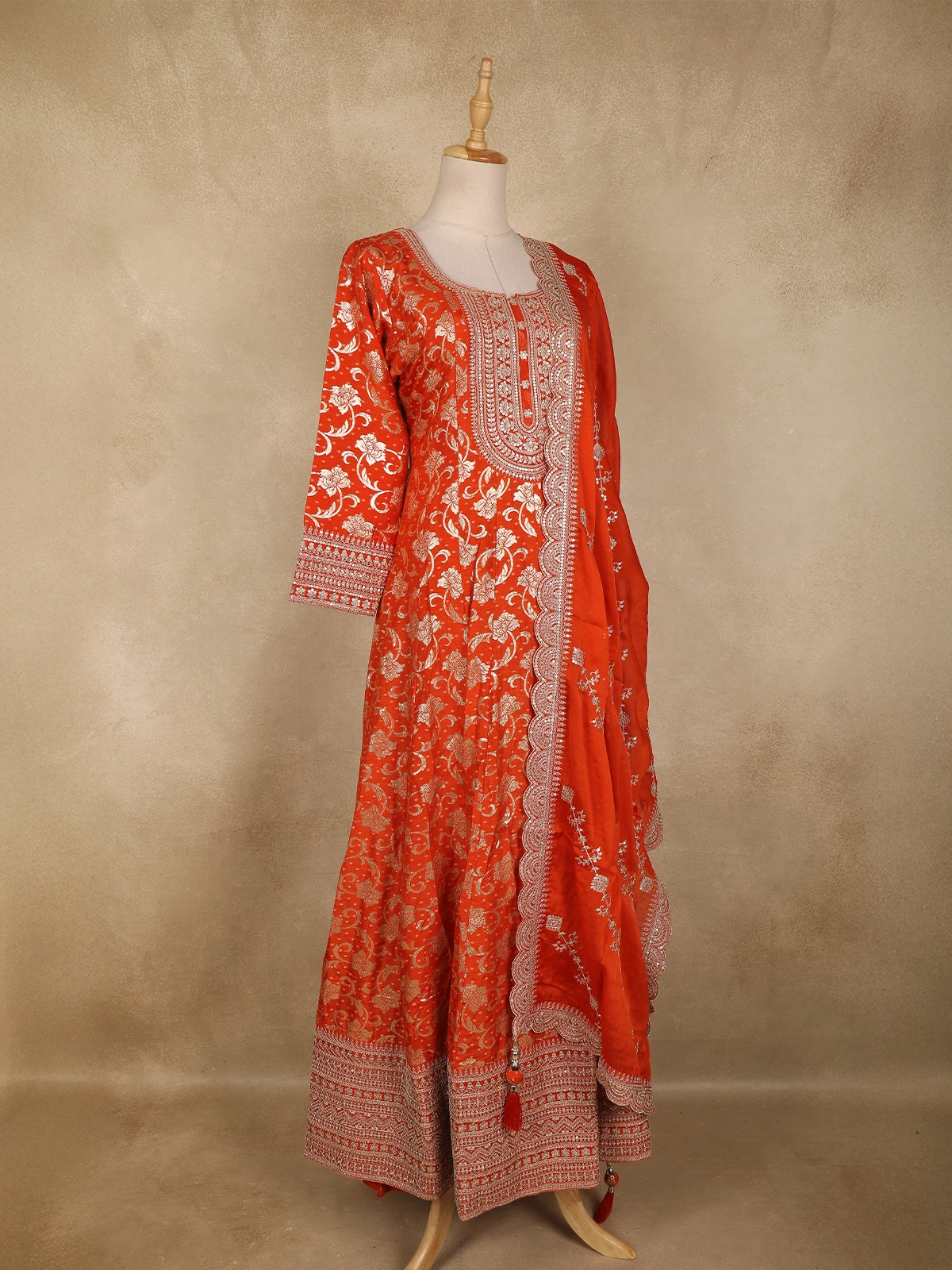 Orange Floral Woven Banarasi Silk Gown with Dupatta