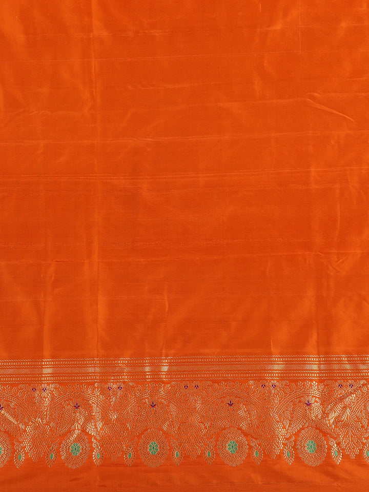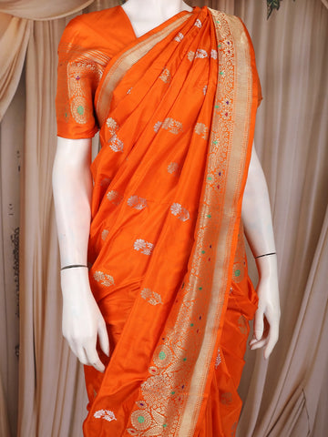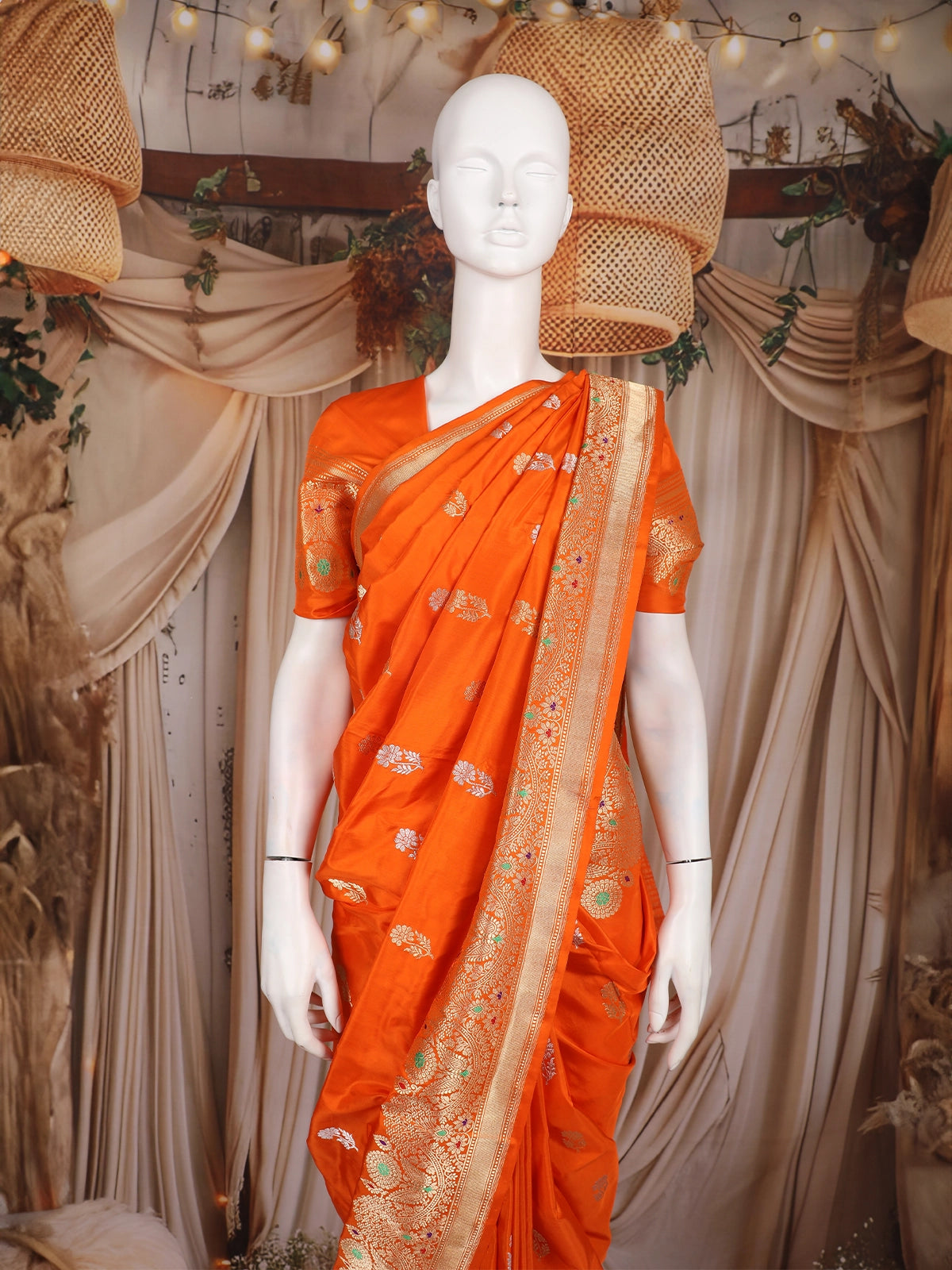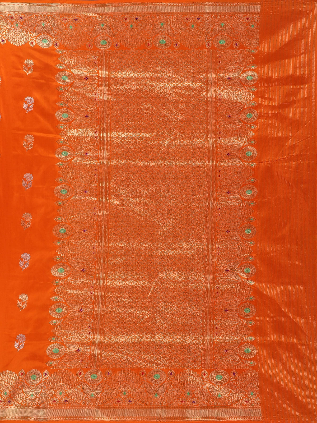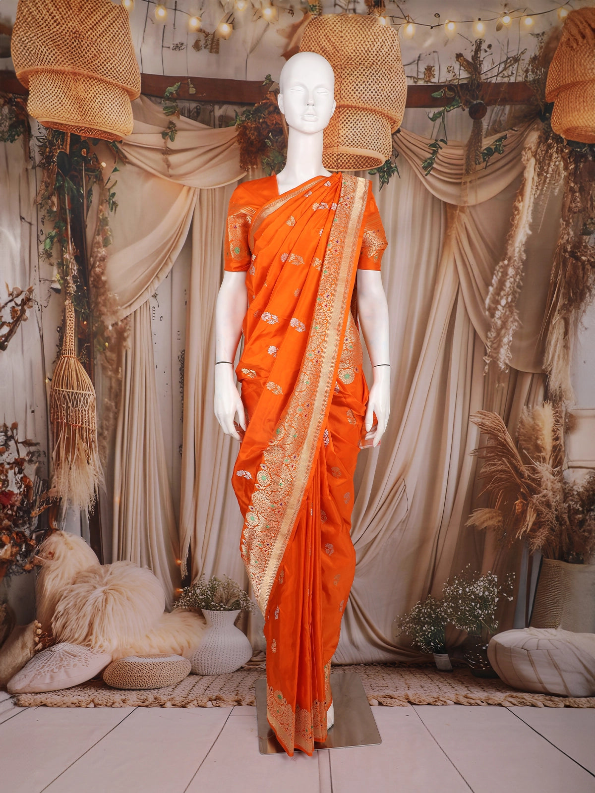 Orange Floral Woven Design Pure Banarasi Silk Saree with Zari Woven Border