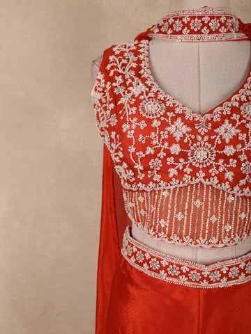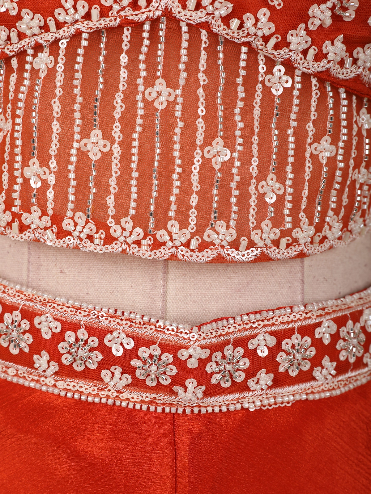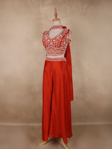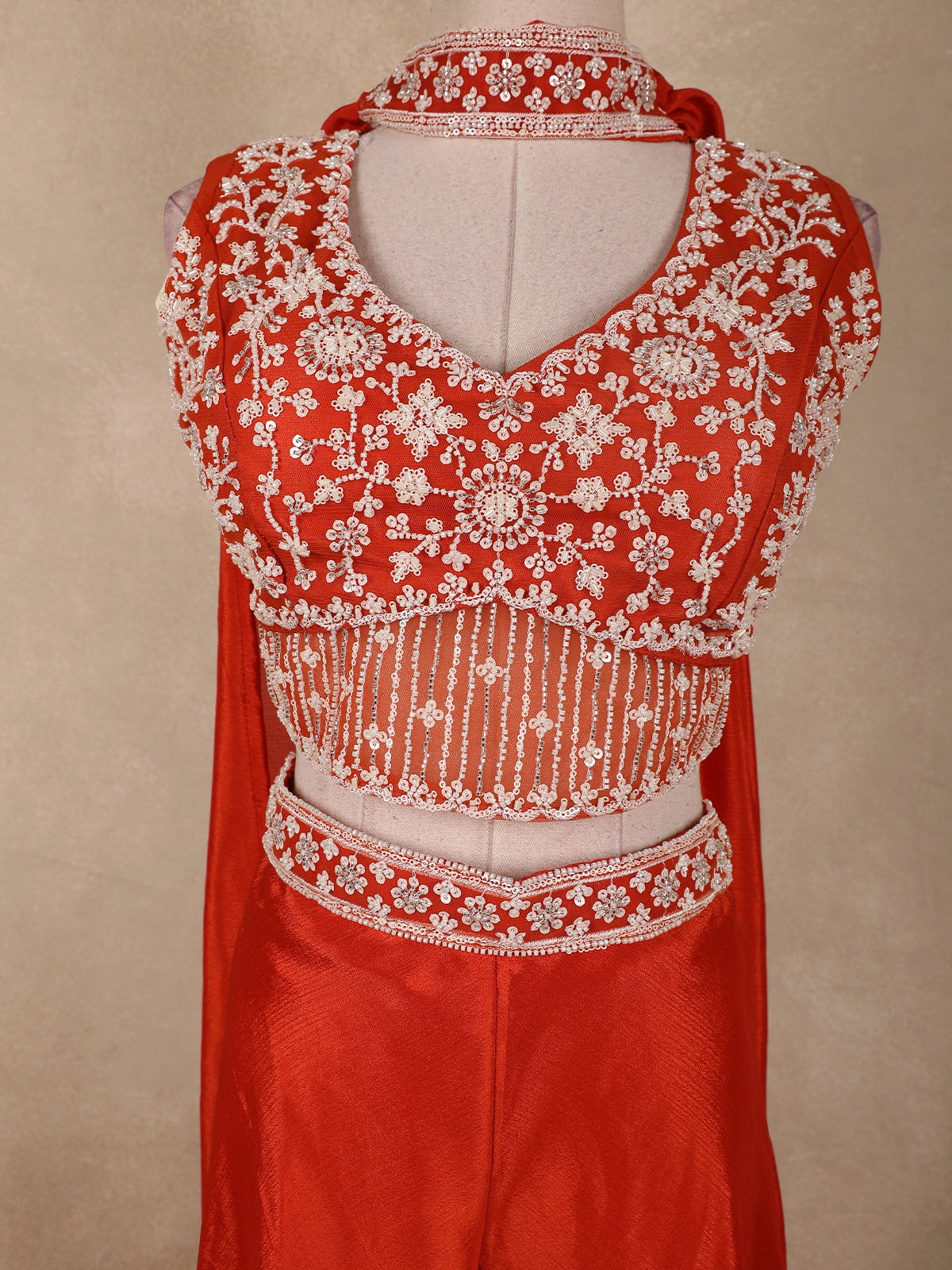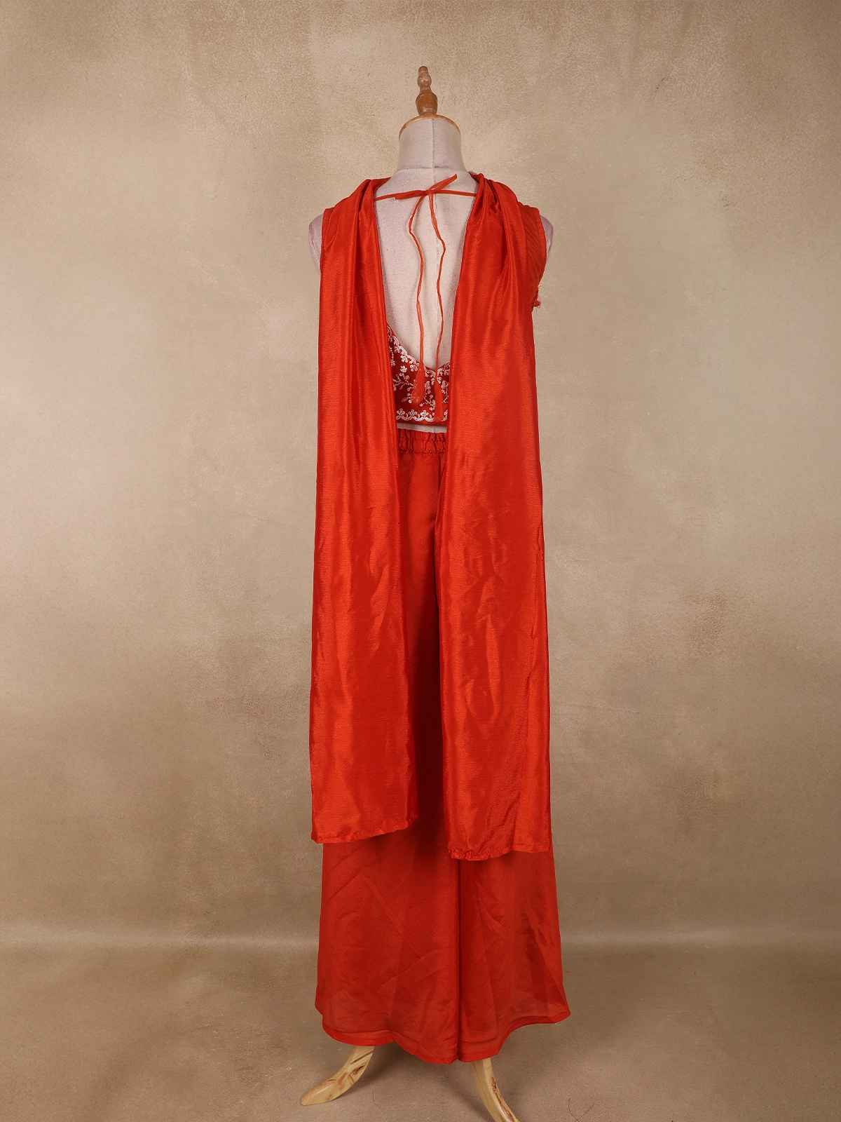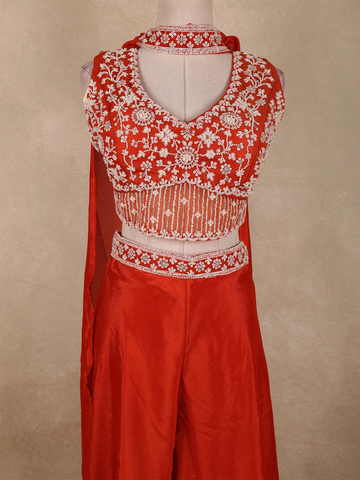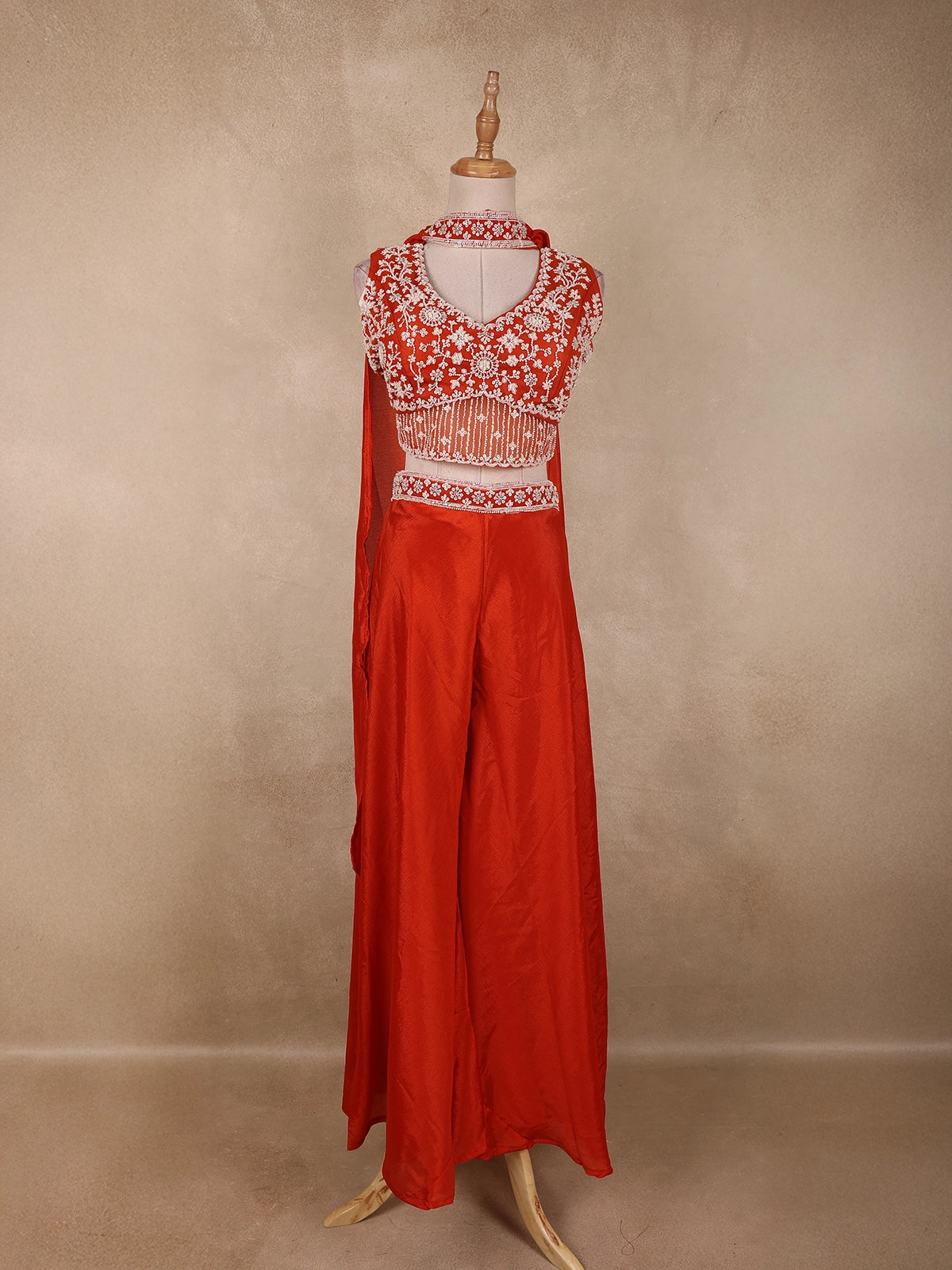 Radiating elegance in a vibrant Orange hue, this stunning georgette palazzo suit is crafted to make a bold yet graceful statement. The ensemble features a beautifully designed cropped kurta-style top, richly adorned with heavy sequins and bead embroidery that form intricate floral patterns across the bodice. The dense embellishment adds a luxurious sparkle, perfectly suited for festive and celebratory occasions.