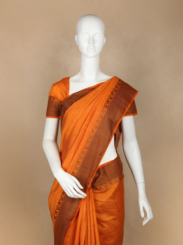 The look is completed with a matching orange blouse and pallu, creating a cohesive and sophisticated silhouette. A finely designed border frames the saree, adding just the right touch of refinement and detail without overpowering its simplicity.