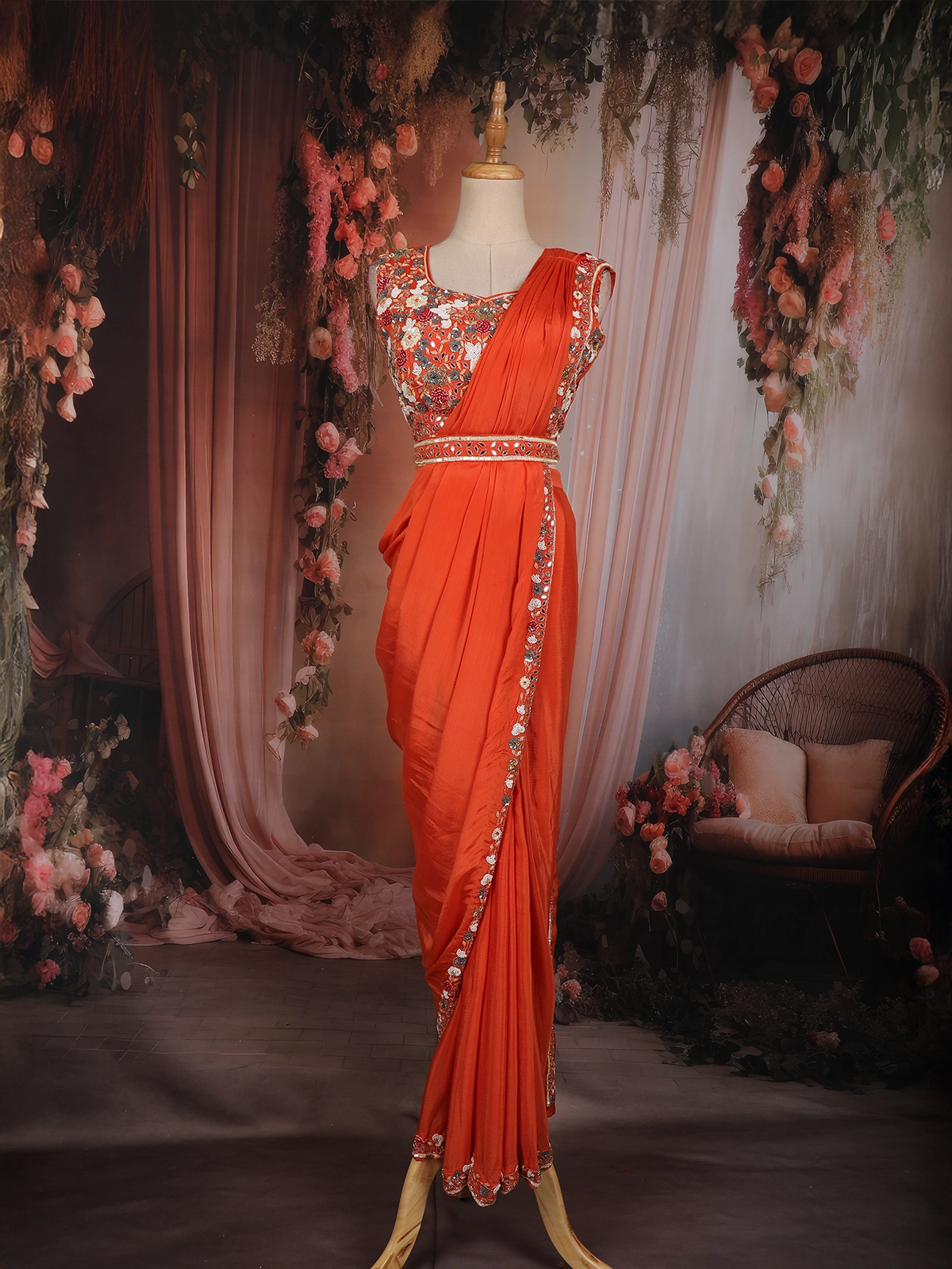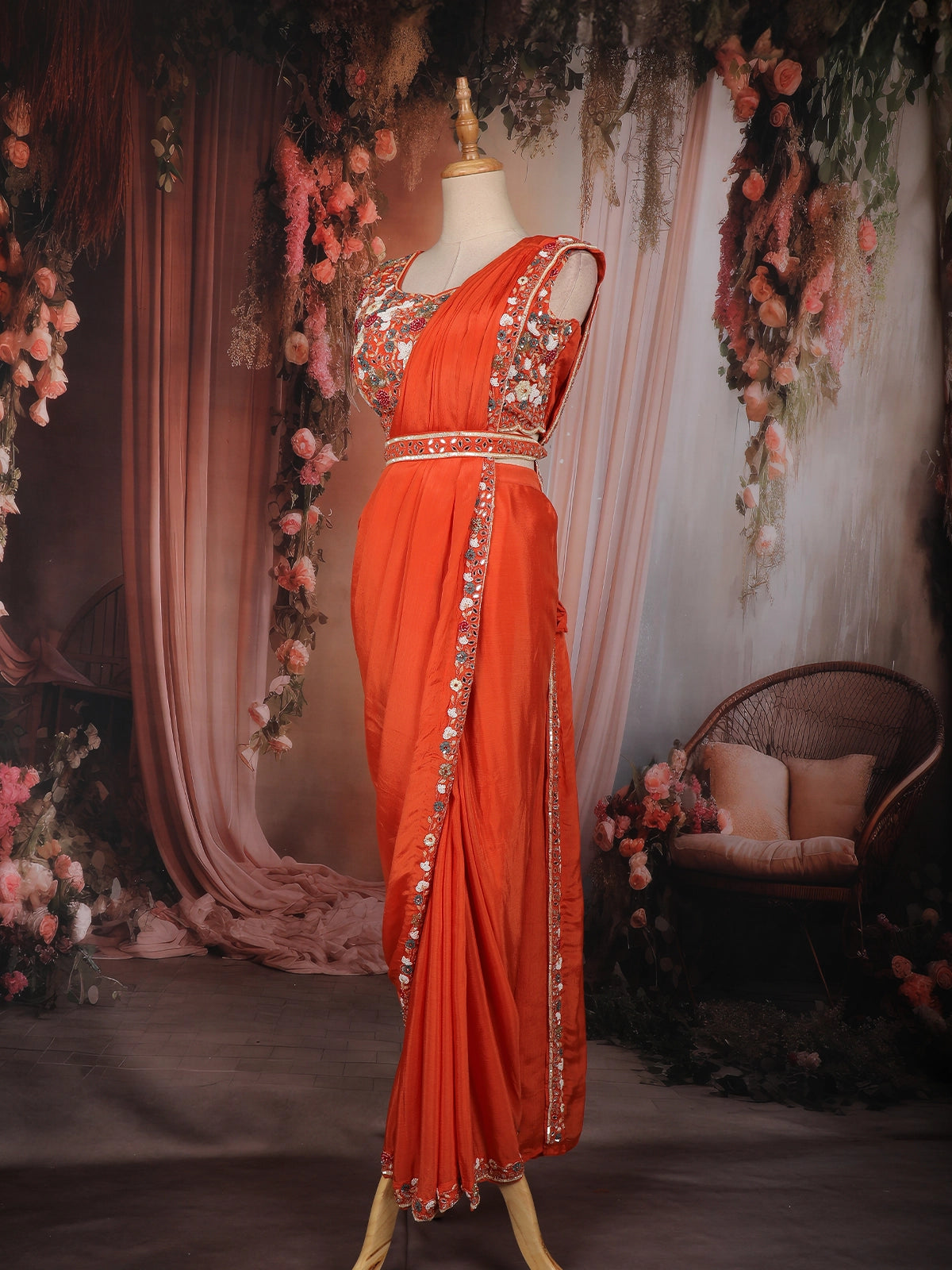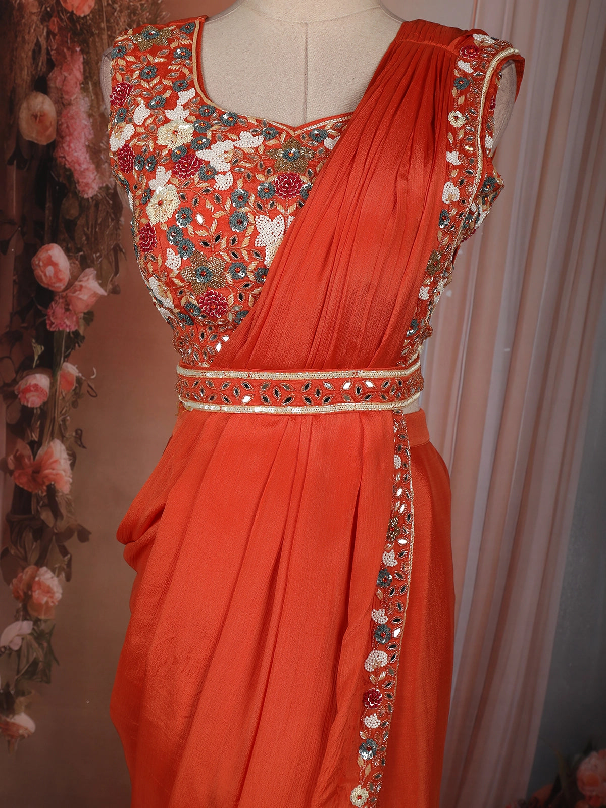 The blouse is richly adorned with intricate sequins and bead embroidery, highlighted with delicate floral motifs that add depth and shimmer to the look. An embellished waistband accentuates the waist, while the asymmetrical drape creates a flattering, saree-inspired appeal. The flowing skirt completes the ensemble with a soft, fluid fall that moves effortlessly with every step.