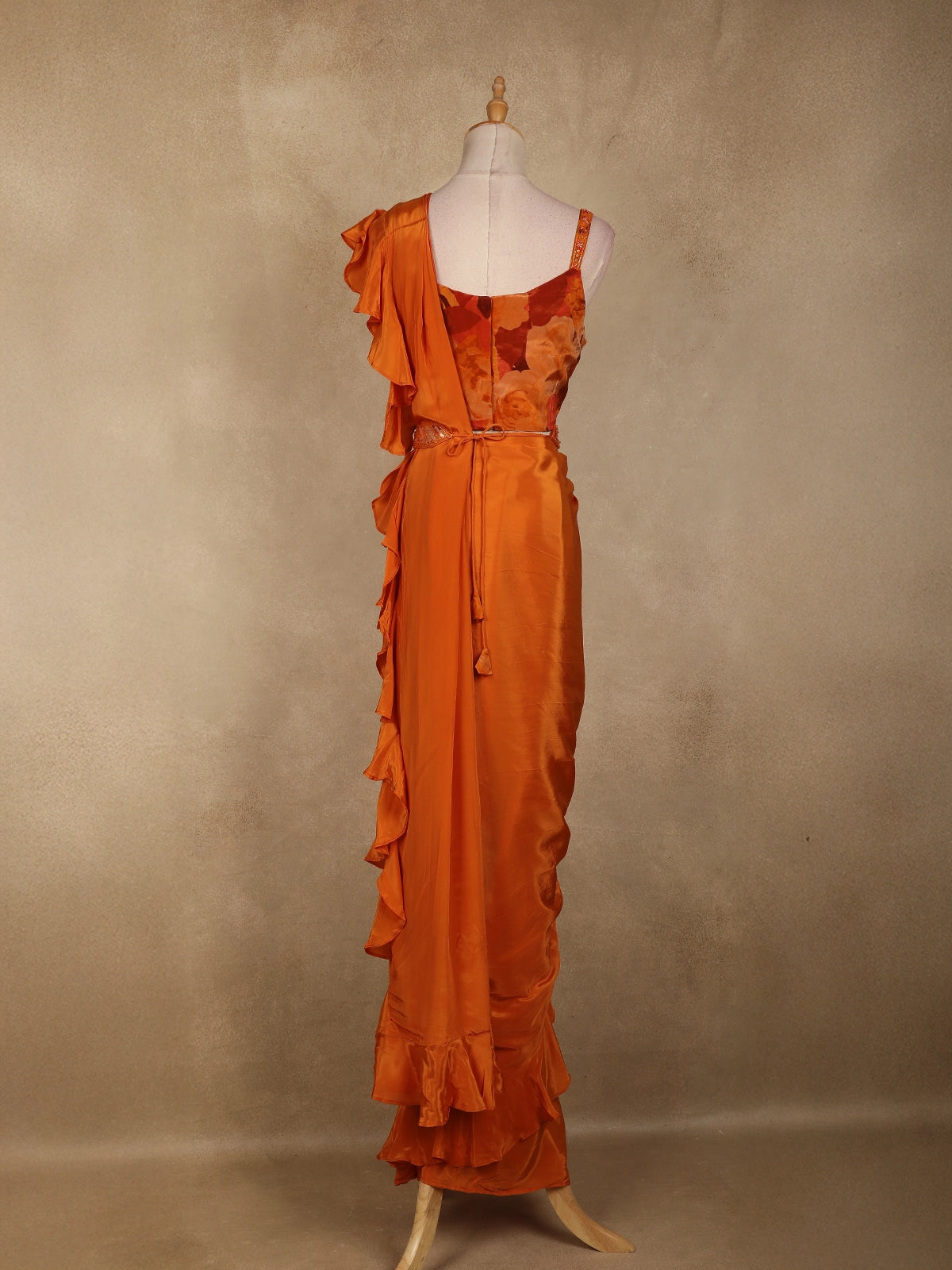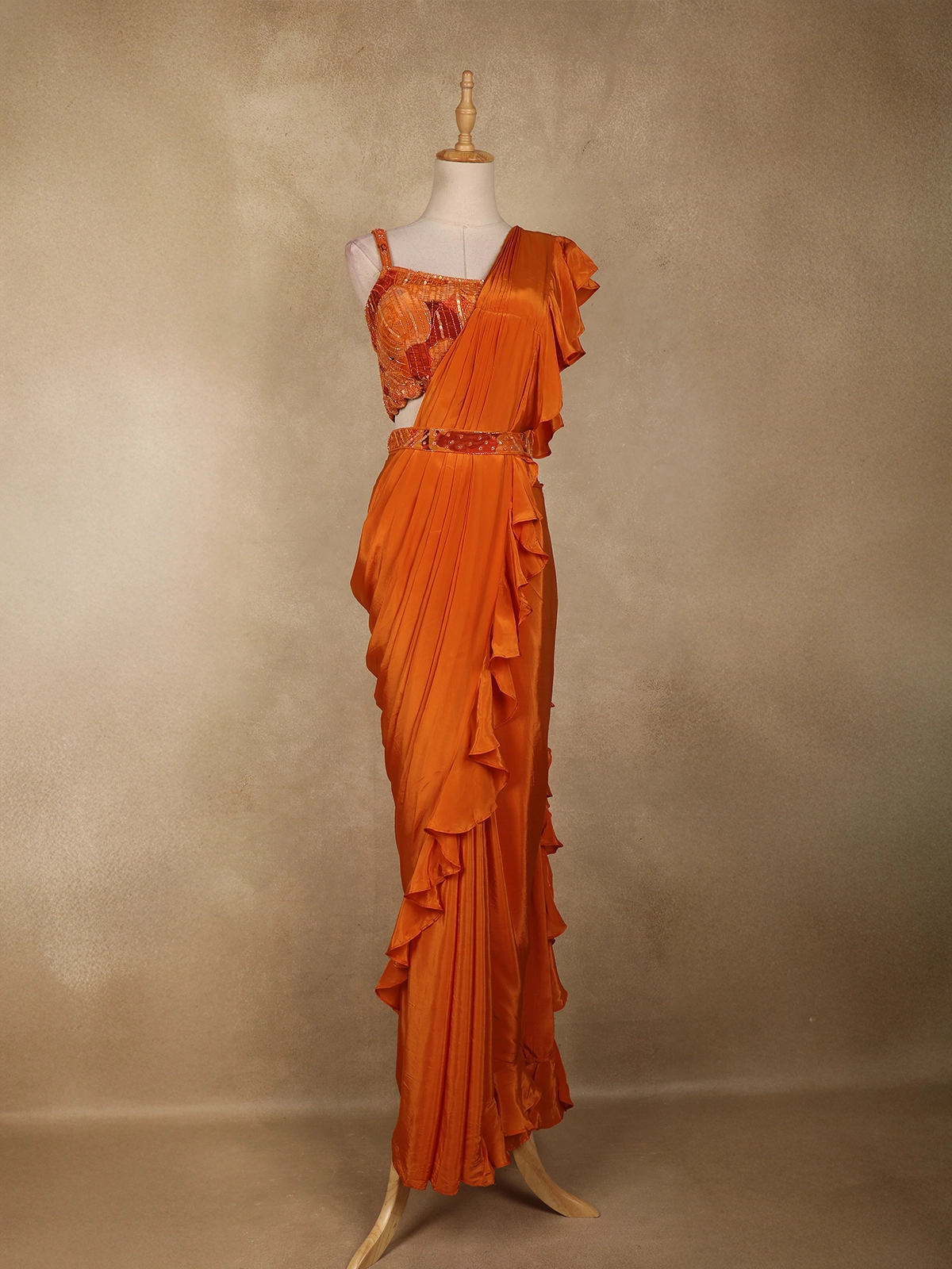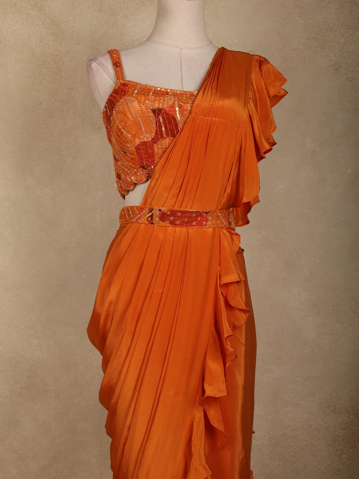 Make a bold and elegant style statement with this orange ready-to-wear saree, designed to bring together contemporary flair and festive charm. Crafted in smooth satin with a soft sheen, the saree features a graceful pre-draped silhouette enhanced by cascading ruffle detailing that adds fluid movement and modern appeal.