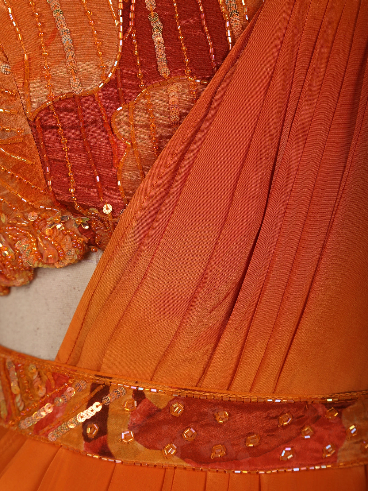 Orange Sequins and Beads Embroidered Satin Ruffle Ready to Wear Saree