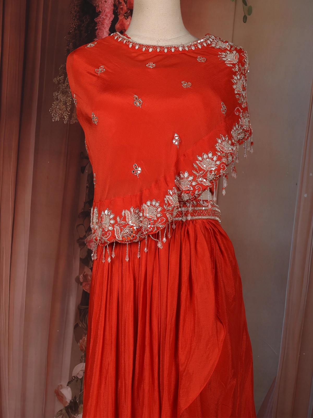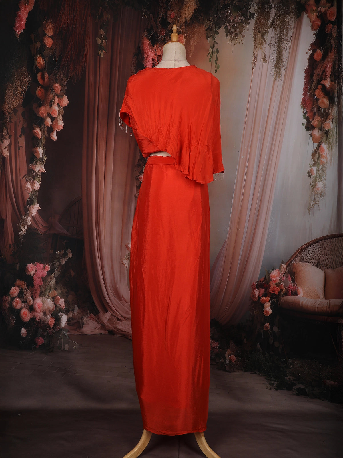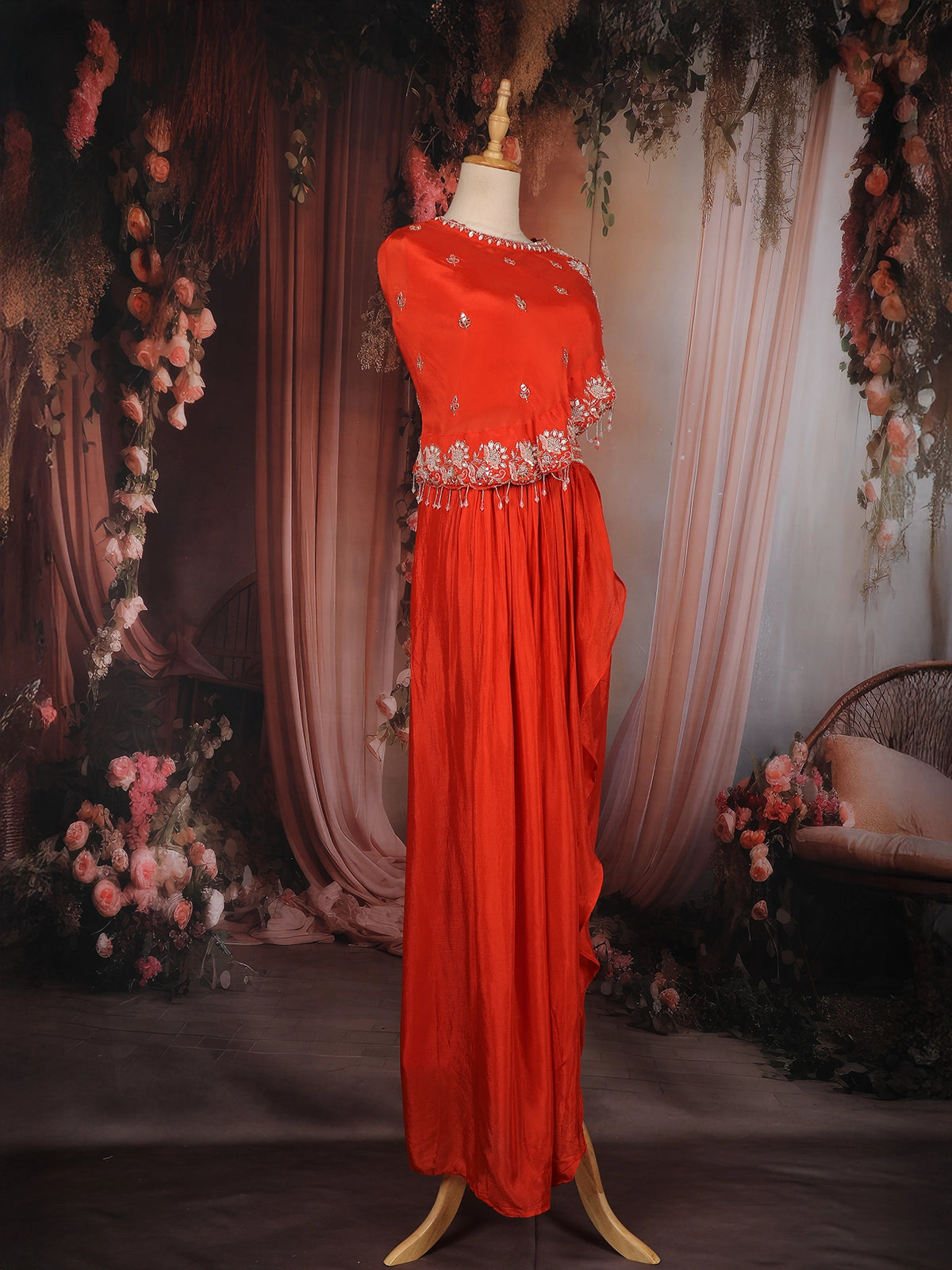 Radiate festive elegance with this stunning orange Indo-Western skirt top set, crafted to make every celebration memorable. Designed in lightweight georgette, the ensemble features a gracefully draped top paired with a flowing skirt that offers effortless movement and charm.