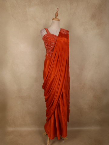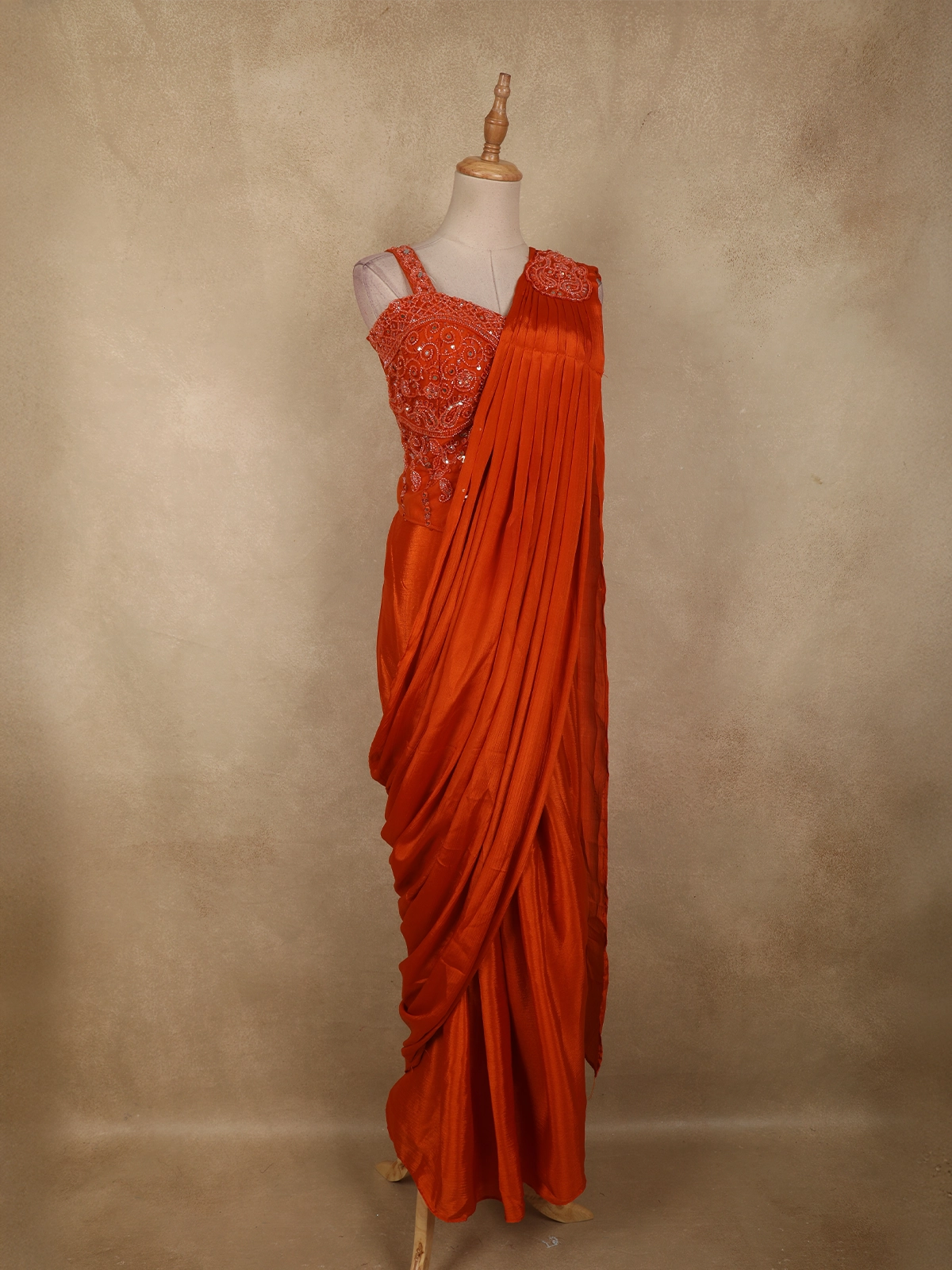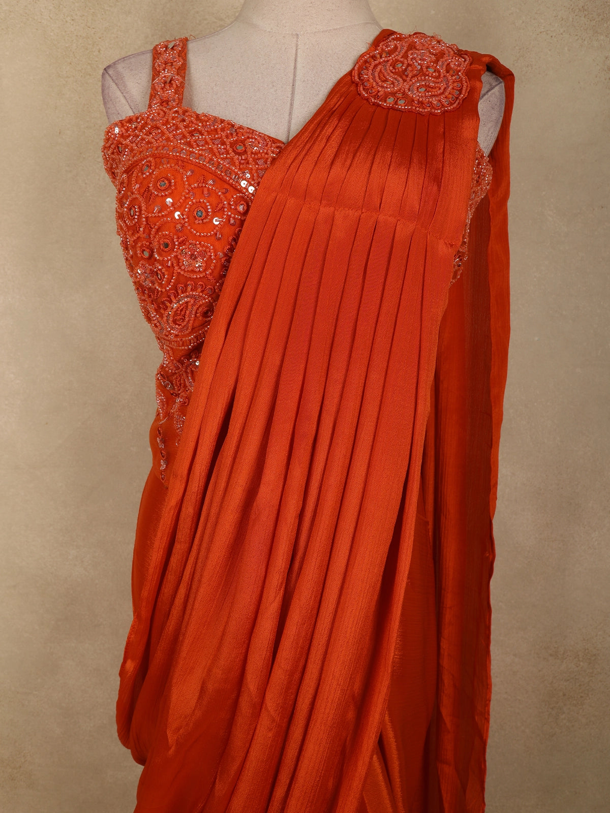 Step into the spotlight with this vibrant Orange Ready-to-Wear Georgette Saree, designed to bring out your bold and beautiful side. With a pre-stitched drape, this saree offers effortless styling — simply slip it on and instantly achieve a perfectly pleated, graceful fall without any fuss.