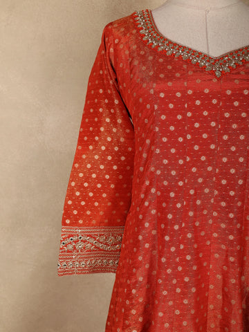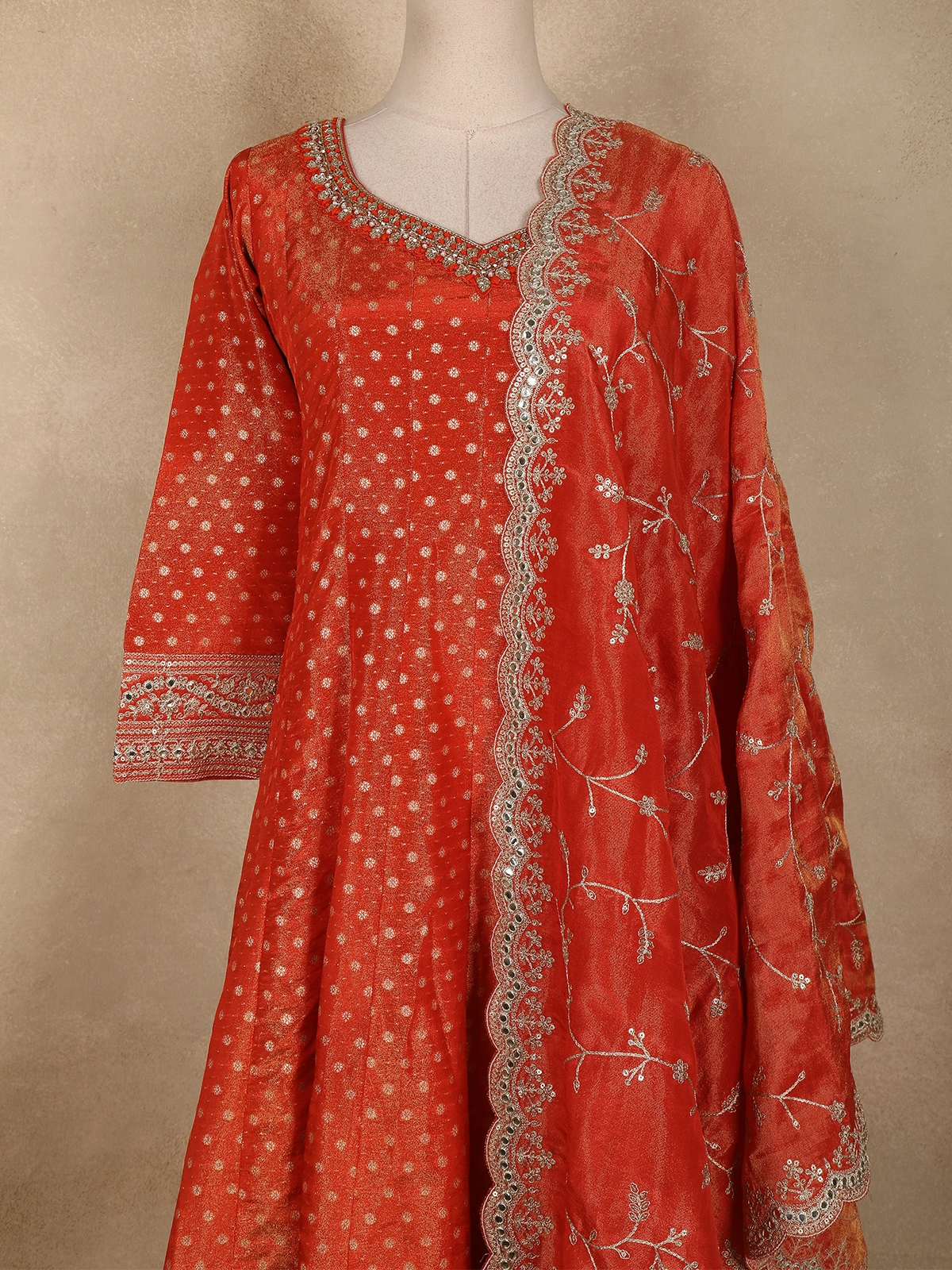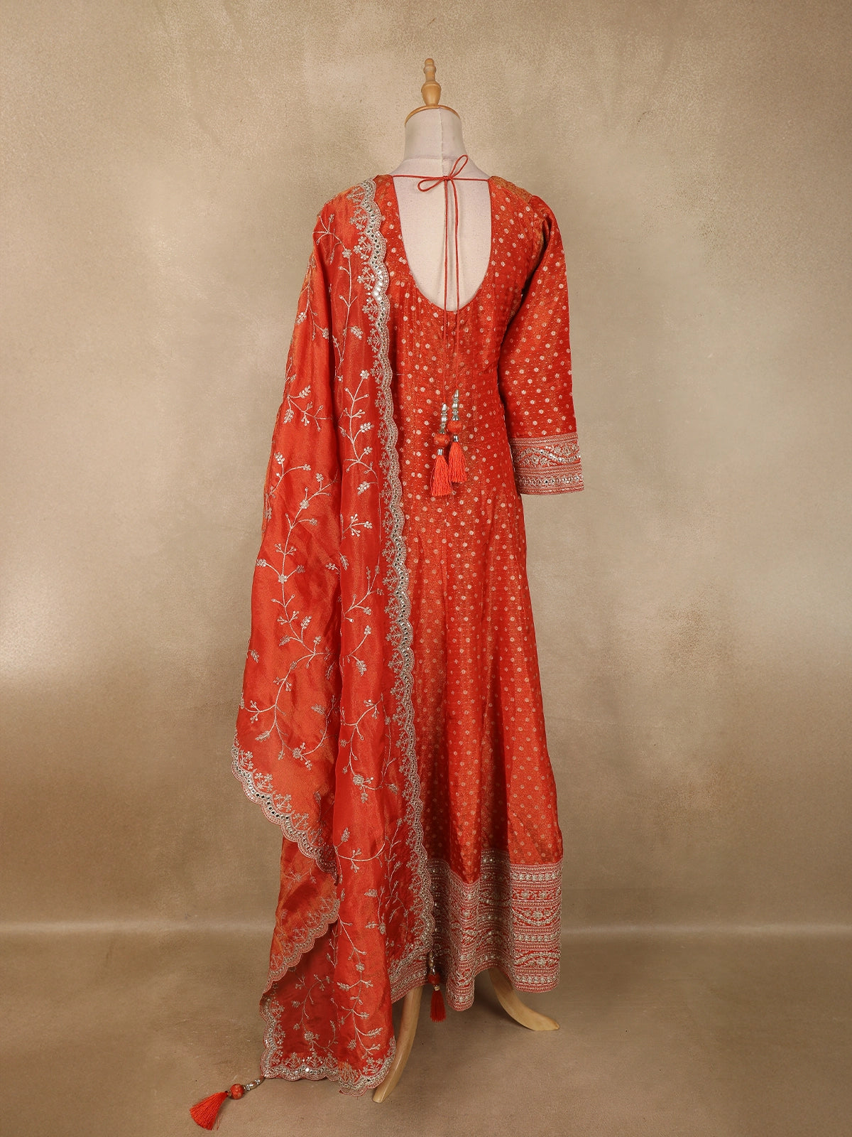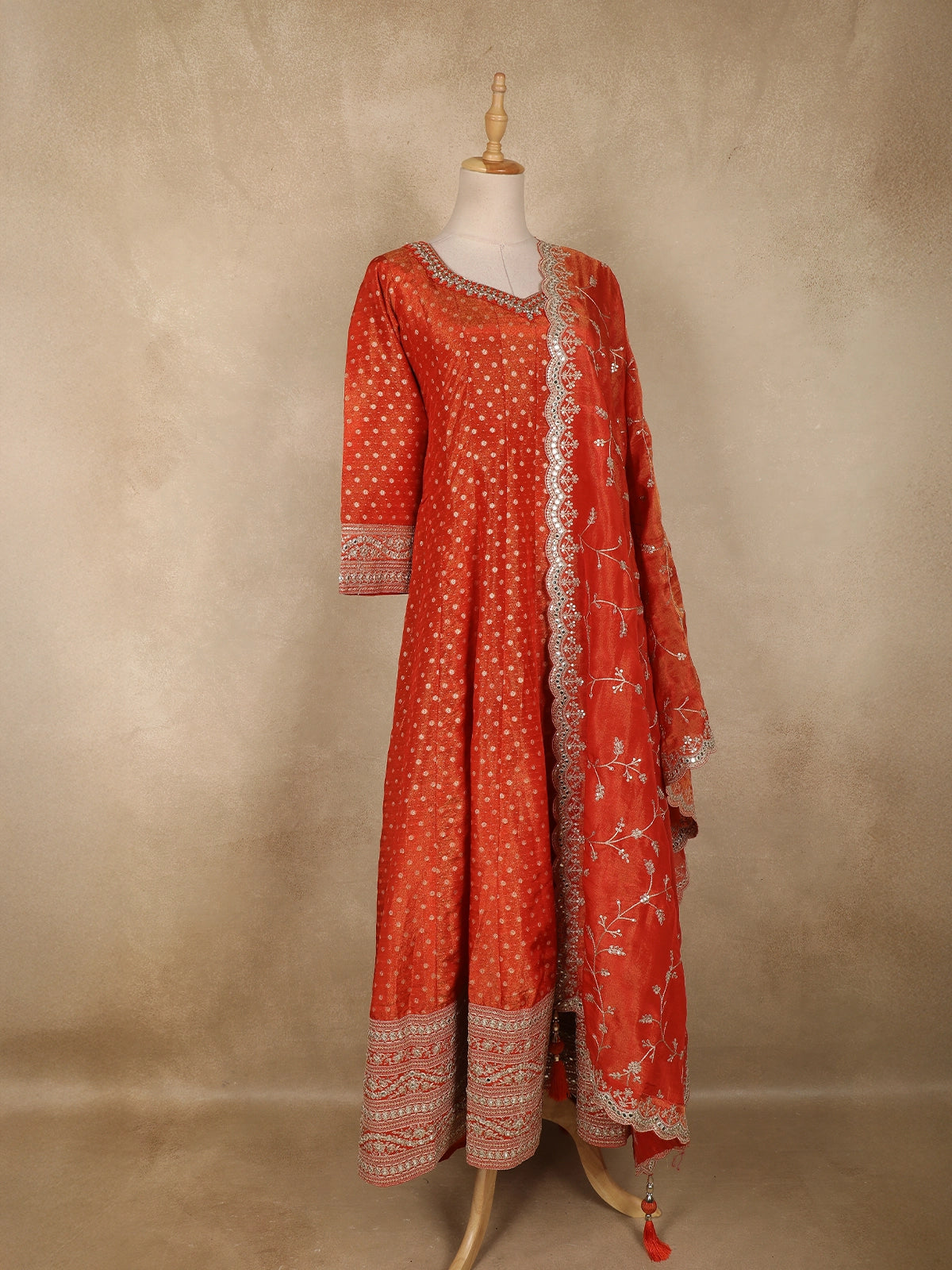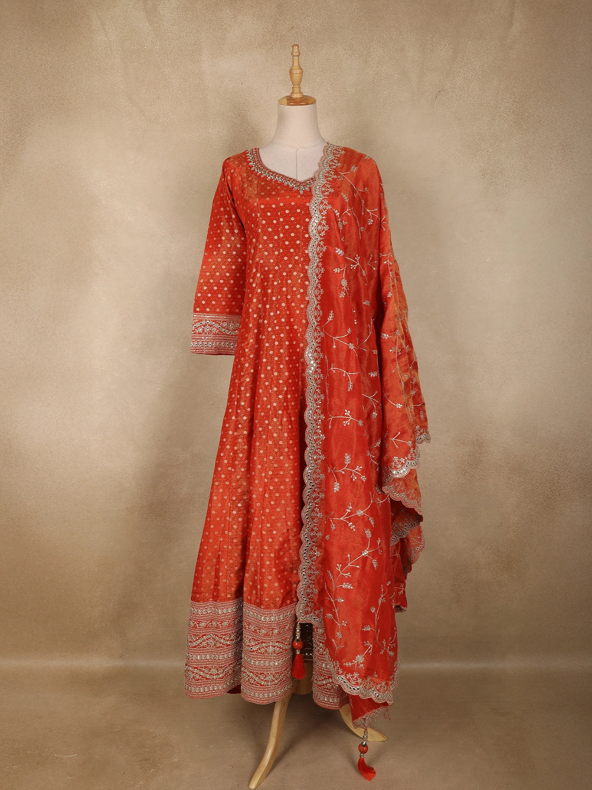 Orange Small Floral Butta Woven Tissue Banarasi Gown with Dupatta