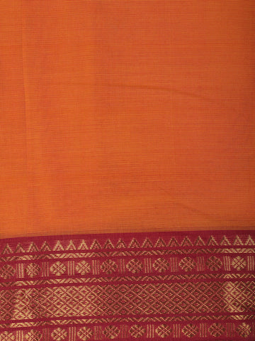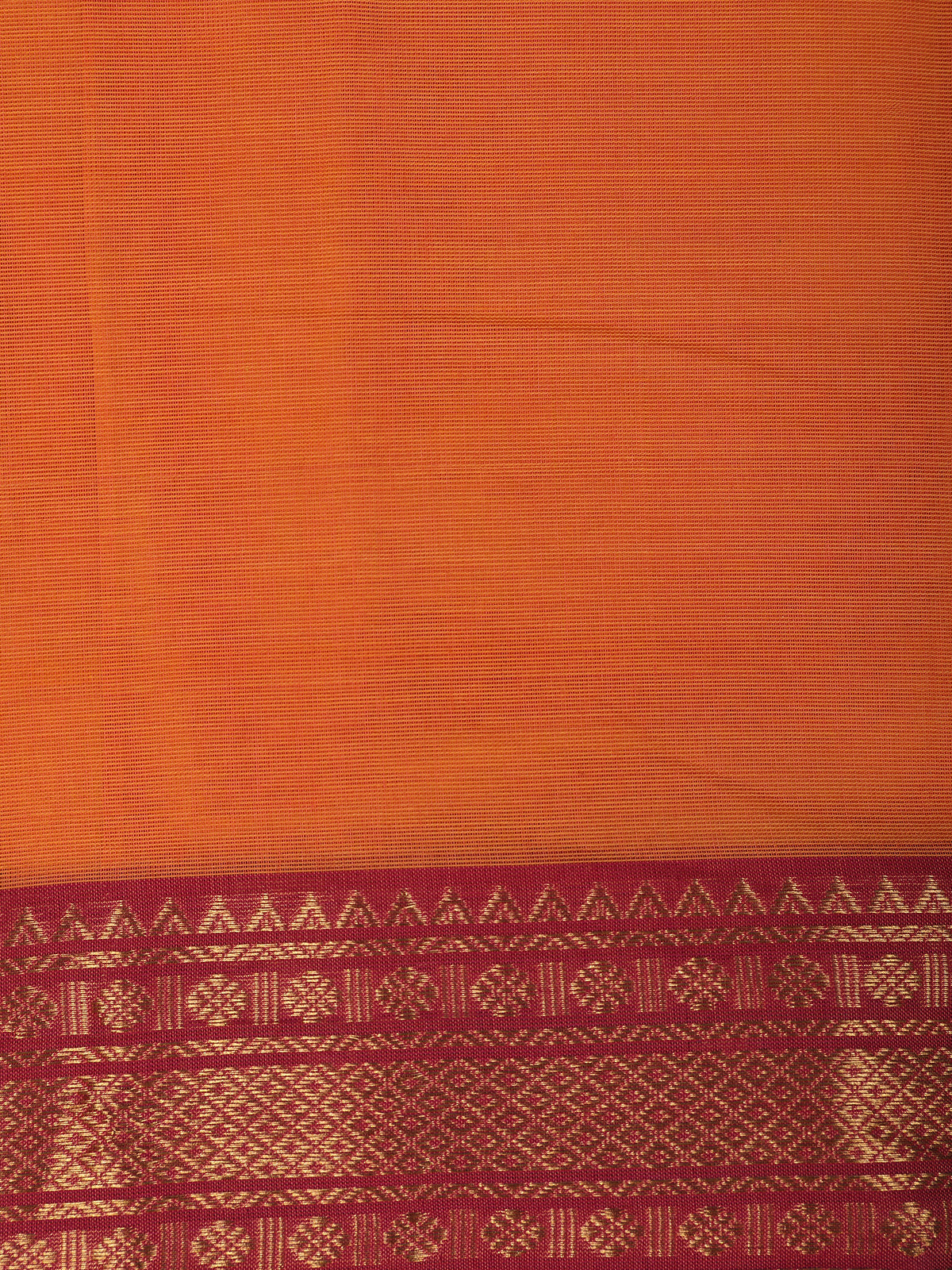 The saree features a solid orange body paired with a refined woven zari border in golden tones, adding just the right amount of sophistication to its simplicity. The zari detailing highlights the edges beautifully, giving it a festive touch while still maintaining an understated appeal.
