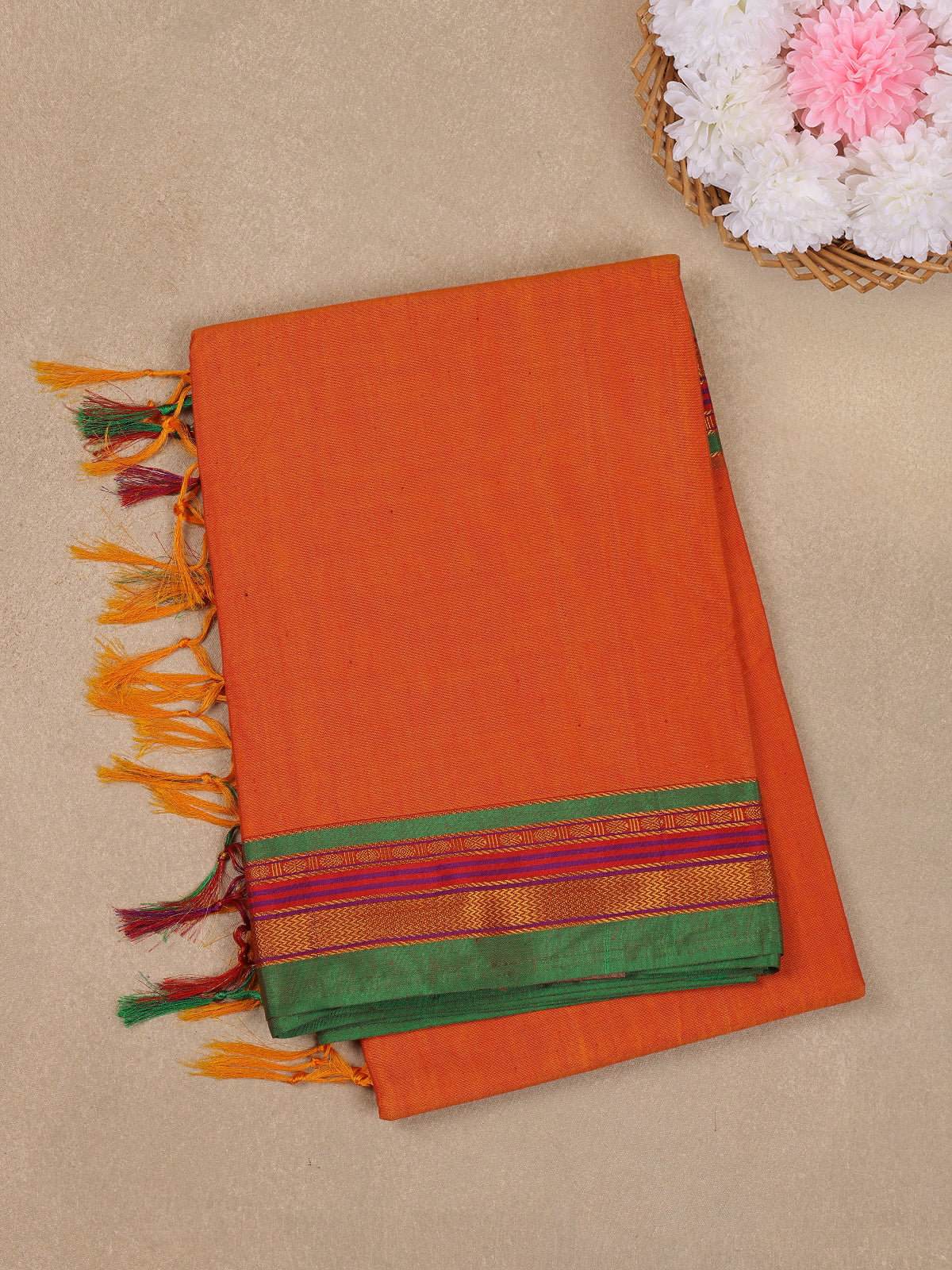 The saree is completed with a coordinated orange pallu finished with multicolor tassels, adding a handcrafted finishing touch. Paired with the contrast green blouse piece, the overall look is classic, graceful, and beautifully traditional.