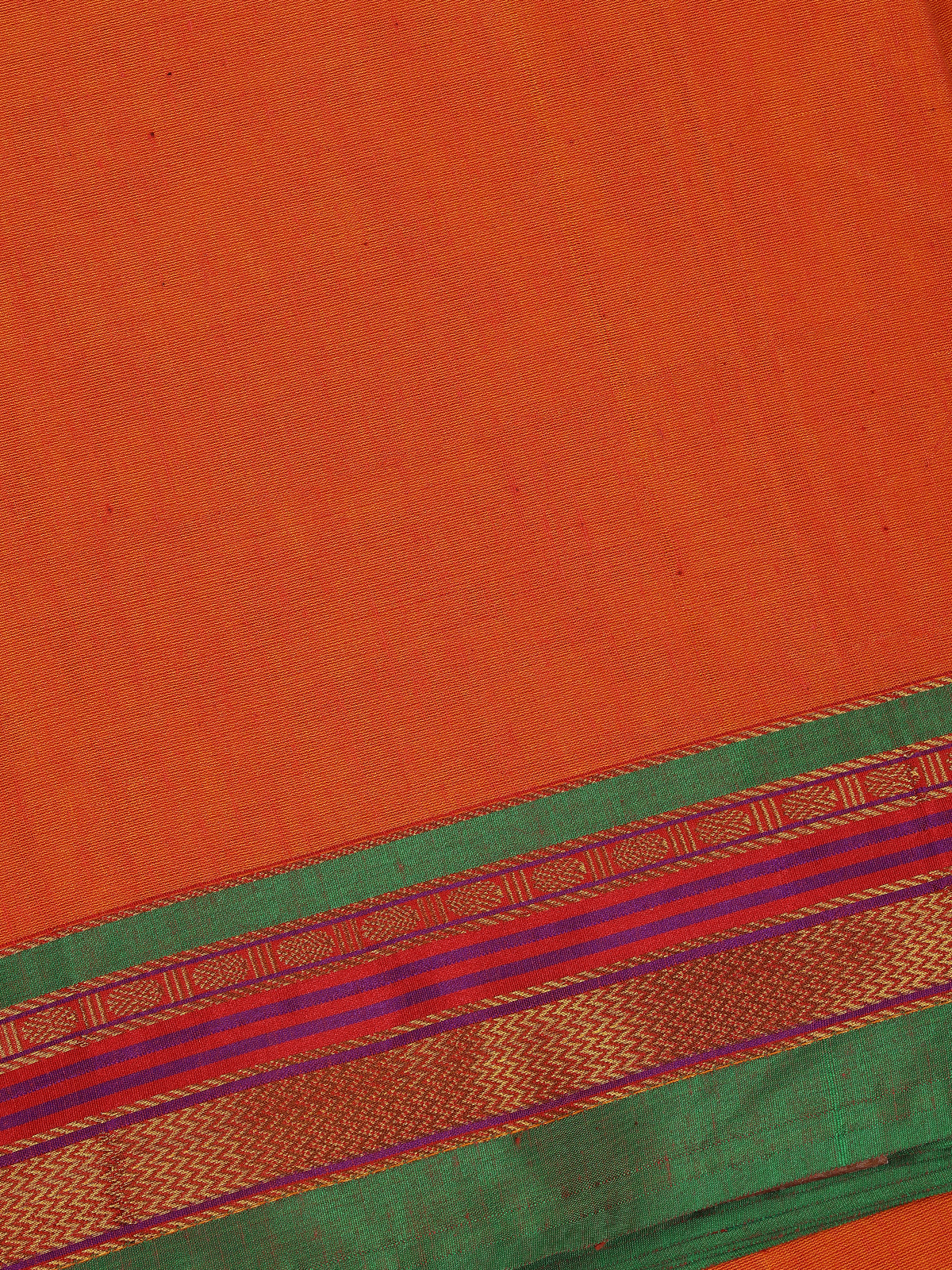 Bring a bright touch of tradition to your wardrobe with this Orange Semi Silk Cotton Saree, crafted in a smooth solid woven body and finished with a striking contrast green border. The vibrant orange shade creates a cheerful and graceful appeal, making it perfect for both everyday wear and cultural occasions.