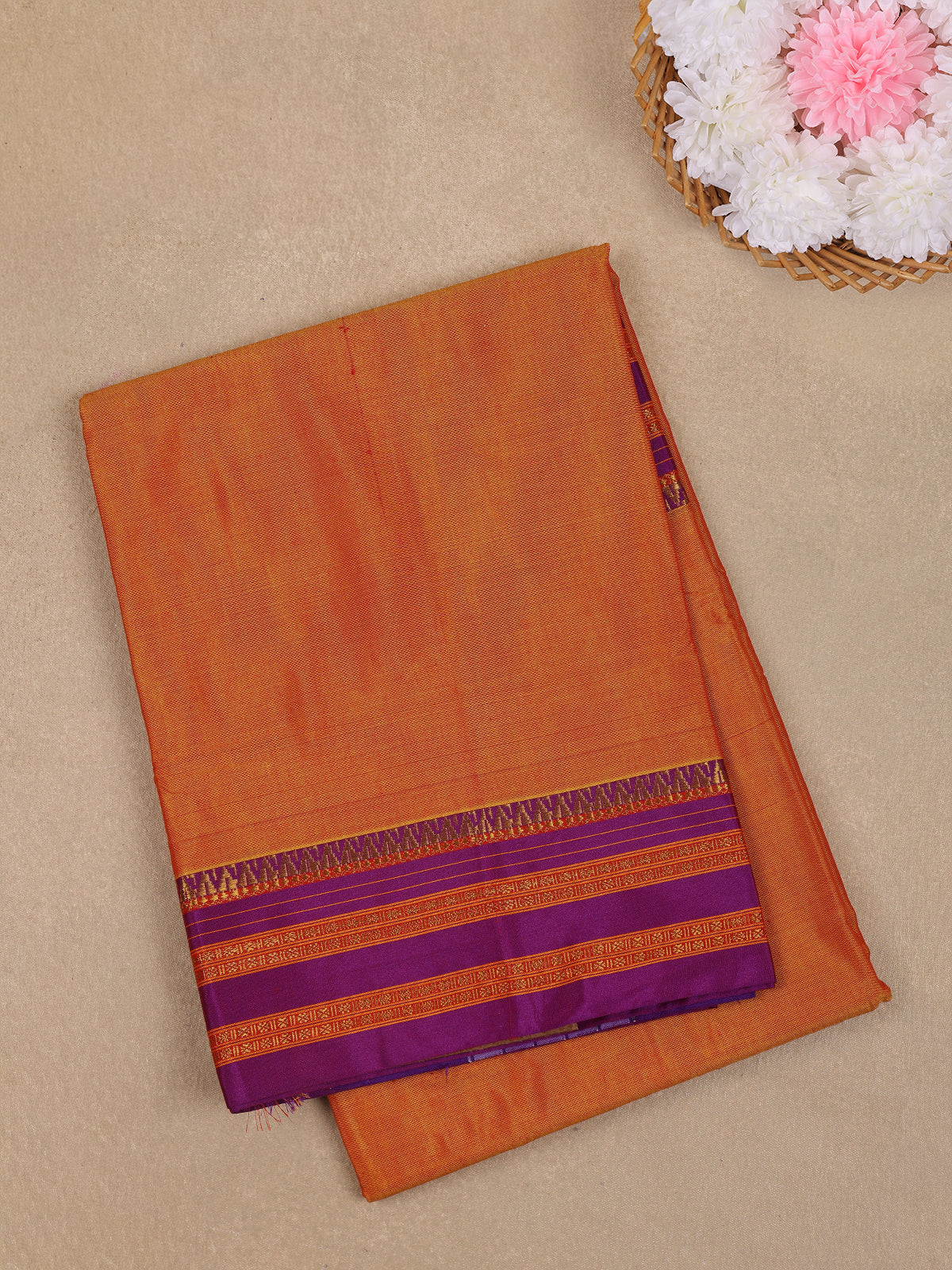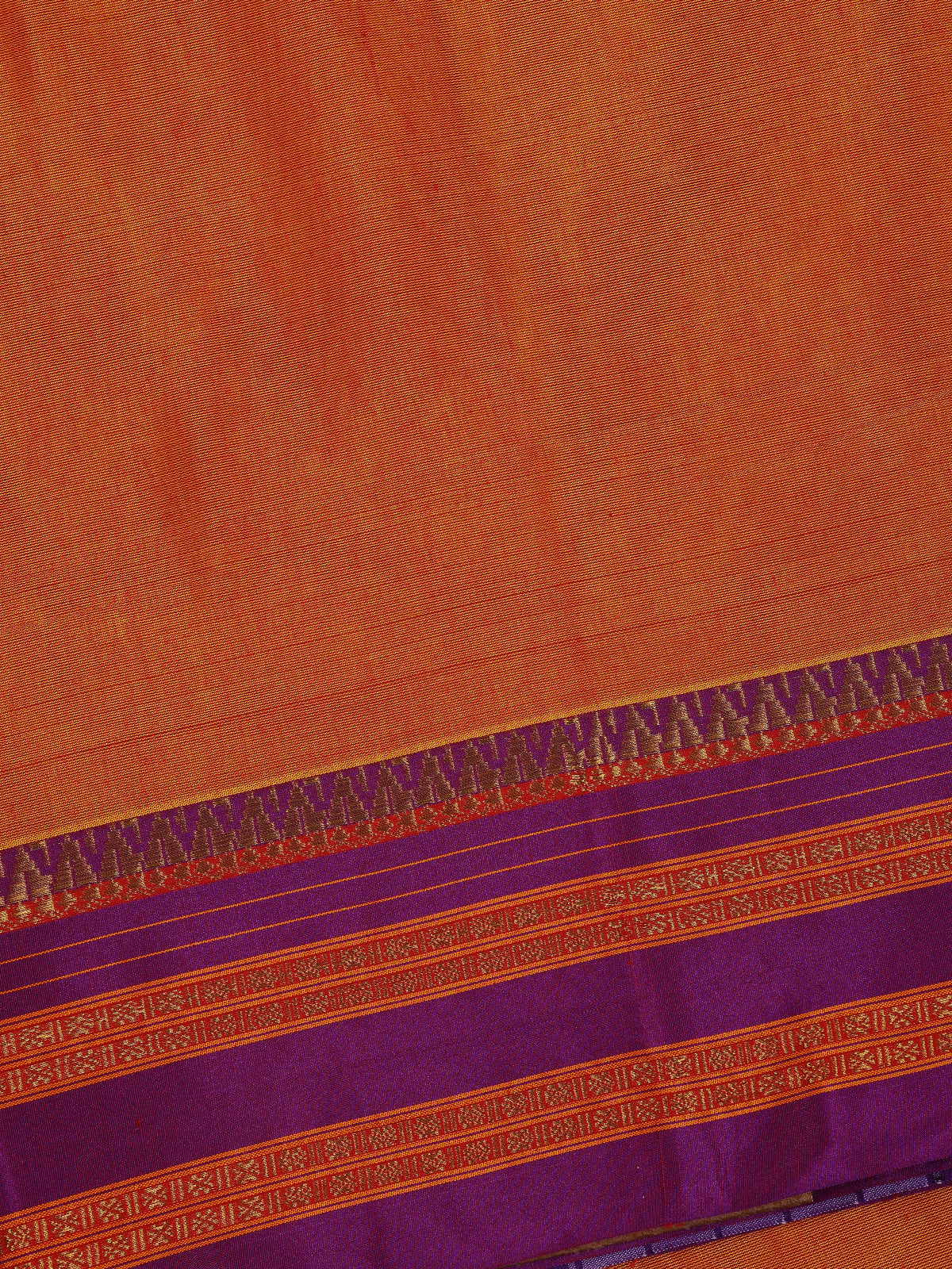 The contrast purple border features rich zari detailing with temple-inspired motifs, adding a authentic South Indian charm to the saree. Paired with the matching orange pallu finished with tassel detailing (where applicable), the saree beautifully balances simplicity and elegance. Completing the look is a contrast purple blouse piece, allowing for a neatly coordinated finish.