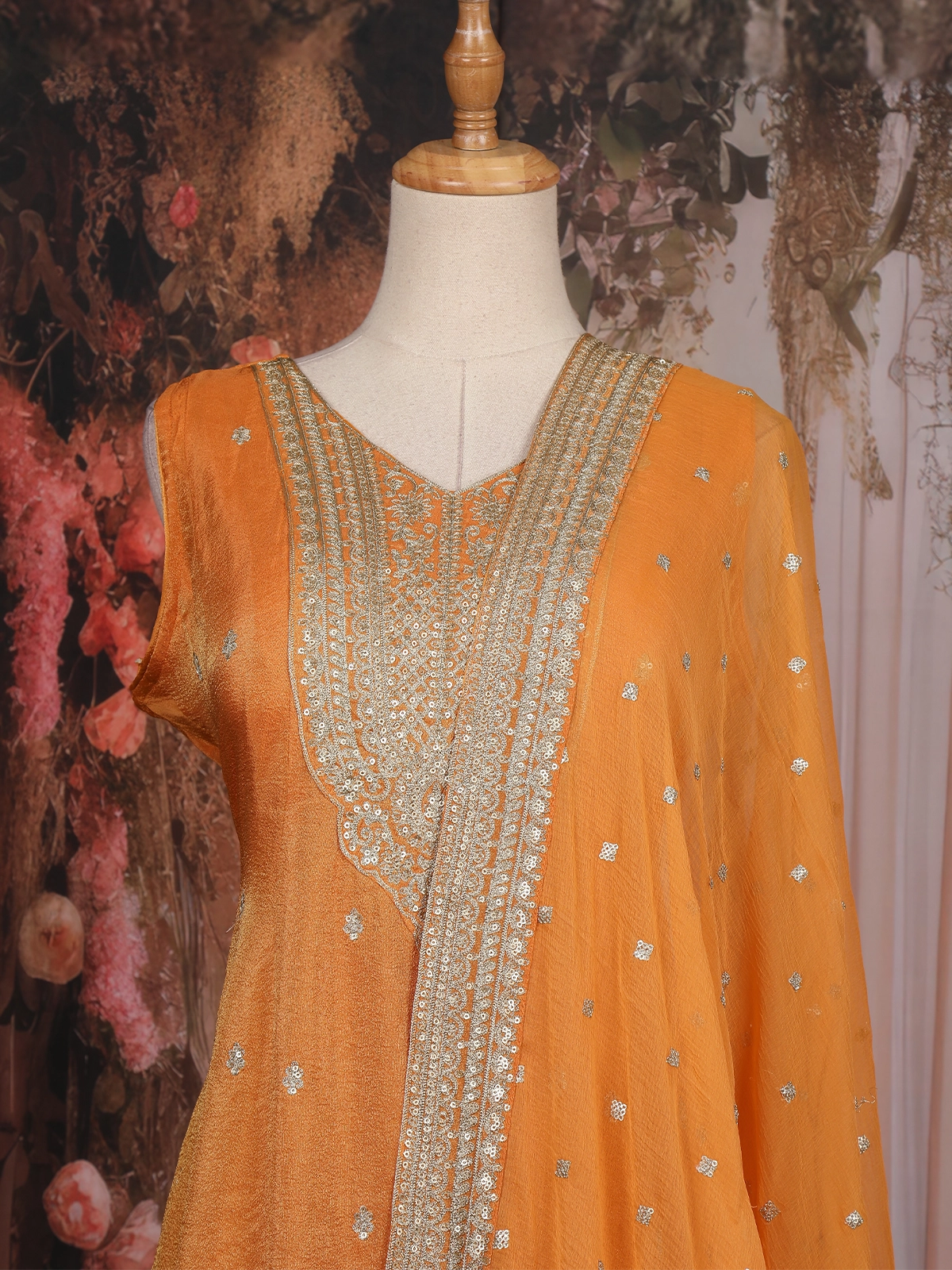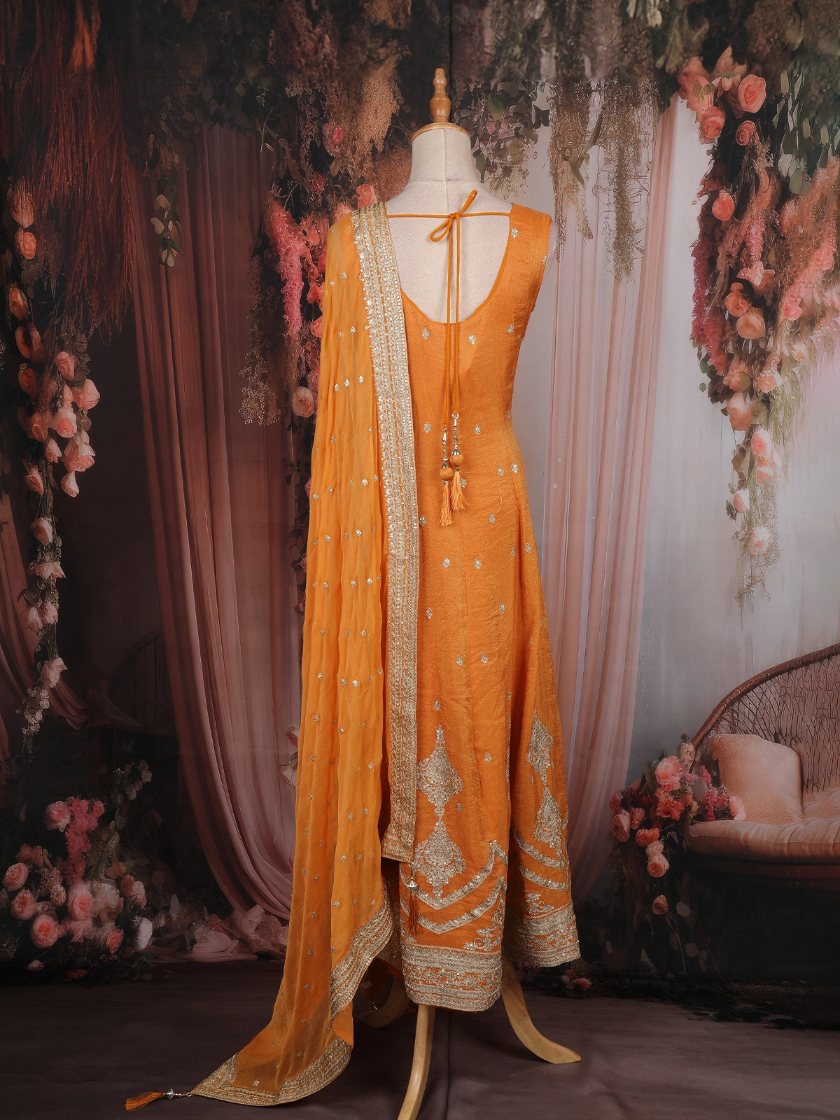 The Anarkali silhouette flatters every figure with its graceful flow and regal volume, making it an ideal choice for festive celebrations, weddings, and grand occasions. The embroidery detailing around the neckline and borders exudes craftsmanship that’s both intricate and luxurious.