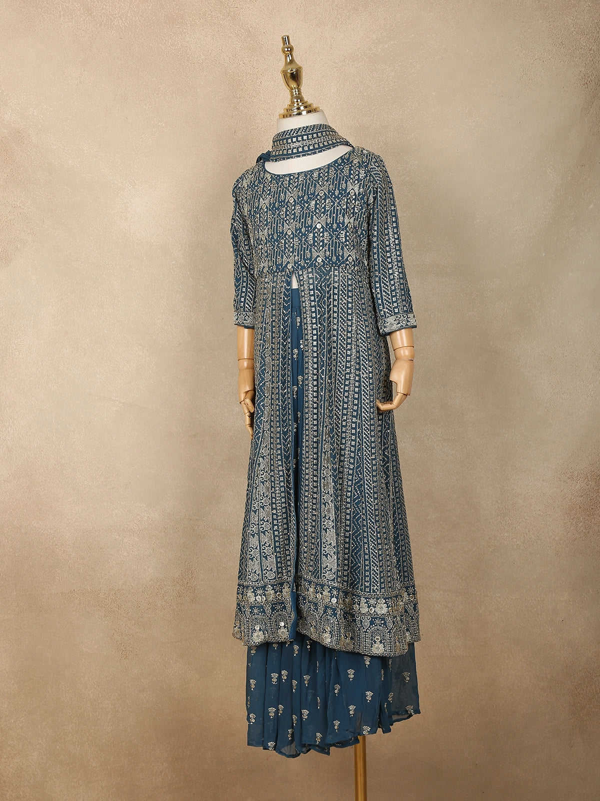 Designed with a straight-cut kurta, three-quarter sleeves, and a round neckline, this outfit blends beauty and ease, making it perfect for kids to wear throughout celebrations. The matching flared palazzo ensures free movement and all-day comfort, while the coordinated dupatta with a subtle shimmer border completes the festive look with grace.