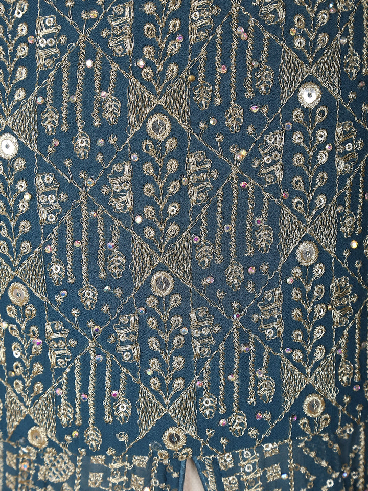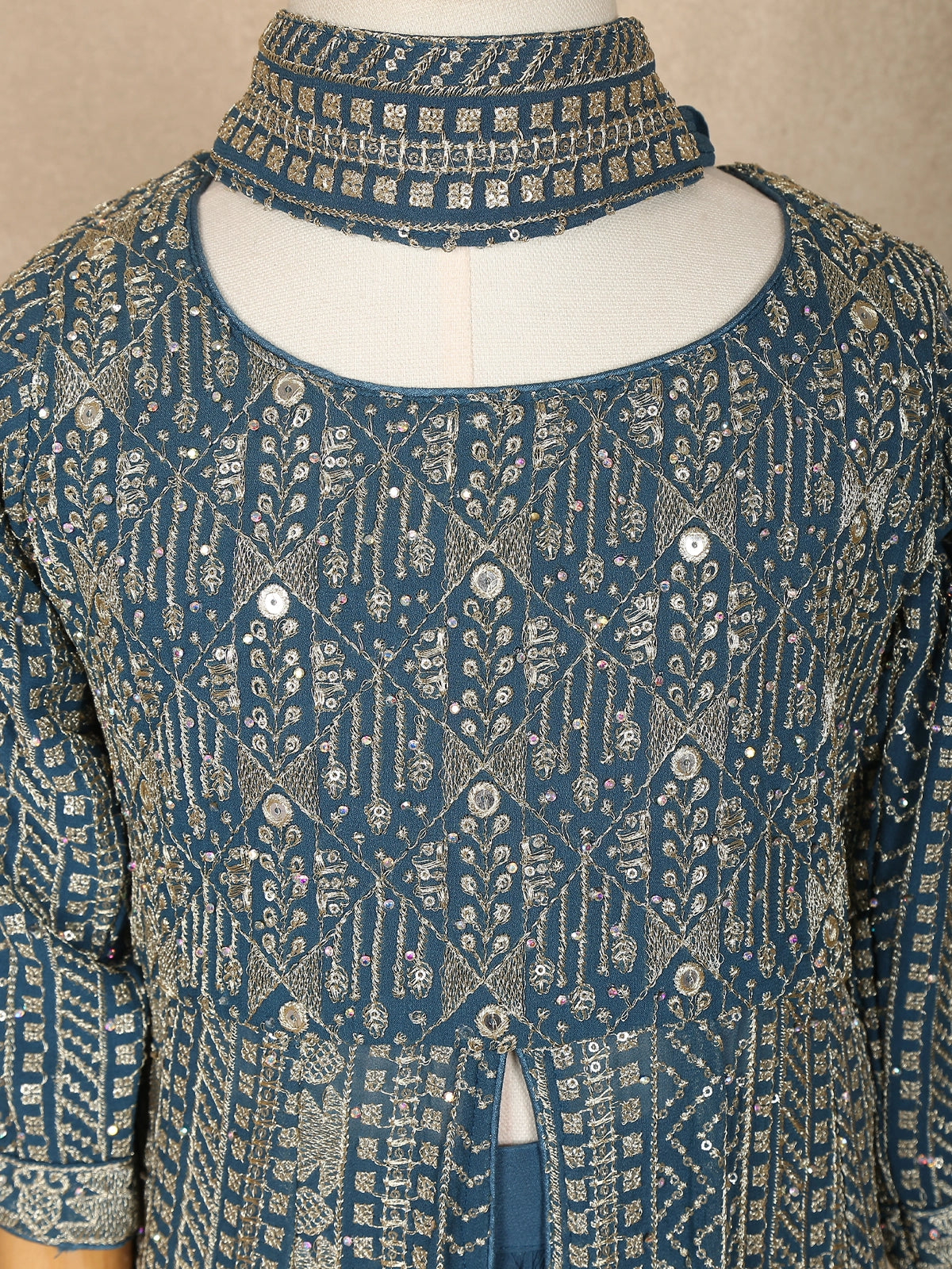 Let your little one shine in pure elegance with this Pale Blue Mirror Embroidered Palazzo Suit, crafted for festive charm and graceful comfort. The soft georgette fabric gives a delicate flow, while the intricate all-over mirror and thread embroidery adds a sparkling glow with every movement.