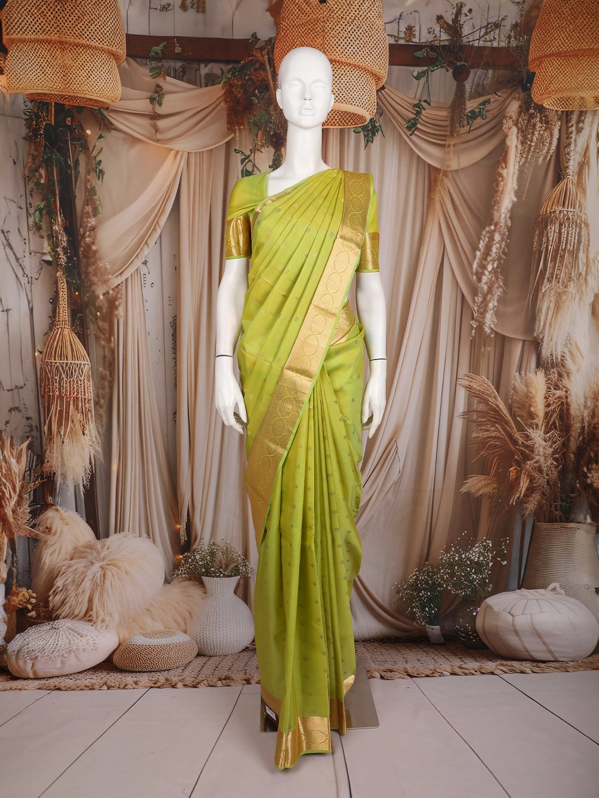 Complemented by a matching parrot green blouse with zari detailing, this saree captures the perfect balance between traditional artistry and modern sophistication.