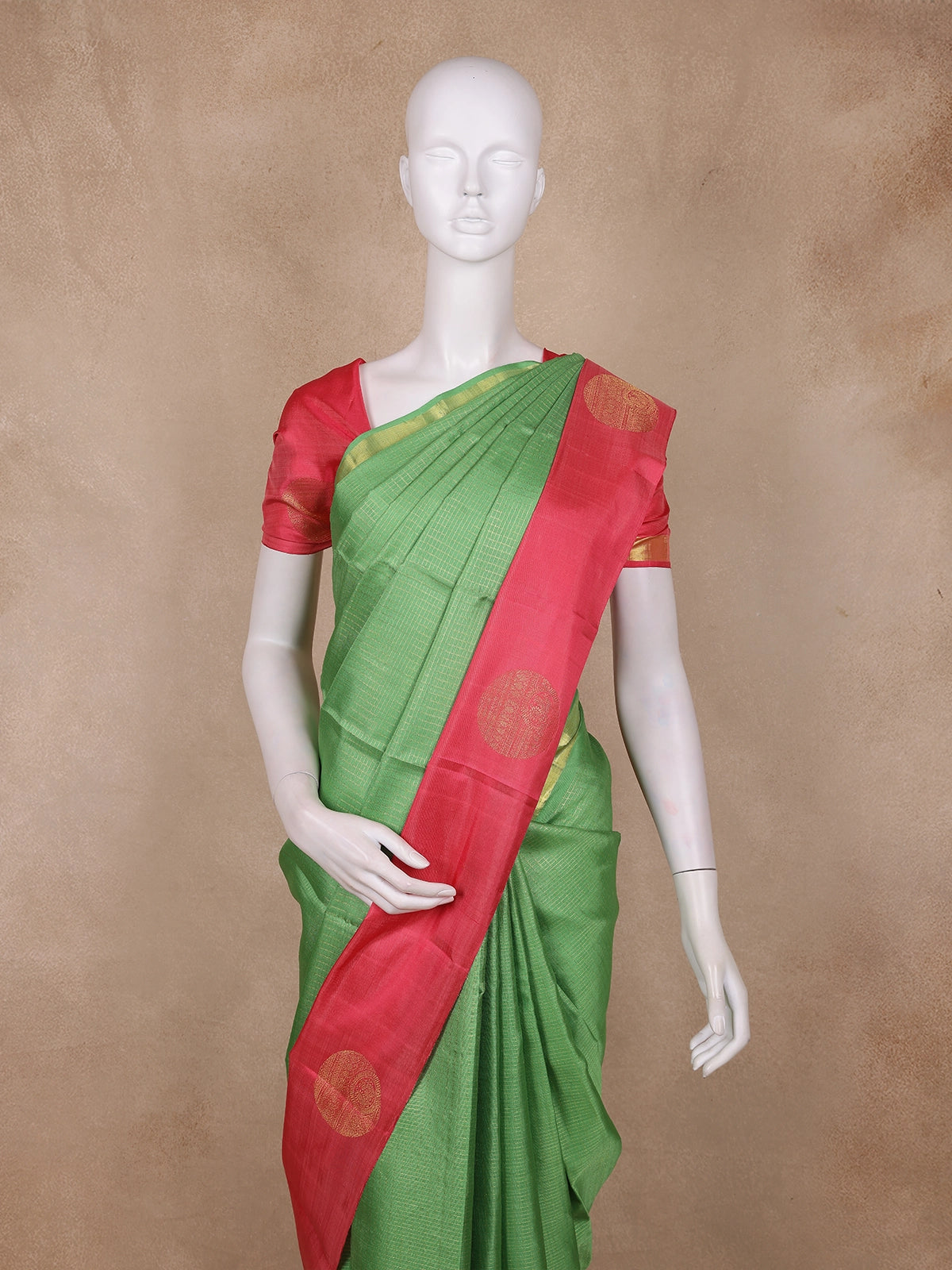 Enhancing its beauty is the contrast red zari woven border, offering a rich traditional contrast that highlights the saree’s festive charm. The zari motifs on the border and pallu add a touch of heritage artistry, completing the saree with a refined, ceremonial finish.