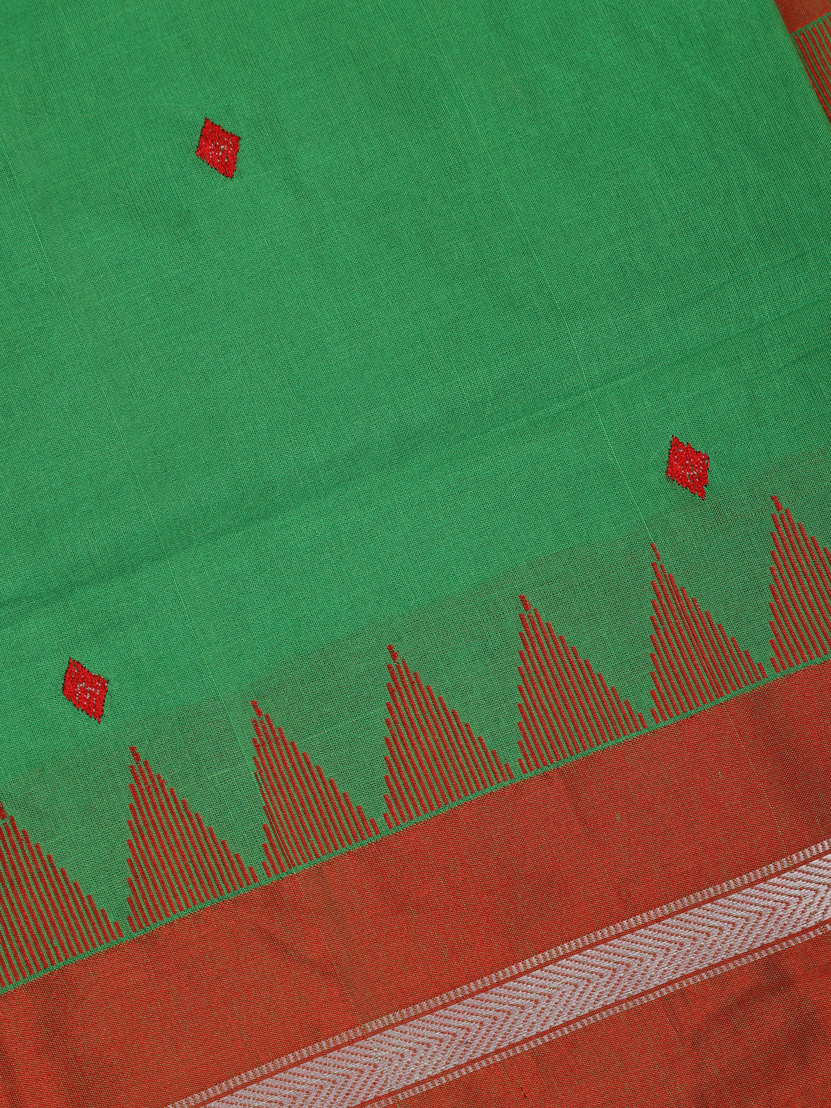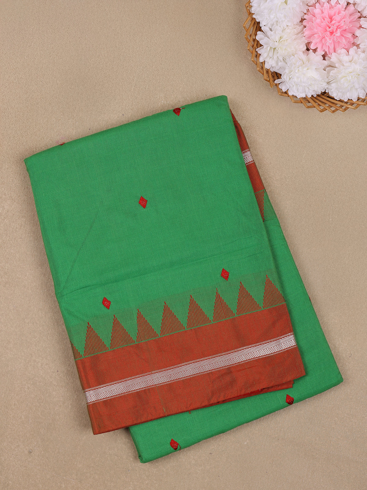 Parrot Green Diamond Motif Design Cotton Saree with Contrast Rust Temple Border