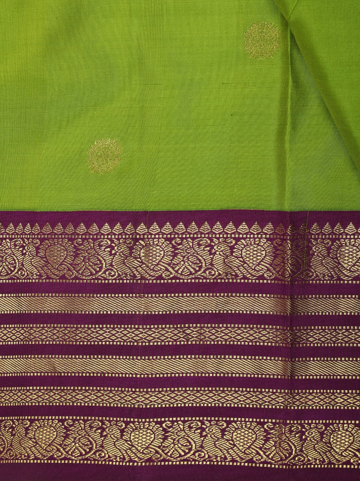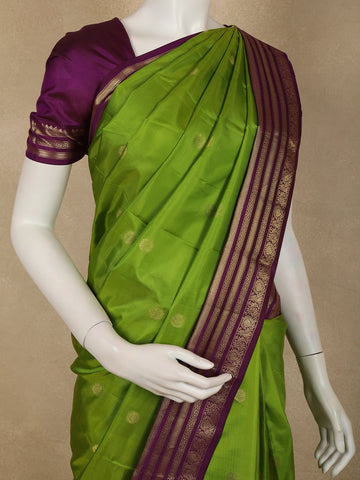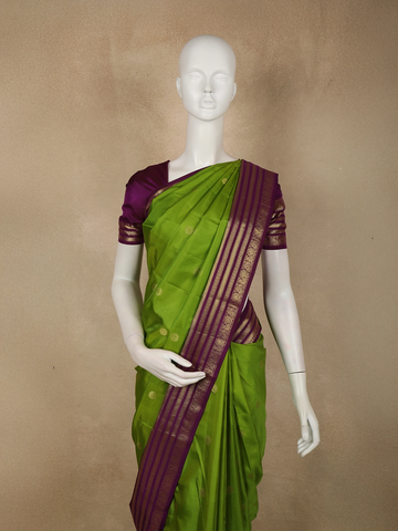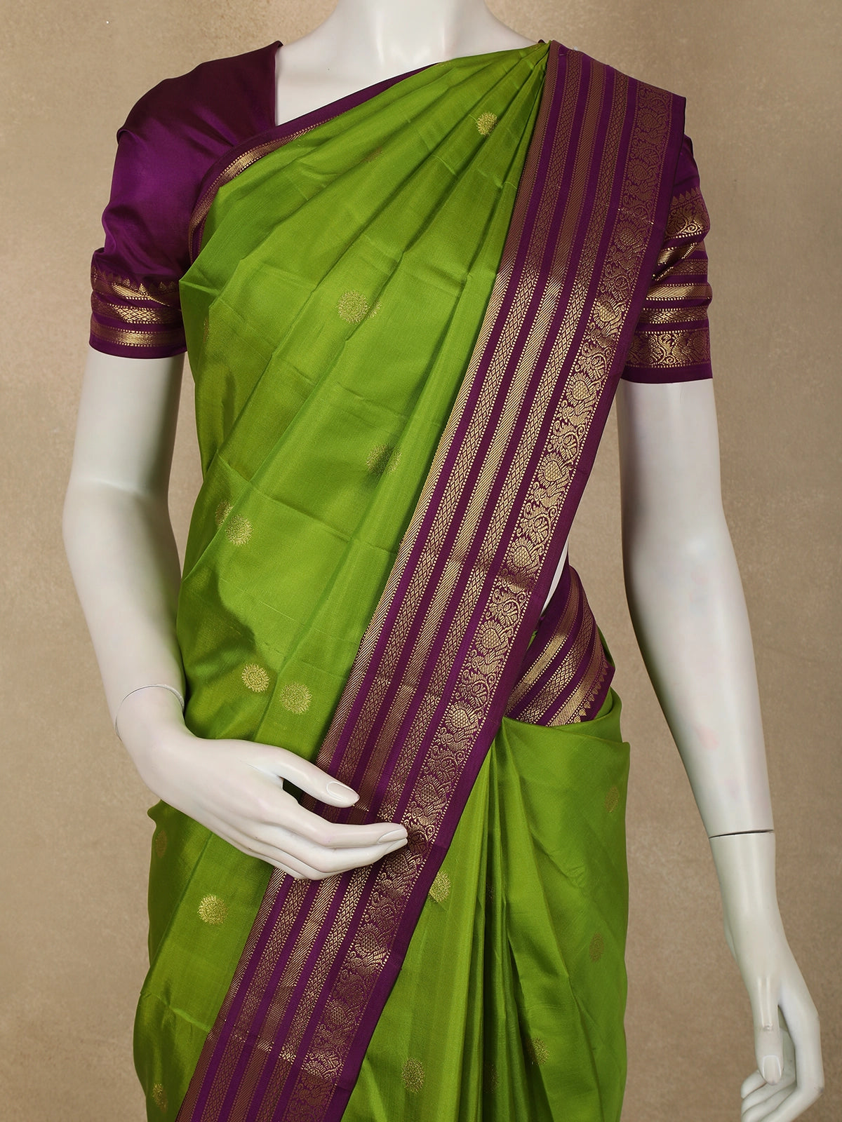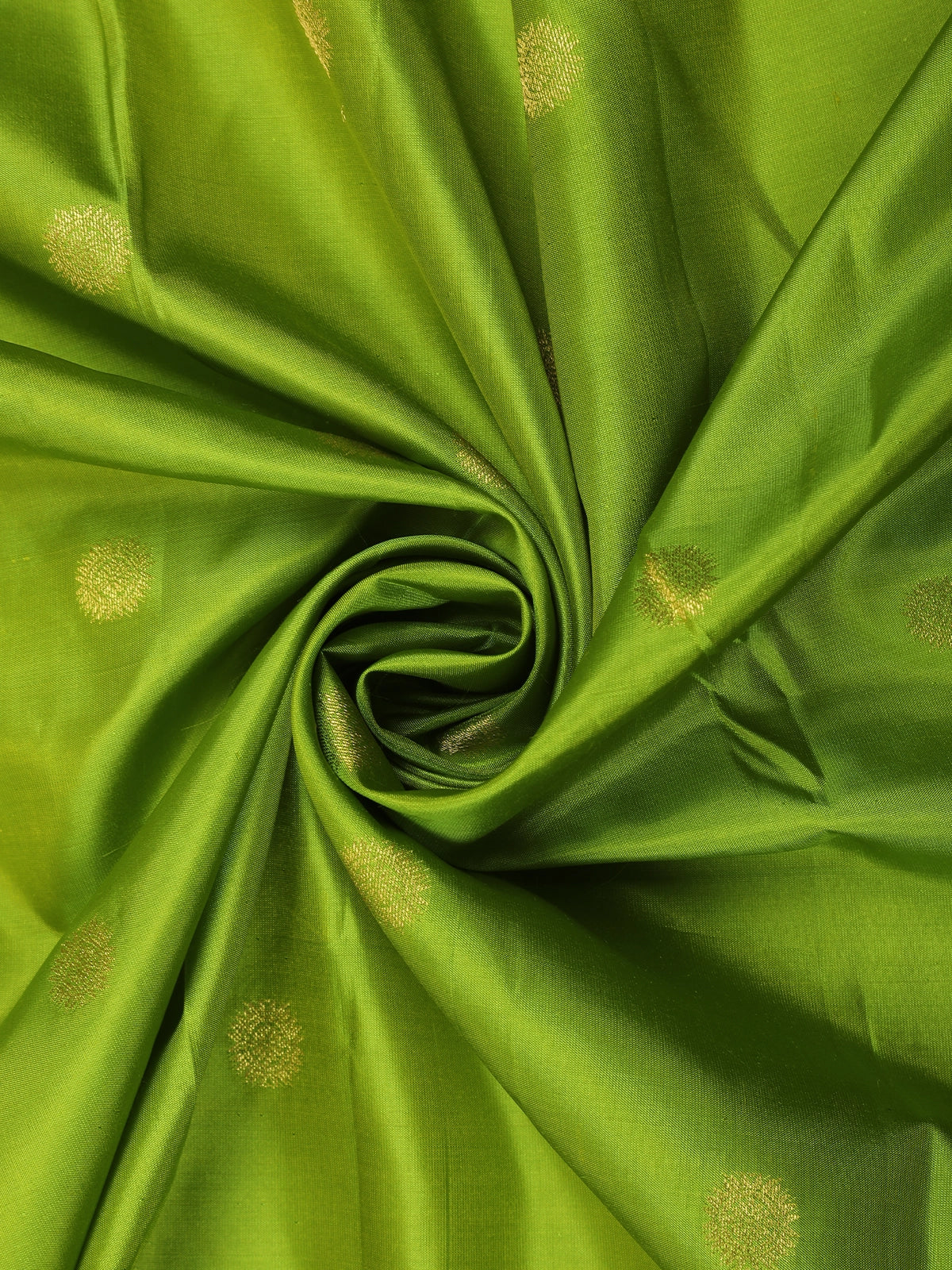 This Parrot Green Floral Butta Woven Design Pure Kanchipuram Silk Saree is a striking blend of vibrant colour and timeless tradition. The refreshing parrot green base brings a lively yet elegant appeal, beautifully adorned with delicately woven floral butta motifs in shimmering gold zari that add a subtle festive sparkle across the body.