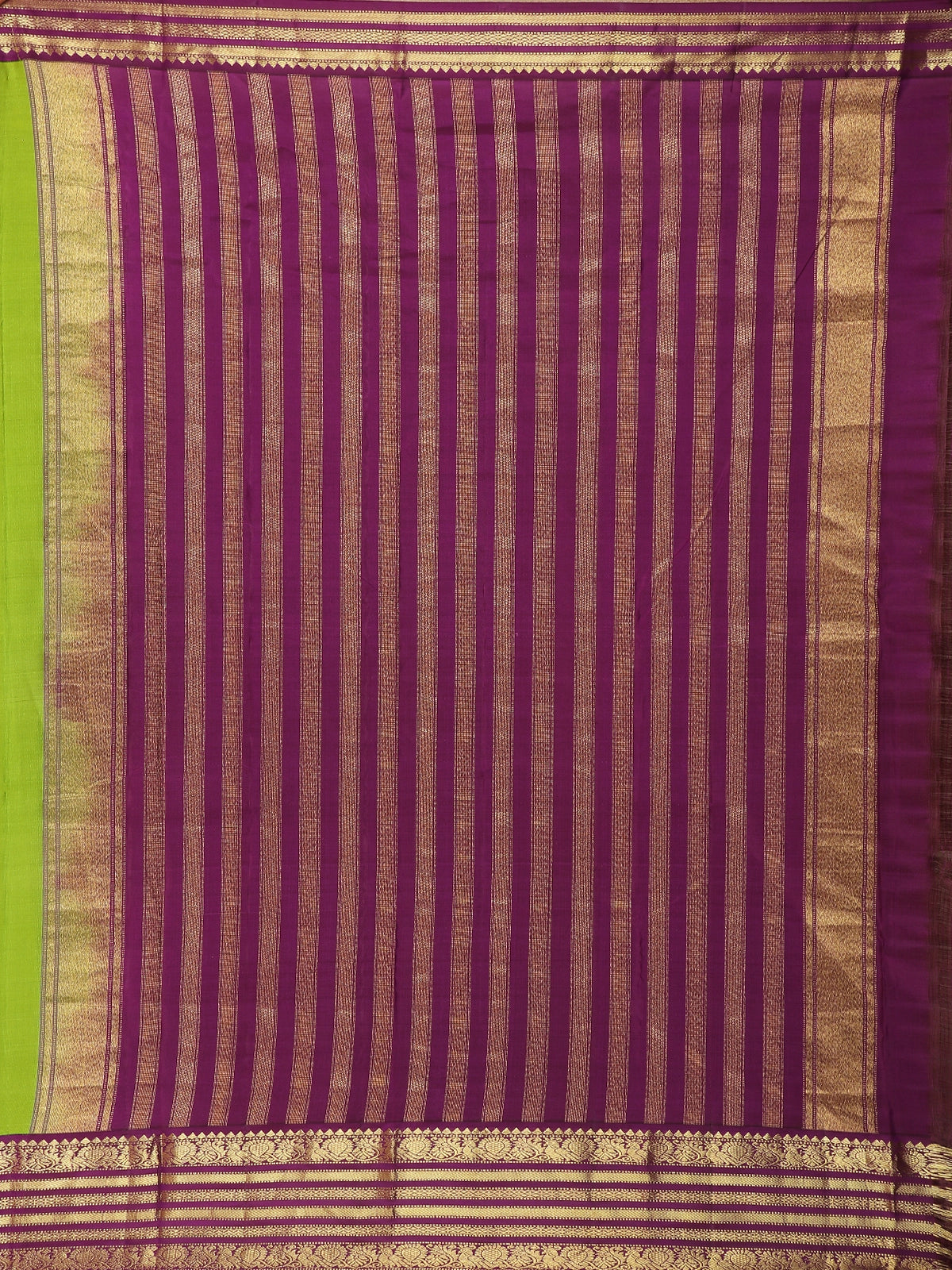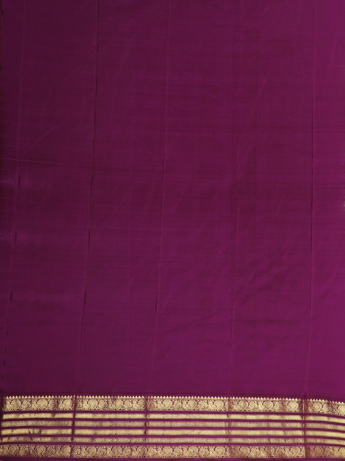 Enhancing its grandeur is the contrast zari border, woven in rich tones with intricate traditional patterns inspired by classic temple and paisley motifs. The lustrous gold zari work against the contrasting border colour creates a bold and regal frame, elevating the saree’s overall richness. The finely detailed border flows into a matching pallu, showcasing the hallmark craftsmanship of authentic Kanchipuram weaving.