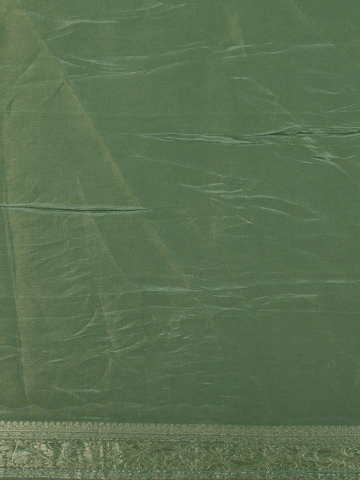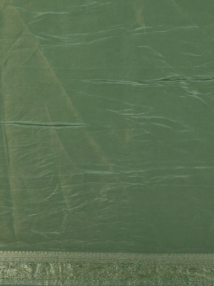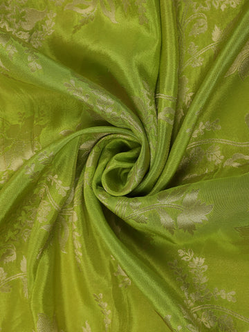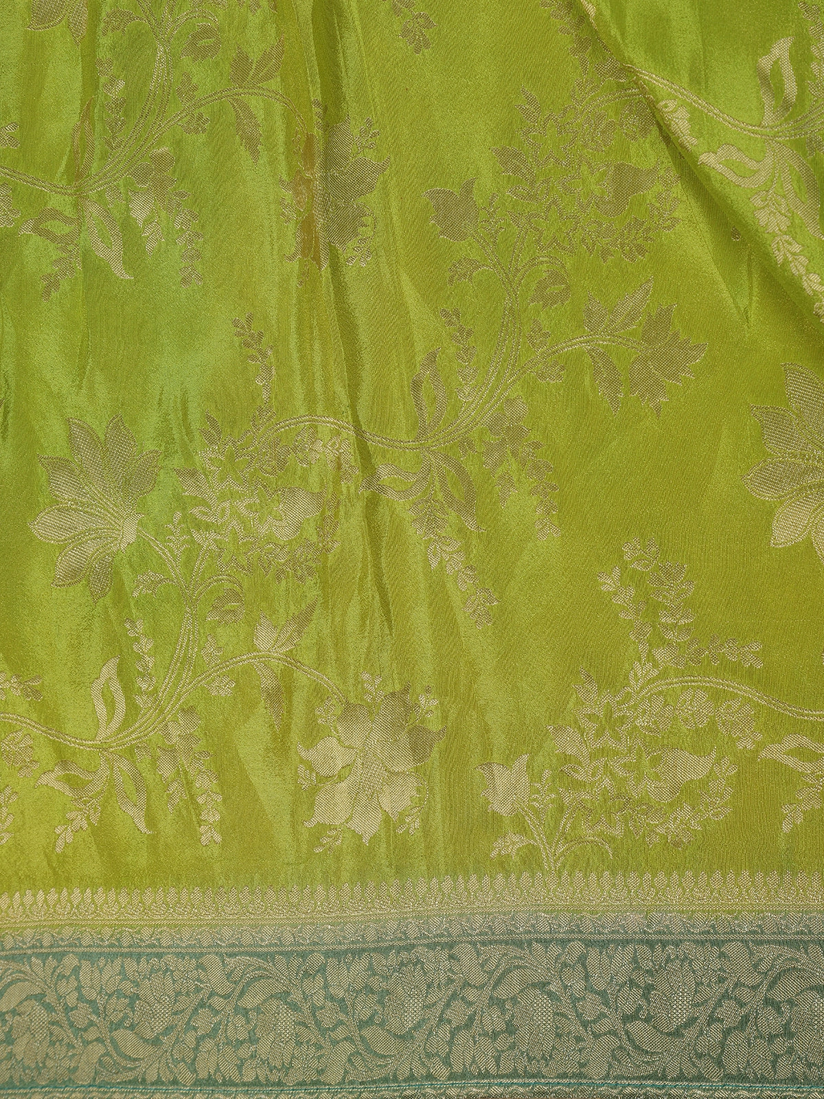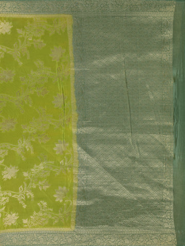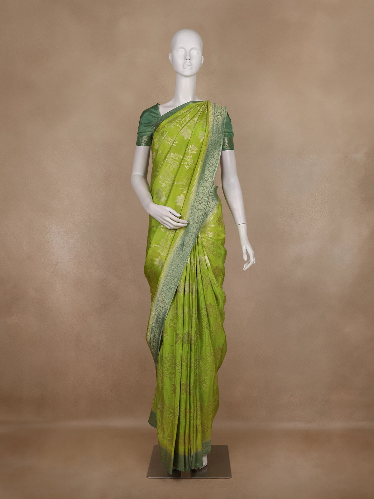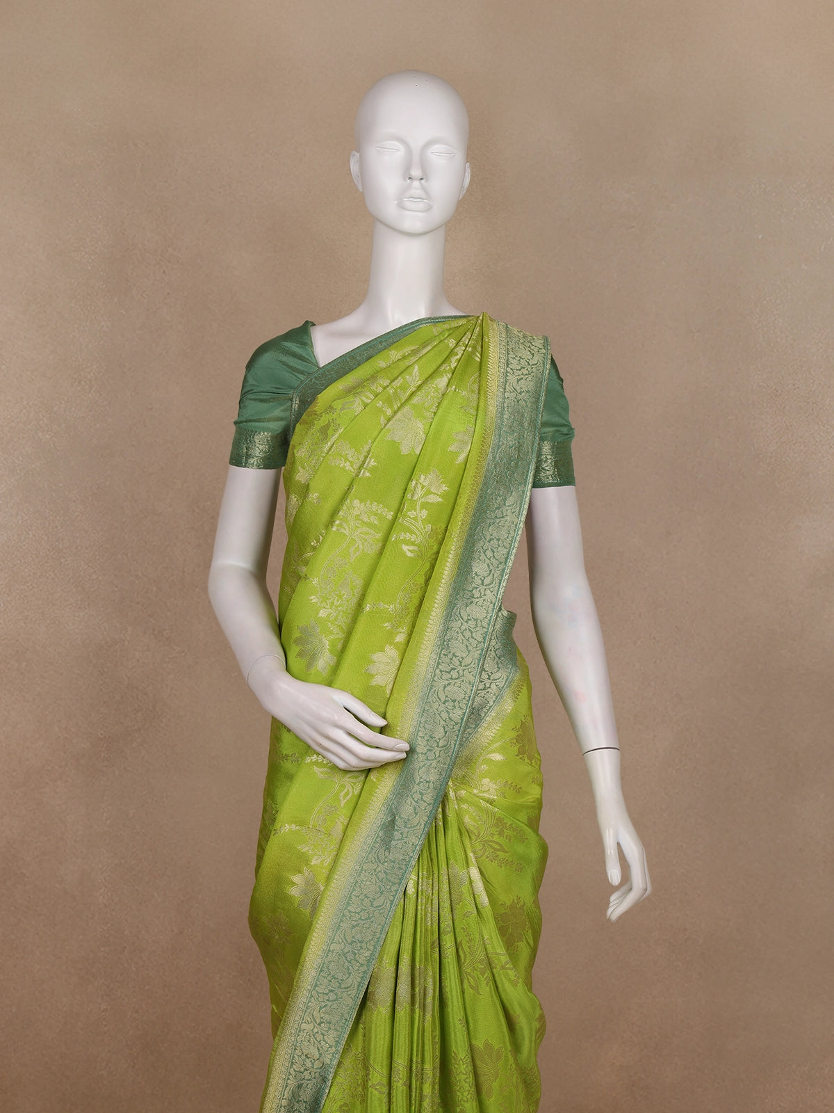 Parrot Green Floral Design Semi Banarasi Saree with Contrast Mint Green Border