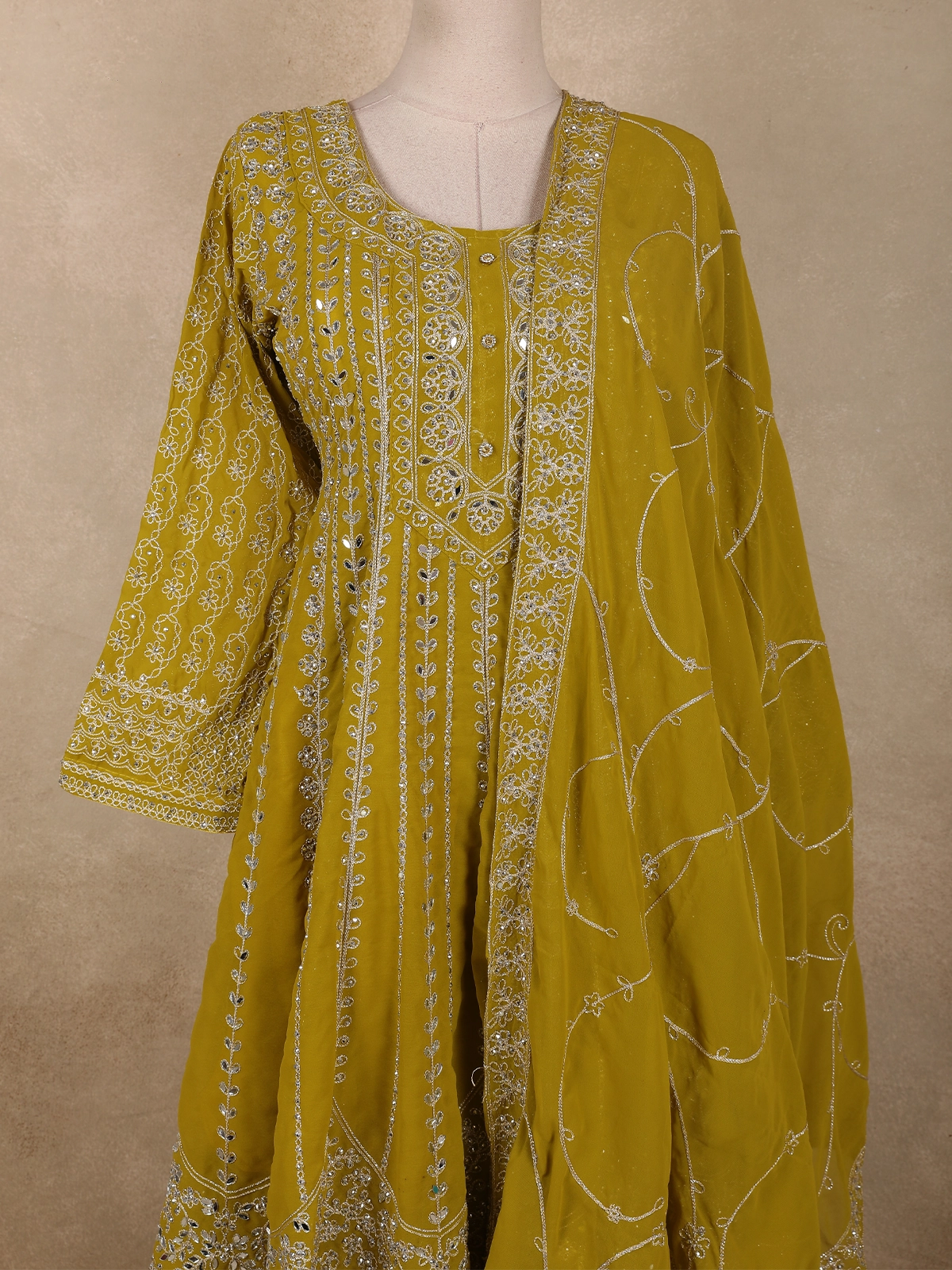 The design features graceful vertical embroidered patterns that enhance the silhouette, while the neckline is highlighted with detailed embroidery and delicate embellishments, adding a refined focal point. The sleeves are equally elegant, finished with coordinated floral motifs and fine borders that elevate the overall look.