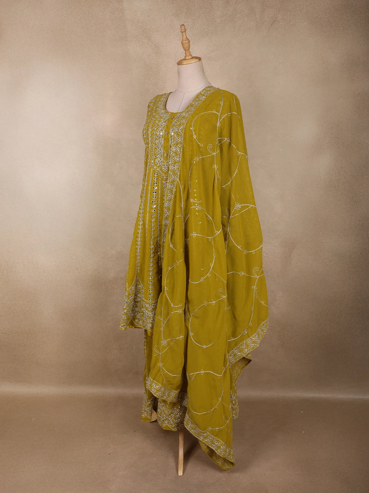 Paired with flowy palazzo pants, this ensemble offers effortless comfort and a flattering drape, making it ideal for long celebrations. The look is completed with a matching georgette dupatta, subtly embellished to complement the suit without overpowering it.