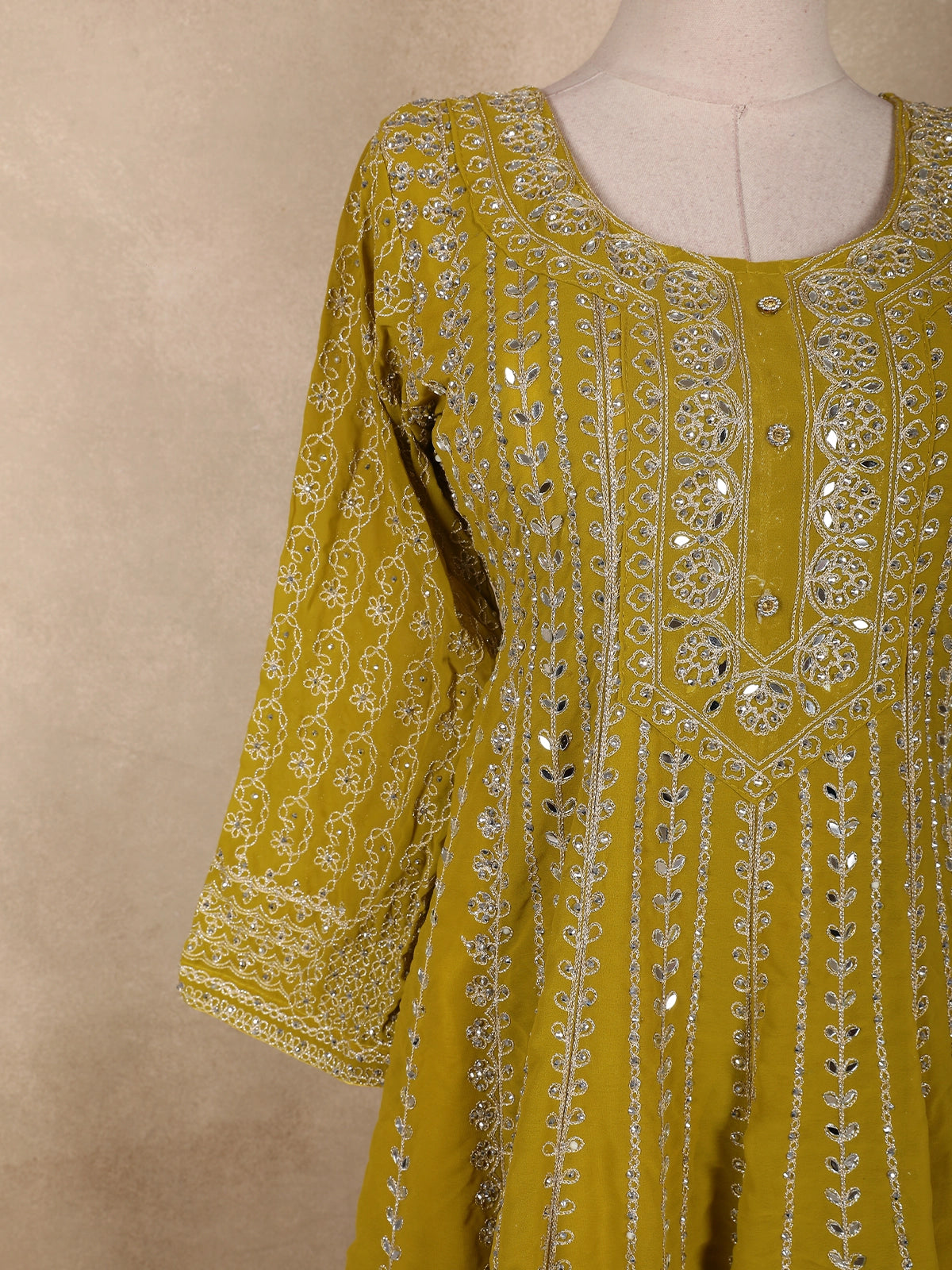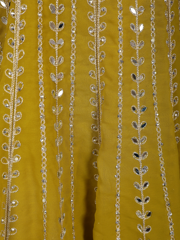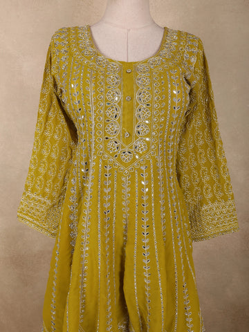Bright and refreshing in a vibrant Parrot Green hue, this elegant georgette palazzo suit is a perfect blend of traditional artistry and contemporary grace. The kurta is beautifully adorned with intricate floral embroidery, crafted using fine thread work and shimmering sequins, creating a rich texture with a subtle festive sparkle.