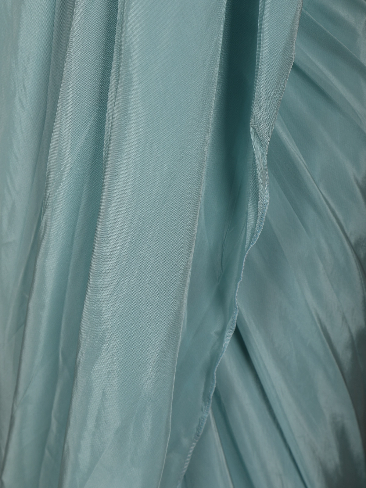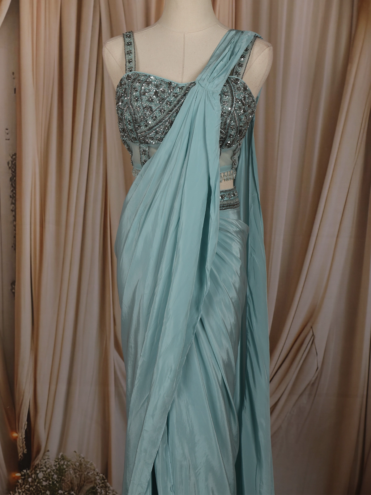 The drape is crafted in a smooth satin-crepe blend fabric, offering a fluid fall and elegant movement. Its soft pastel tone adds a refreshing charm, perfect for evening occasions and celebrations.