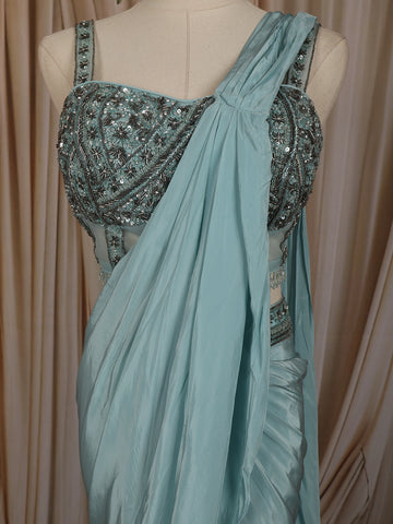 Pastel Aqua Blue Solid Design Ready To Wear Saree with Sequins Embroidered Blouse