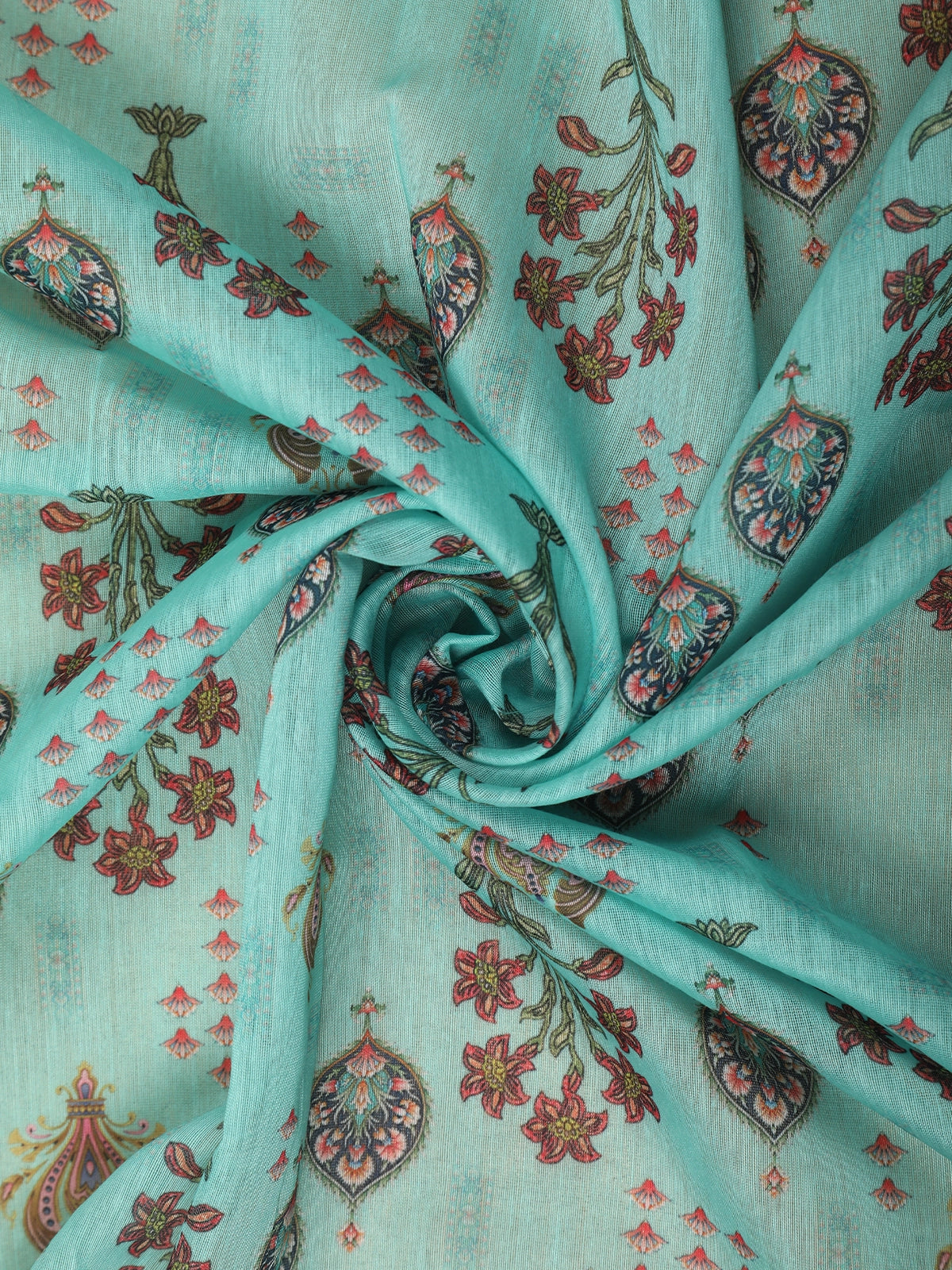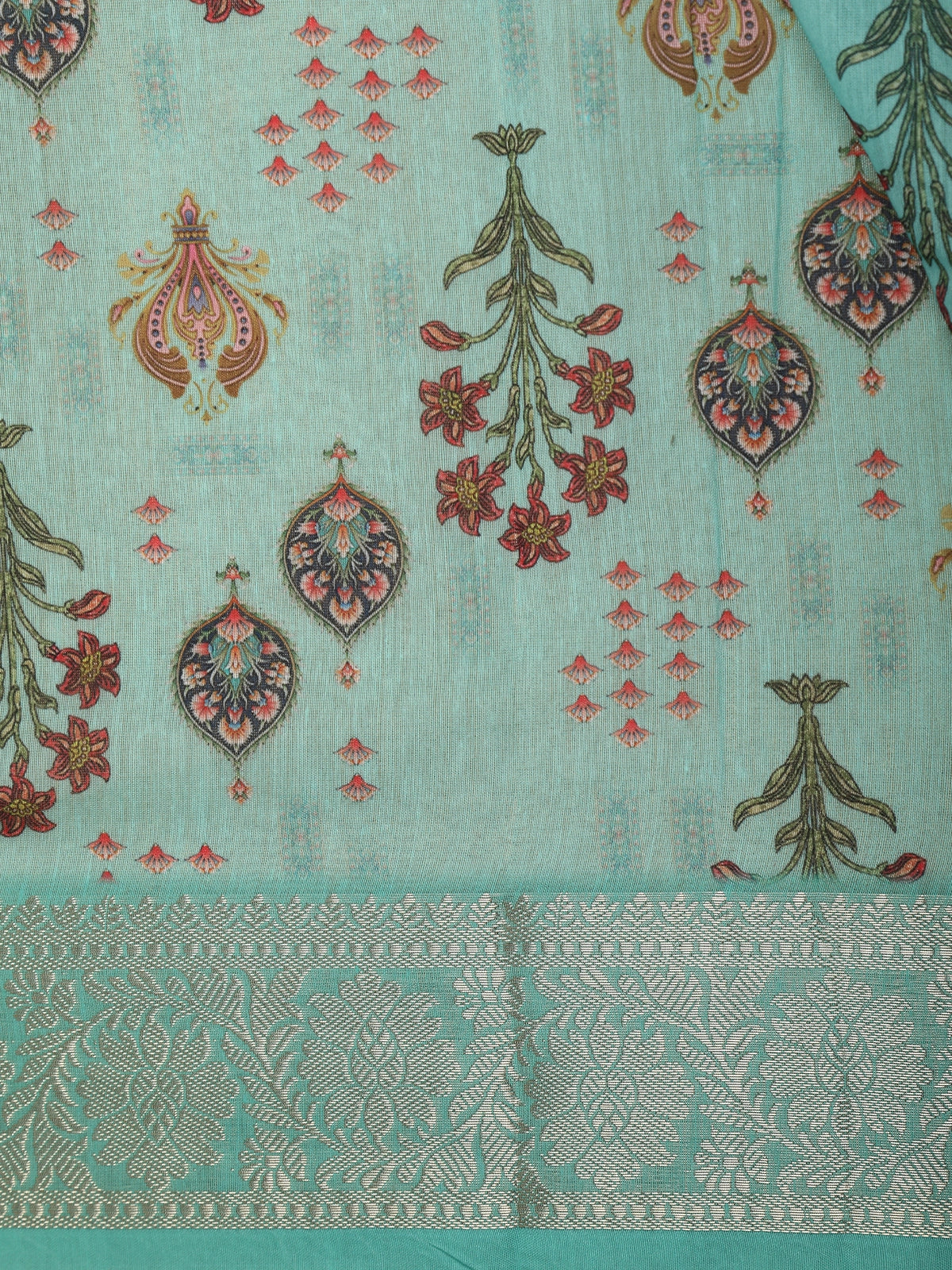 This Pastel Aqua Blue Floral Design Art Silk Designer Saree is a refreshing blend of soft hues and intricate artistry. The soothing pastel aqua blue base is beautifully adorned with delicate floral and paisley-inspired motifs, rendered in harmonious shades of coral, olive, muted gold, and subtle pink, creating a graceful all-over pattern.