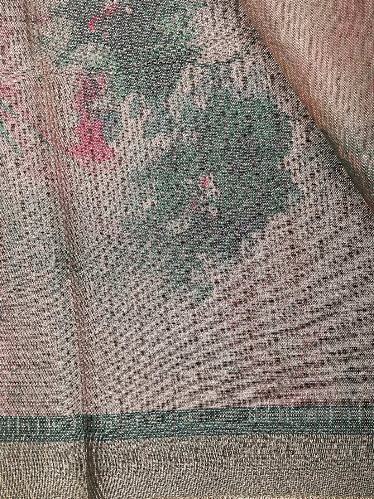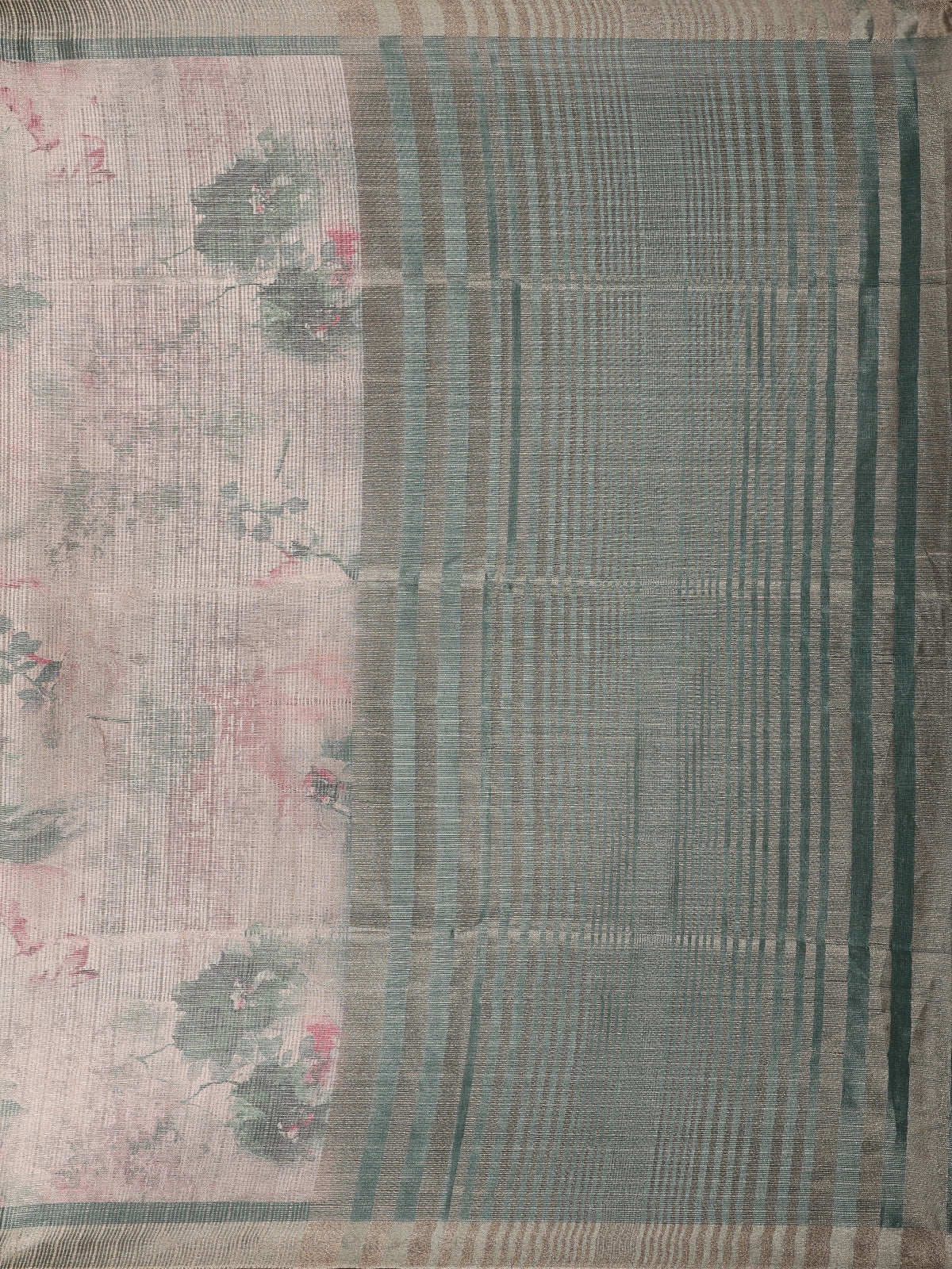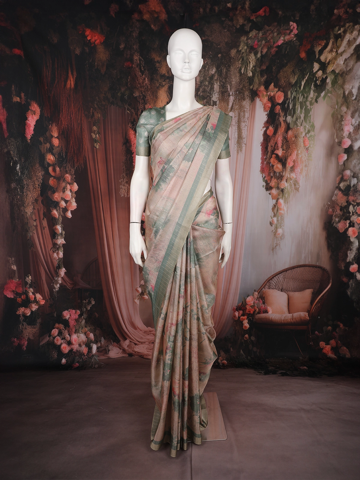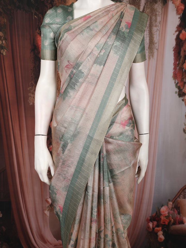 Step into subtle sophistication with this Pastel Beige Floral Printed Tissue Saree. Featuring a delicate watercolor floral pattern in muted tones, the saree beautifully balances elegance and grace. The tissue fabric offers a refined sheen and a lightweight drape, making it comfortable yet statement-worthy.