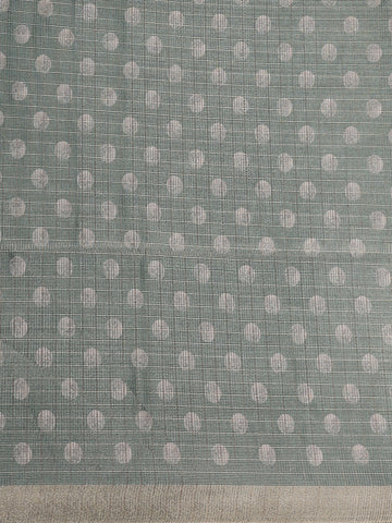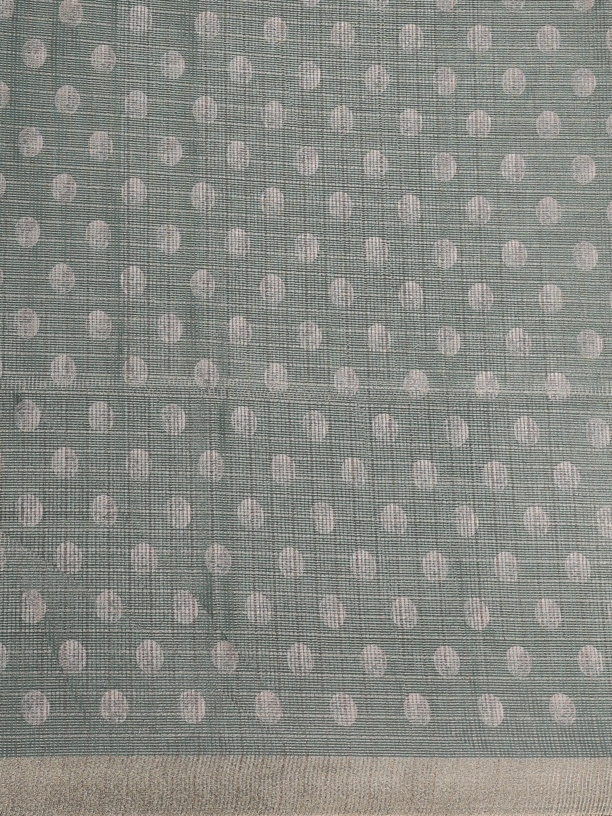 The saree is complemented with a woven sage green border that adds structure, while the pallu features a coordinated striped weave for an elevated finish. The matching blouse comes in a stylish polka dot woven design, adding a lively and tasteful contrast to the overall look.