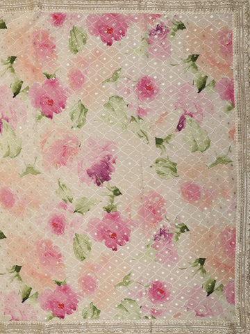 The body of the saree is adorned with watercolour-inspired floral prints in soothing pastel shades of pink, peach, and soft green, creating a romantic and refreshing visual appeal. A subtle all-over diamond lattice pattern is highlighted with delicate sequins, adding a gentle shimmer that catches the light beautifully without overpowering the softness of the design.