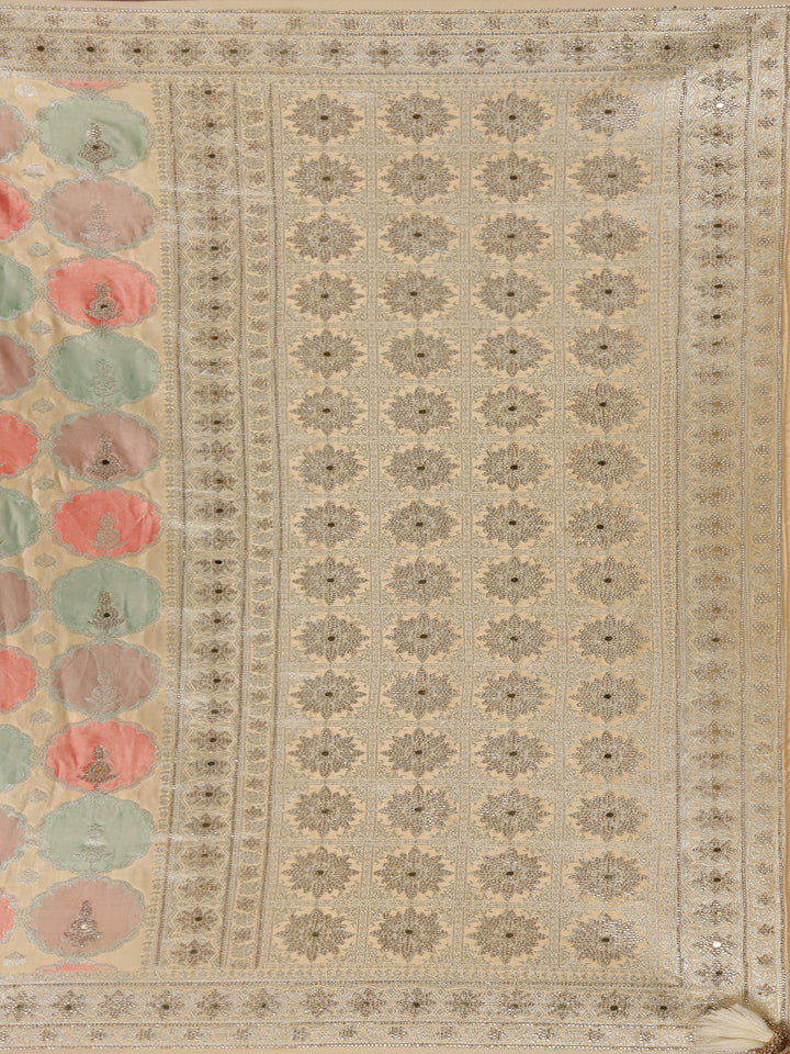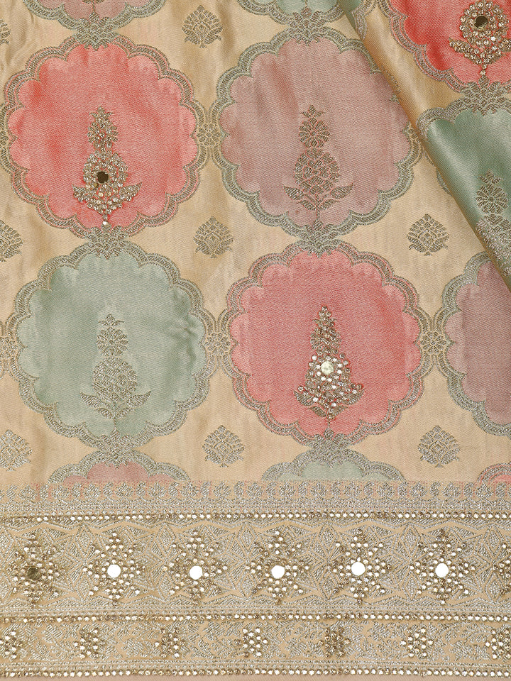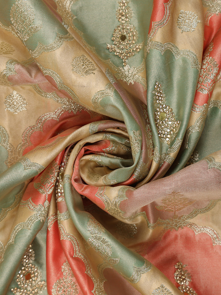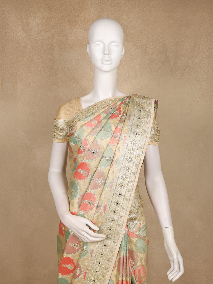 Pastel Green and Peach Floral Woven Design Banarasi Saree with Designer Zari Border