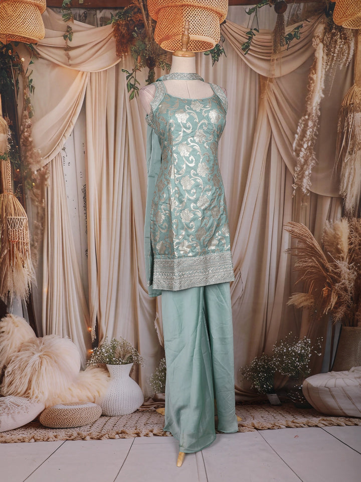 Grace your festive wardrobe with this exquisite Pastel Green Floral Design Silk Palazzo Suit, a perfect harmony of elegance and sophistication. The outfit’s soft, luminous tone and detailed craftsmanship make it a standout piece for any occasion.