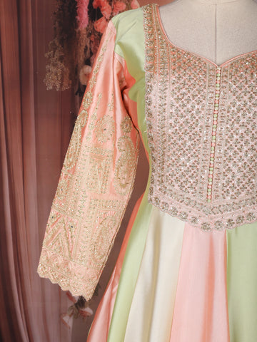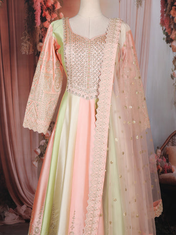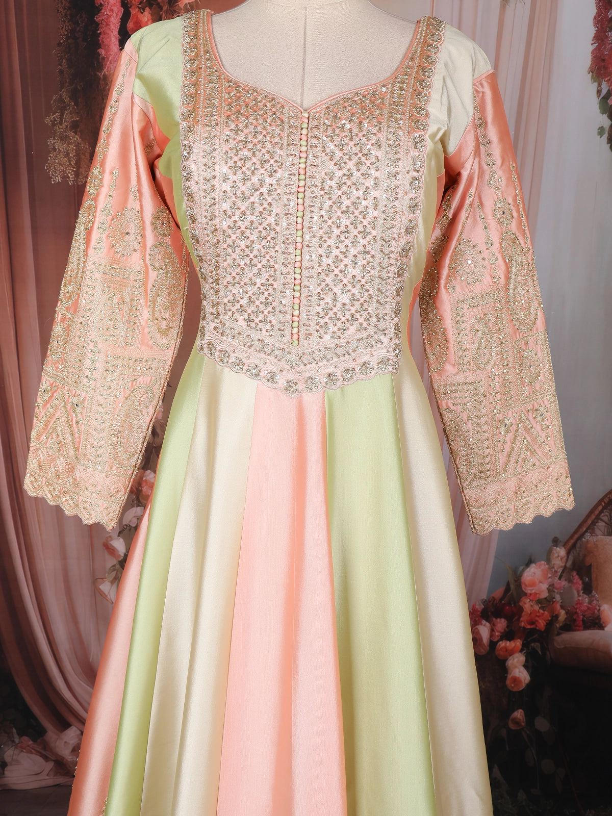 Make a graceful statement in this elegant Pastel Peach and Pista Green Satin Anarkali Gown, crafted to reflect timeless beauty with a modern flair. The dual-tone satin panels create a luxurious flare, adding movement and charm to every step you take.