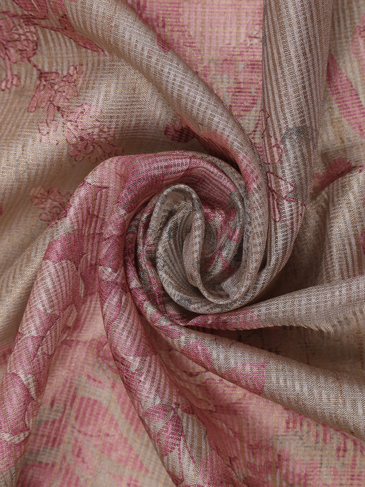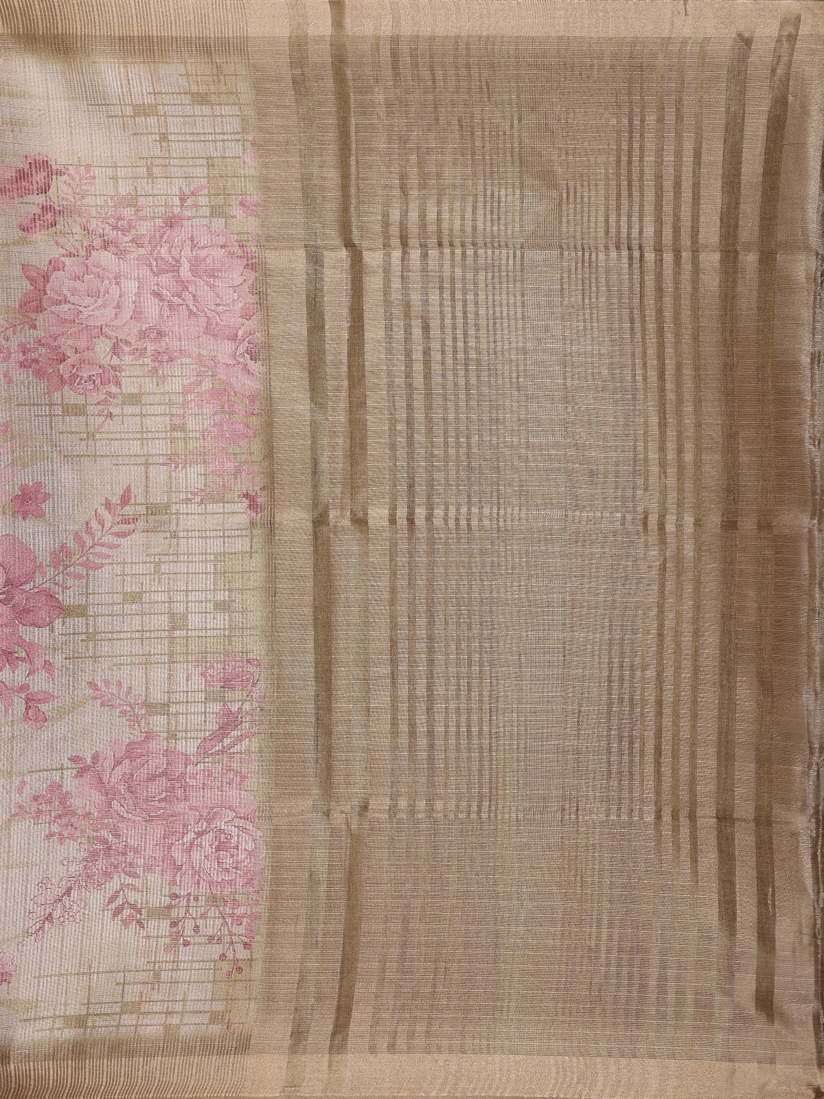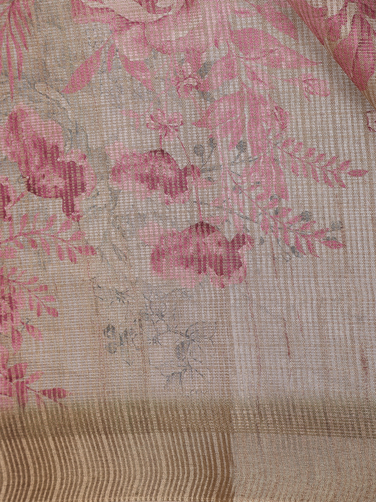 Embrace the epitome of elegance with this Pastel Pink Floral Design Tissue Silk Saree, a perfect blend of soft femininity and timeless luxury. Crafted from exquisite tissue silk, this saree showcases a champagne beige base that shimmers delicately under light, enhanced by romantic pastel pink floral motifs that exude grace and sophistication.